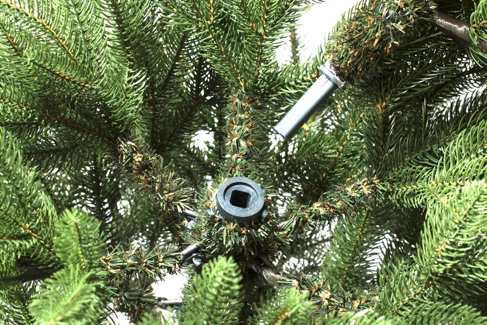 Конструкция елки ствольная, что делает ее устойчивой и надежной. Металлическая подставка обеспечивает дополнительную прочность и безопасность.
