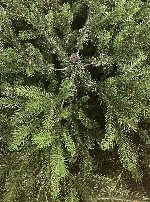 Елка имеет три яруса и 812 ветвей, что придает ей пышный и объемный вид. Ветви крепятся на шарнирах, что обеспечивает удобство при сборке и разборке елки. Материал хвои - 100% литая ПЭ, которая на ощупь неотличима от натуральной.