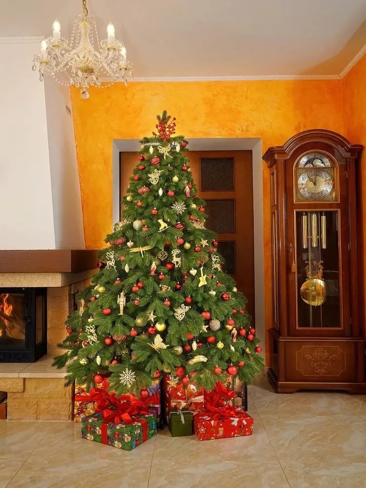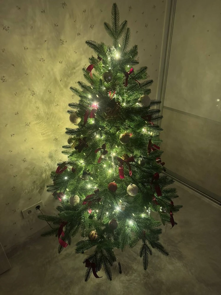 Елка имеет высоту 150 см и диаметр основания 94 см, что делает ее достаточно заметной и в то же время компактной. Конструкция ствольная, что обеспечивает устойчивость и надежность.