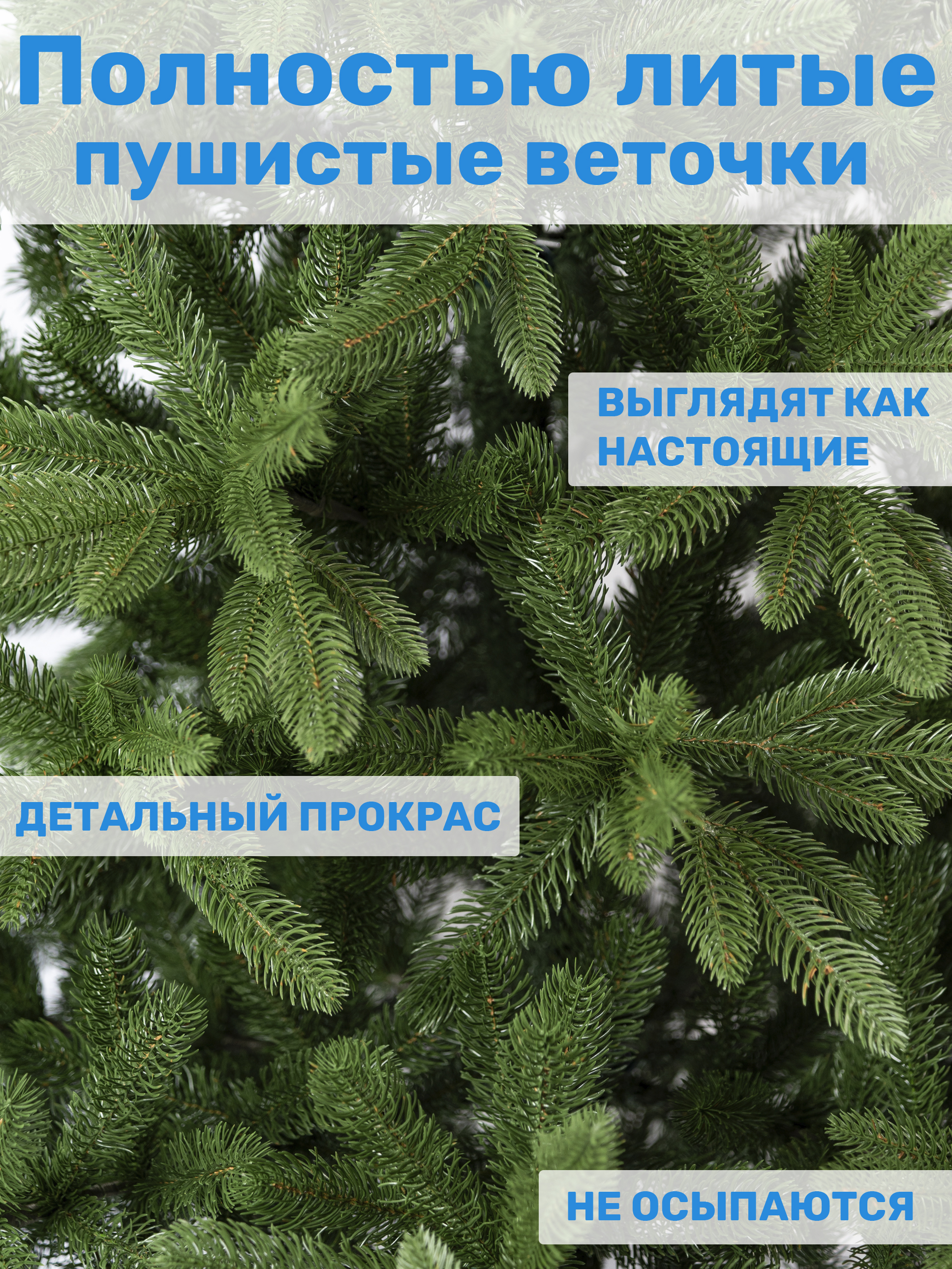 Материал хвои - литая ПЭ, что гарантирует долгий срок службы и сохранение внешнего вида елки. Цвет хвои - зеленый, что создает атмосферу настоящего леса.