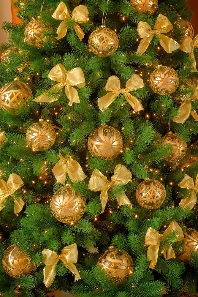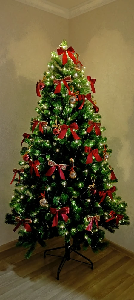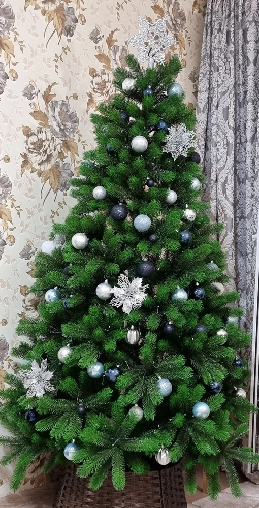 Высота елки составляет 180 см, а диаметр нижнего яруса - 110 см. Количество ветвей - 1061 шт.
