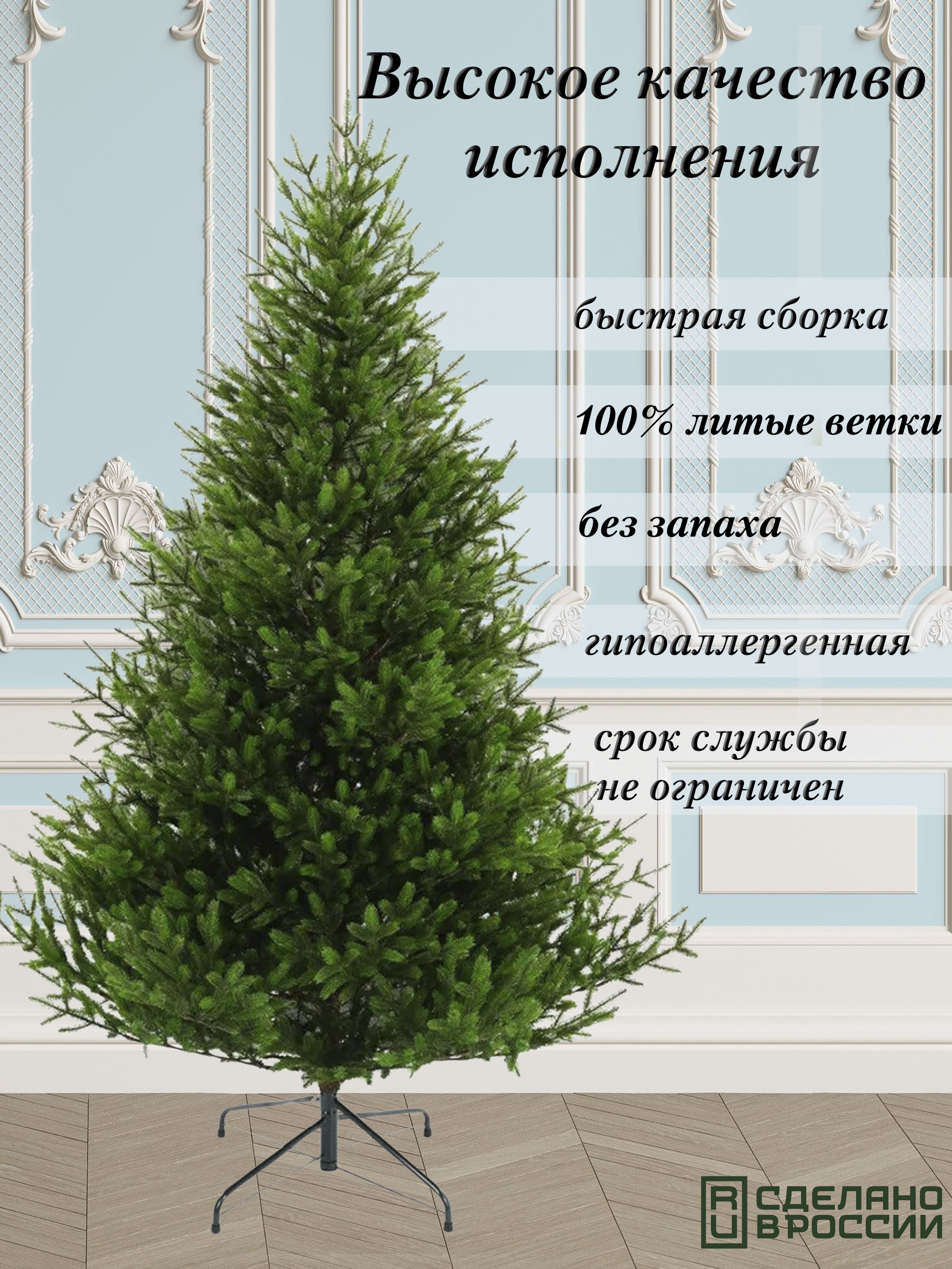 Ель оснащена 1158 ветками, которые крепятся на шарнирах, что позволяет легко и быстро собирать и разбирать ель. Конструкция ствольная, что придает ей устойчивость и надежность.