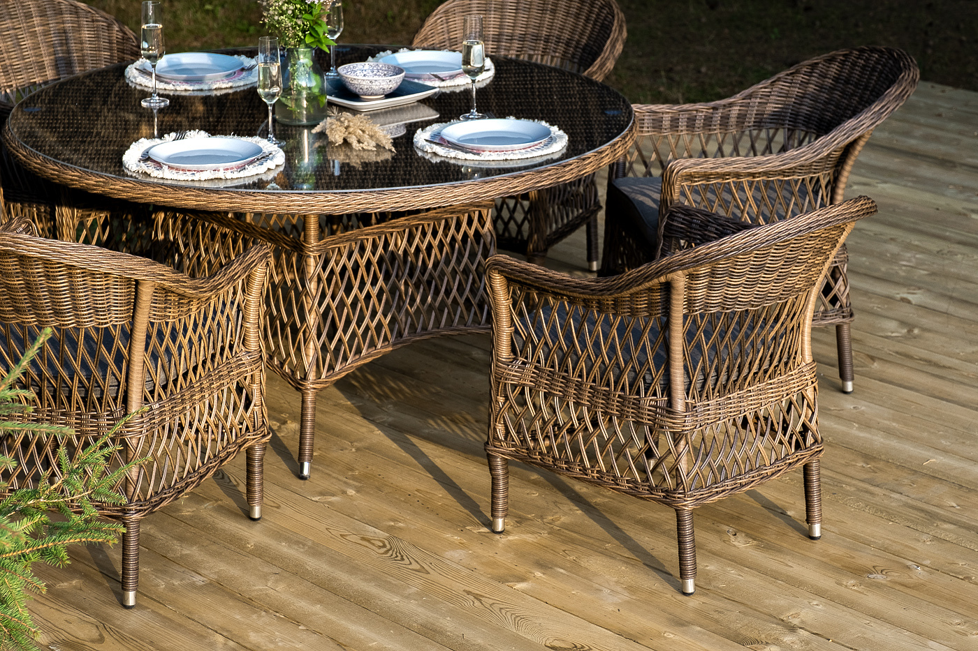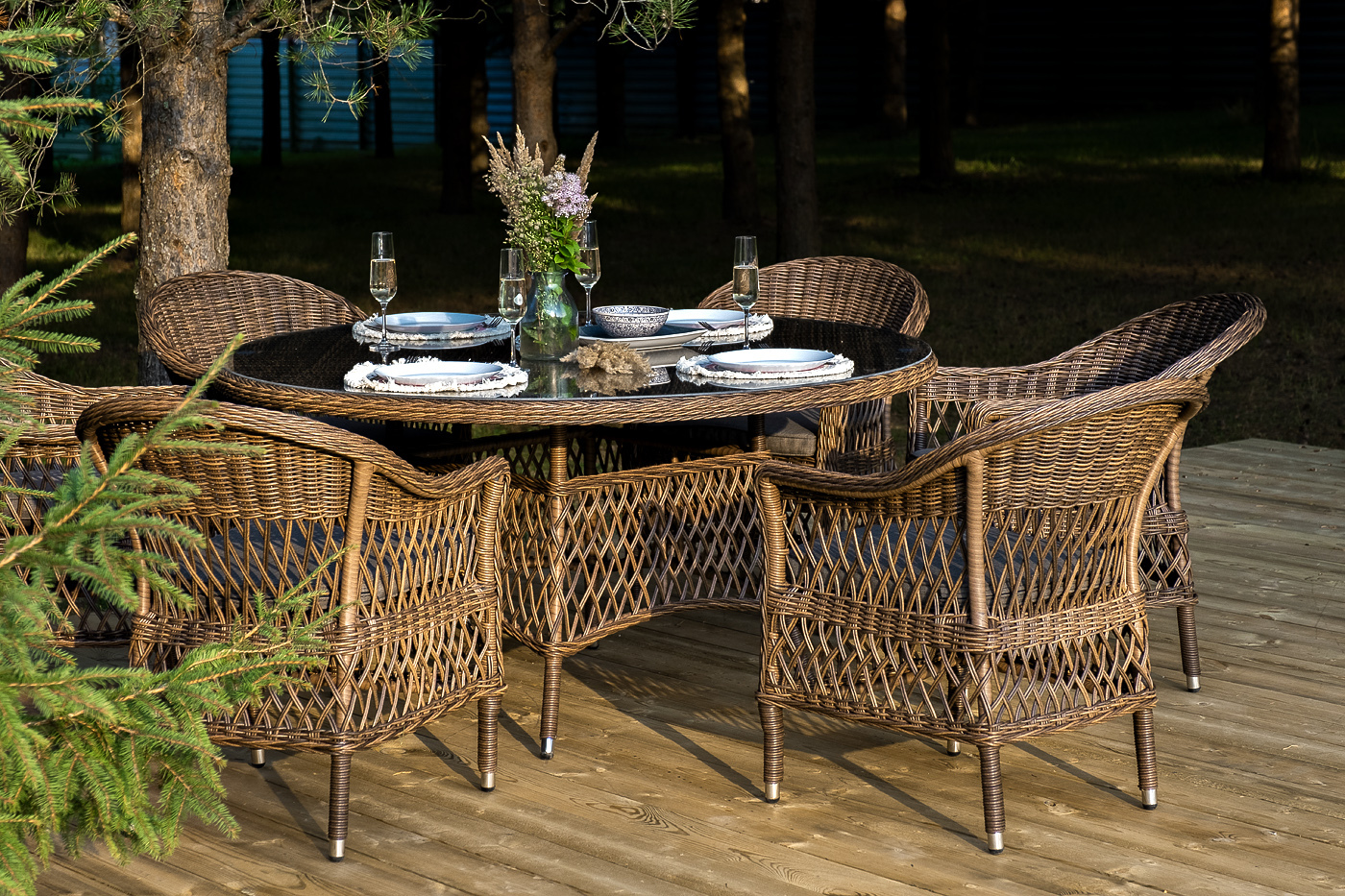 Вся мебель изготовлена из долговечного и легкого алюминия, обтянутого синтетическим ротангом. На столе для удобства эксплуатации предусмотрена столешница из ударопрочного закаленного стекла 5 мм. Стулья укомплектованы подушками на сидениях. "Эспрессо" плетеный круглый стол, диаметр 150 см, цвет коричневый 1шт. 1 500Х1 500Х750, "Сицилия" плетеный стул из искусственного ротанга, цвет коричневый 6шт. 590Х640Х820,