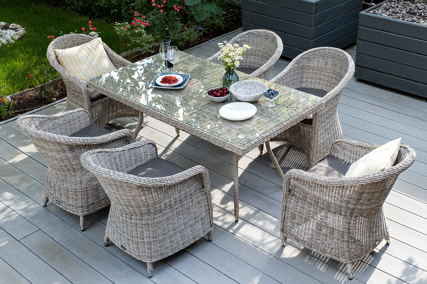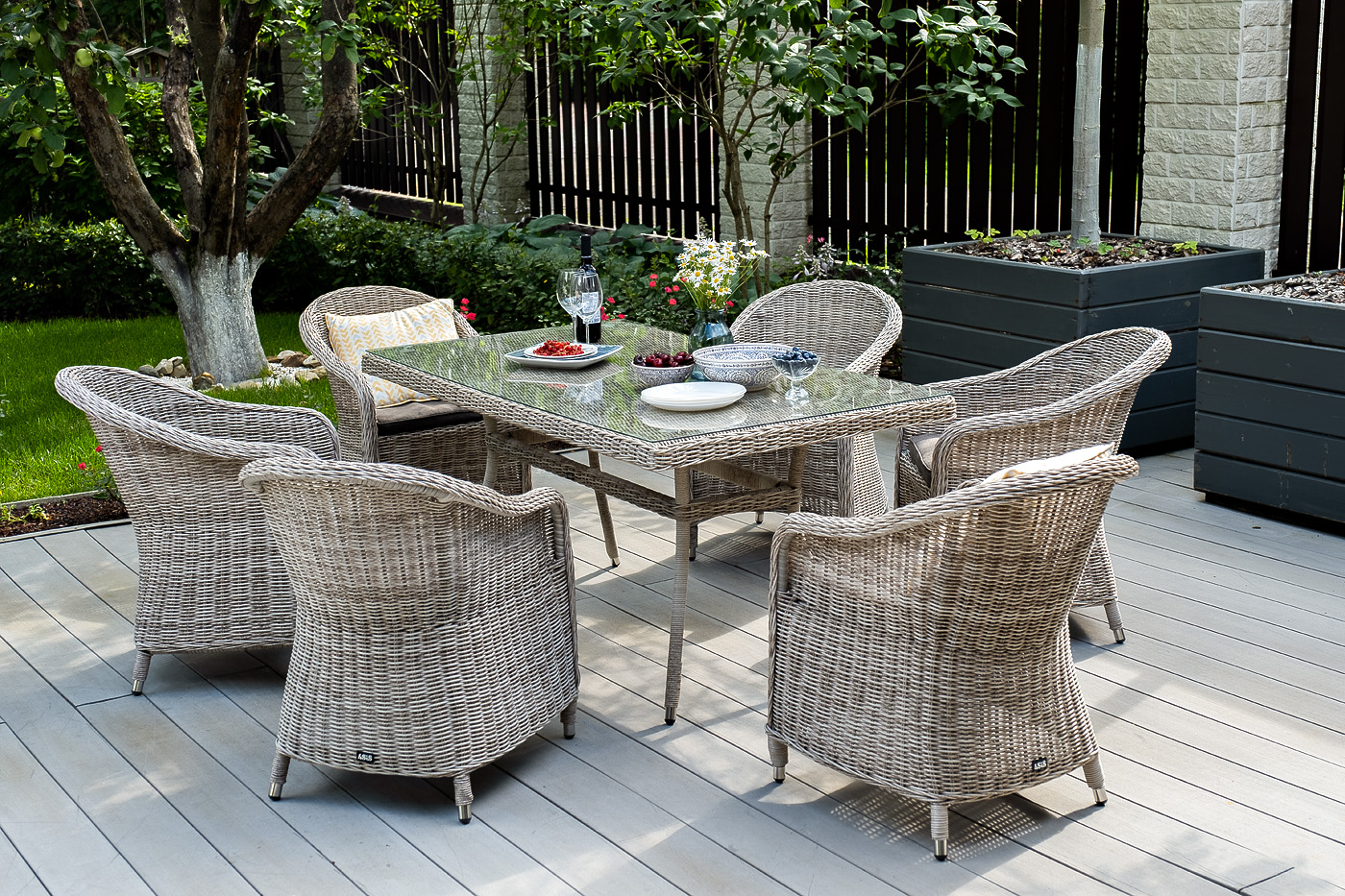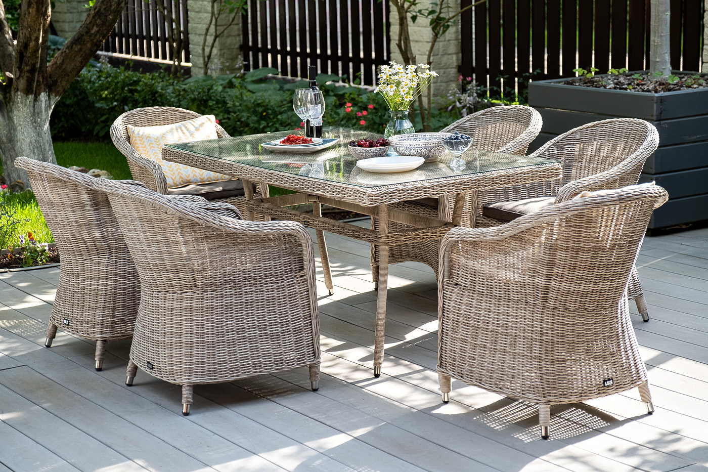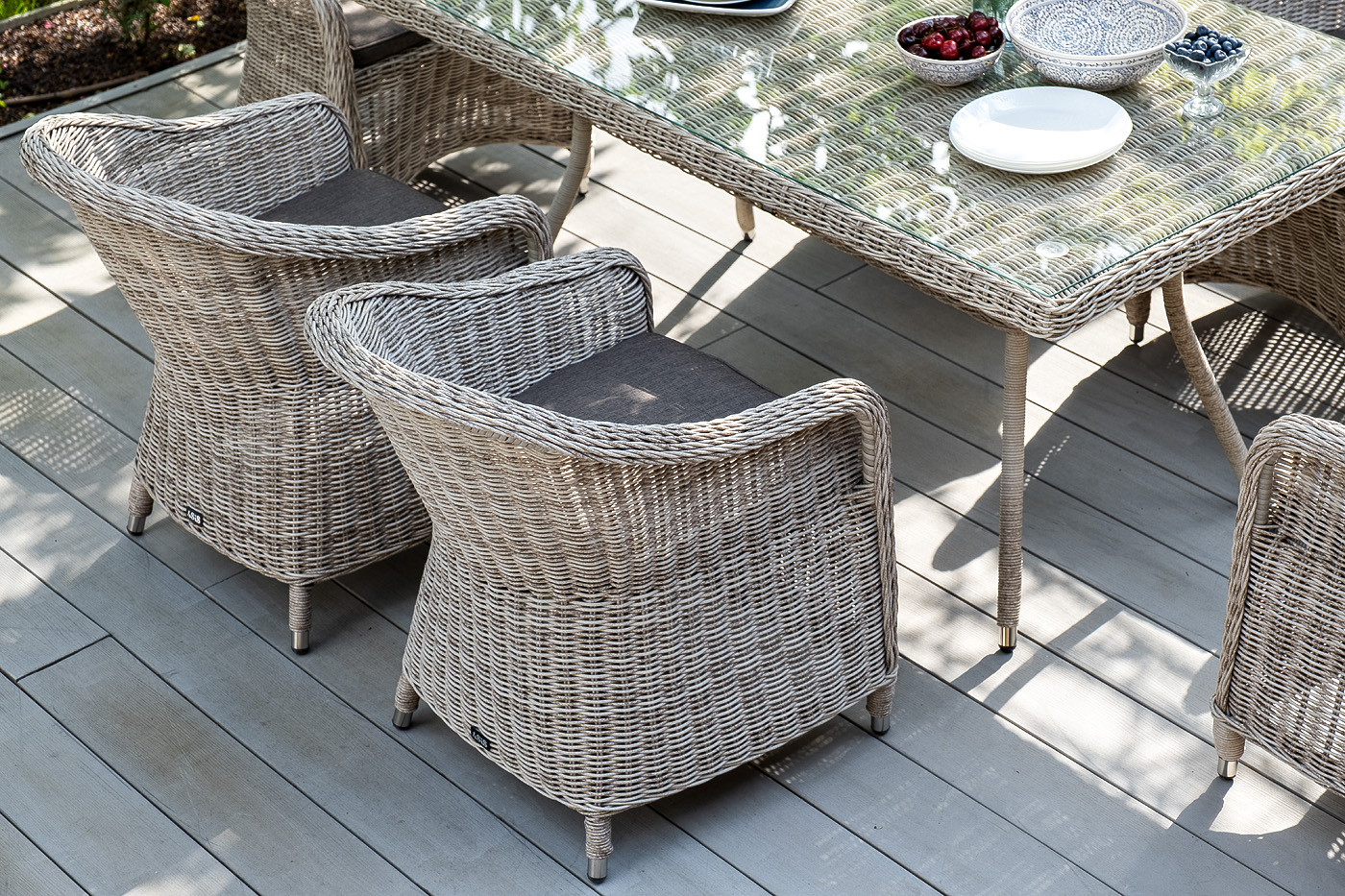 Каркас всех предметов мебели изготовлен из легкого и прочного алюминия, оплетенного вручную искусственным ротангом. Стол для удобства использования накрыт прочным стеклом, кресла укомплектованы подушками со съёмными чехлами серого цвета.