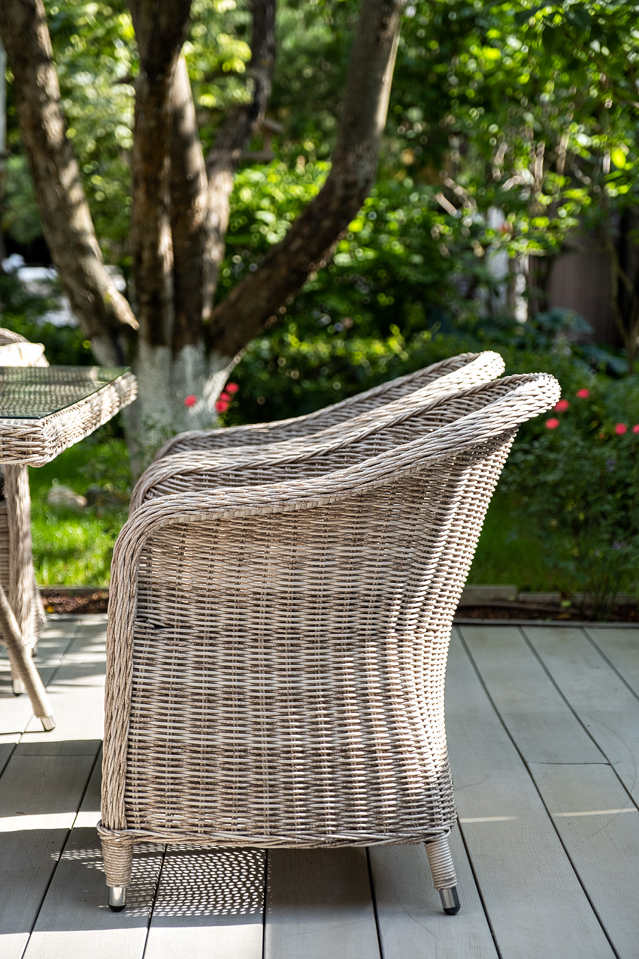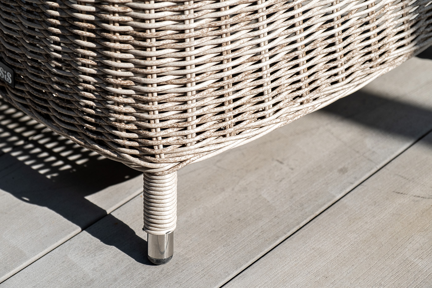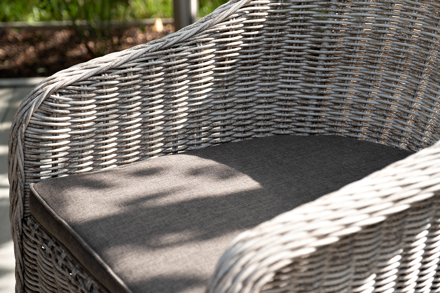 Каркас всех предметов мебели изготовлен из легкого и прочного алюминия, оплетенного вручную искусственным ротангом. Стол для удобства использования накрыт прочным стеклом, кресла укомплектованы подушками со съёмными чехлами серого цвета.