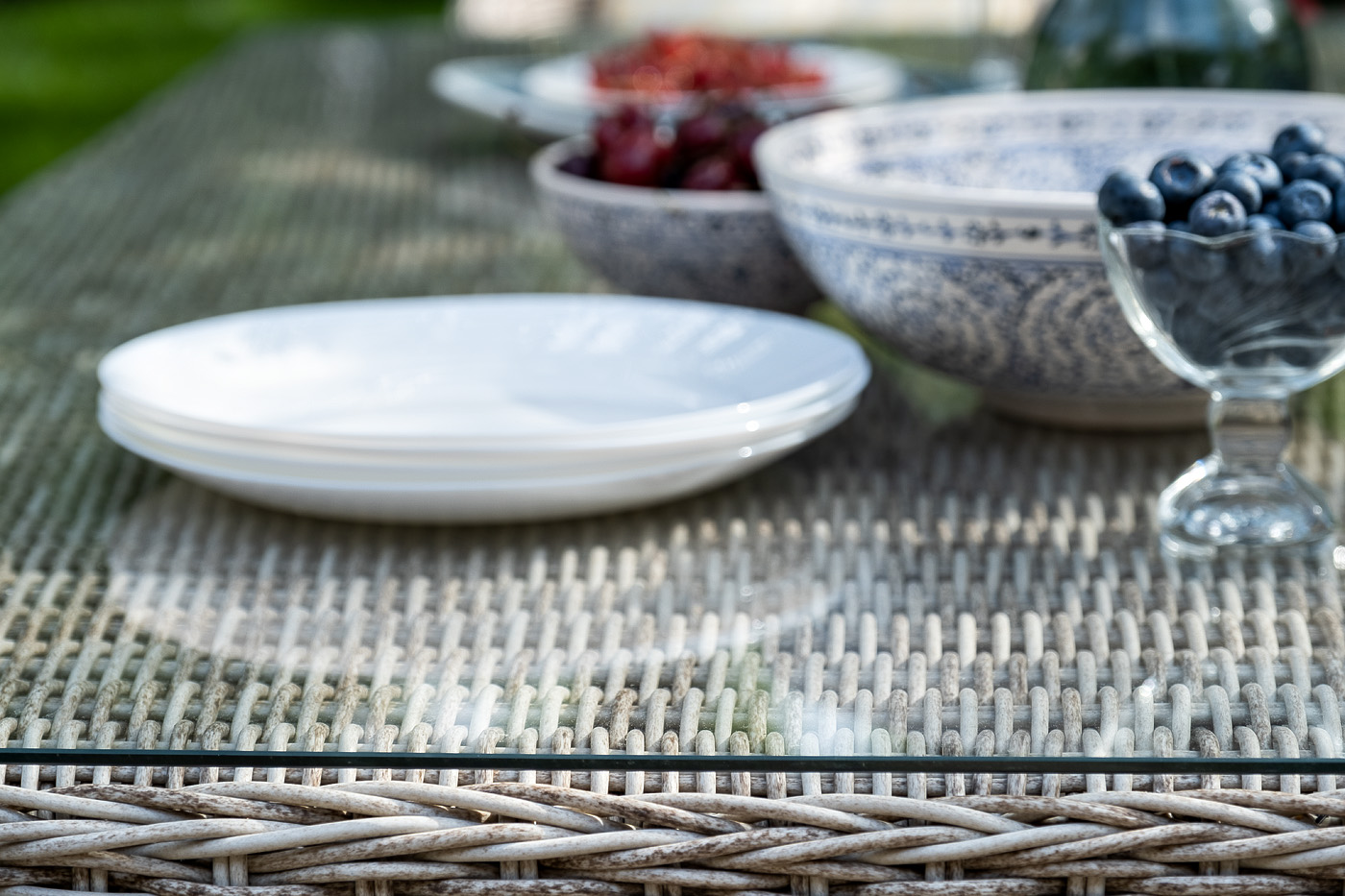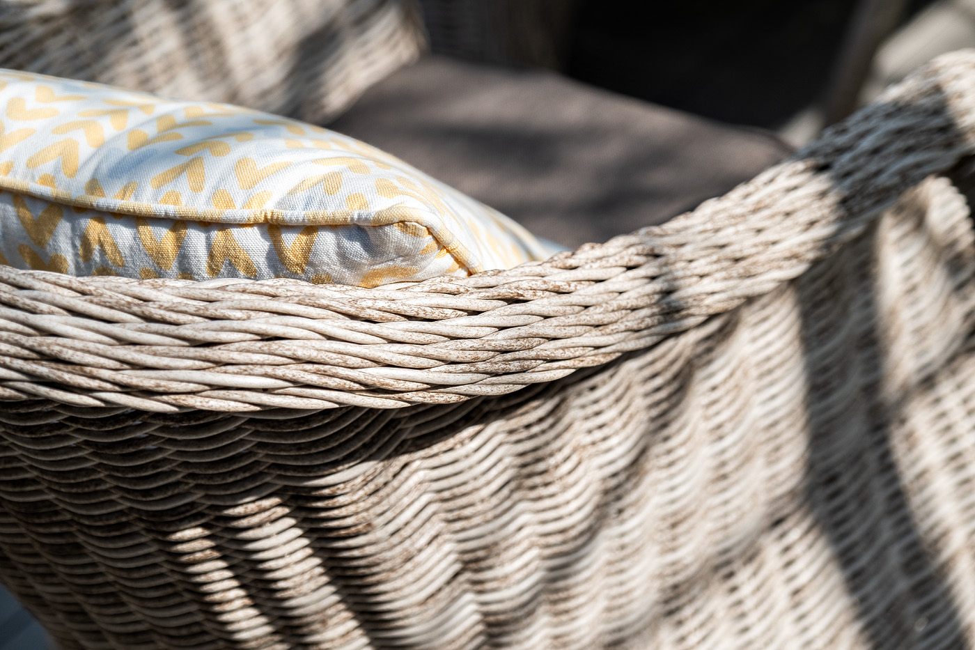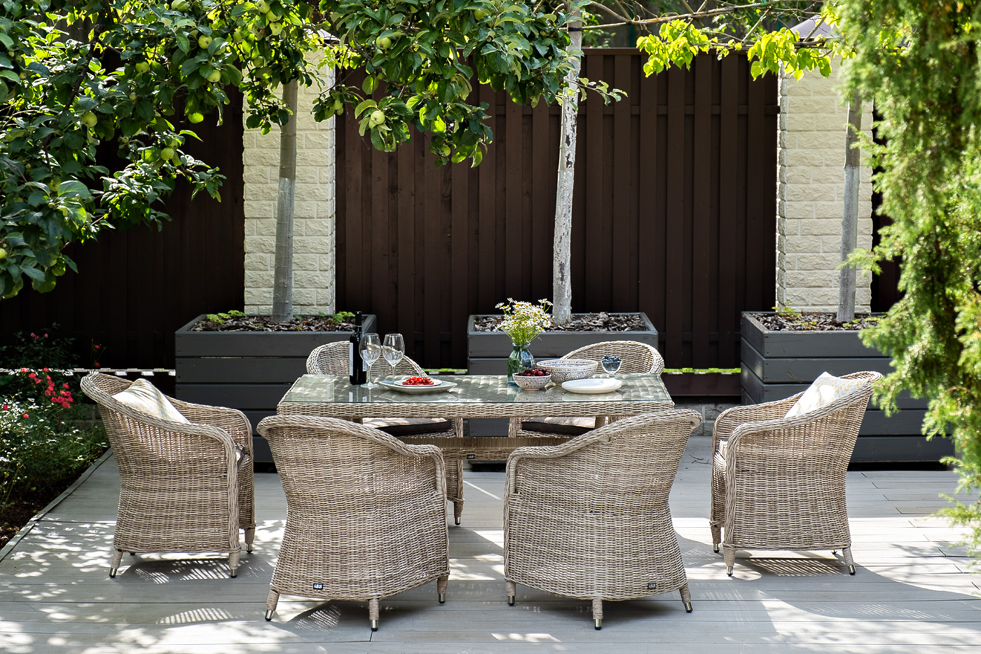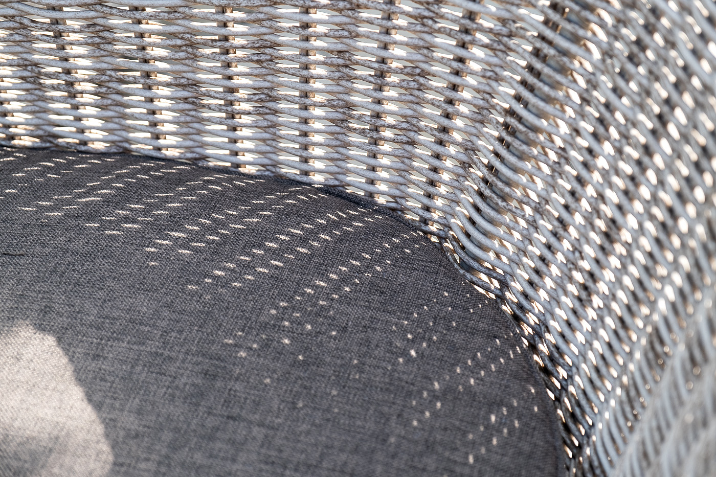 Каркас всех предметов мебели изготовлен из легкого и прочного алюминия, оплетенного вручную искусственным ротангом. Стол для удобства использования накрыт прочным стеклом, кресла укомплектованы подушками со съёмными чехлами серого цвета.