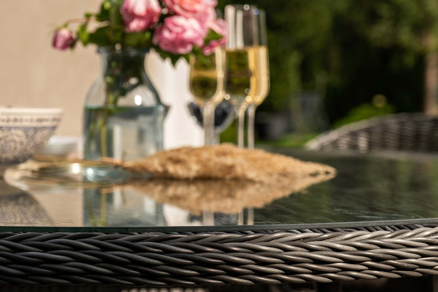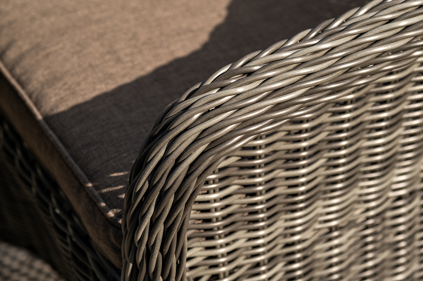 Вся мебель изготовлена из долговечного и легкого алюминия, обтянутого синтетическим ротангом. На столе для удобства эксплуатации предусмотрена столешница из ударопрочного закаленного стекла 5 мм. Стулья укомплектованы подушками на сидениях.