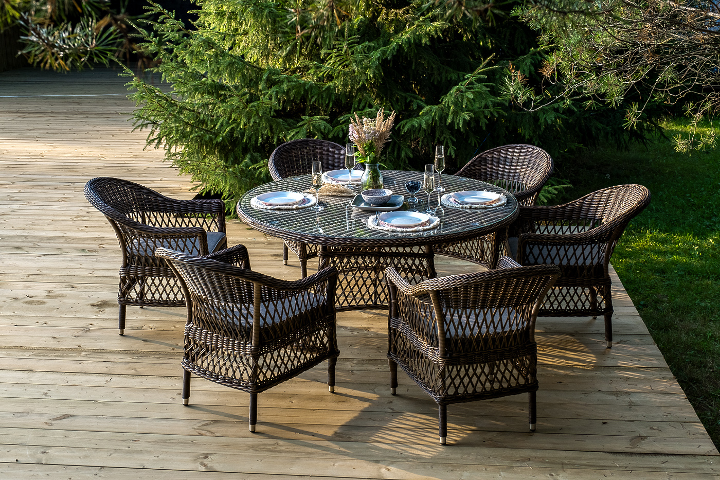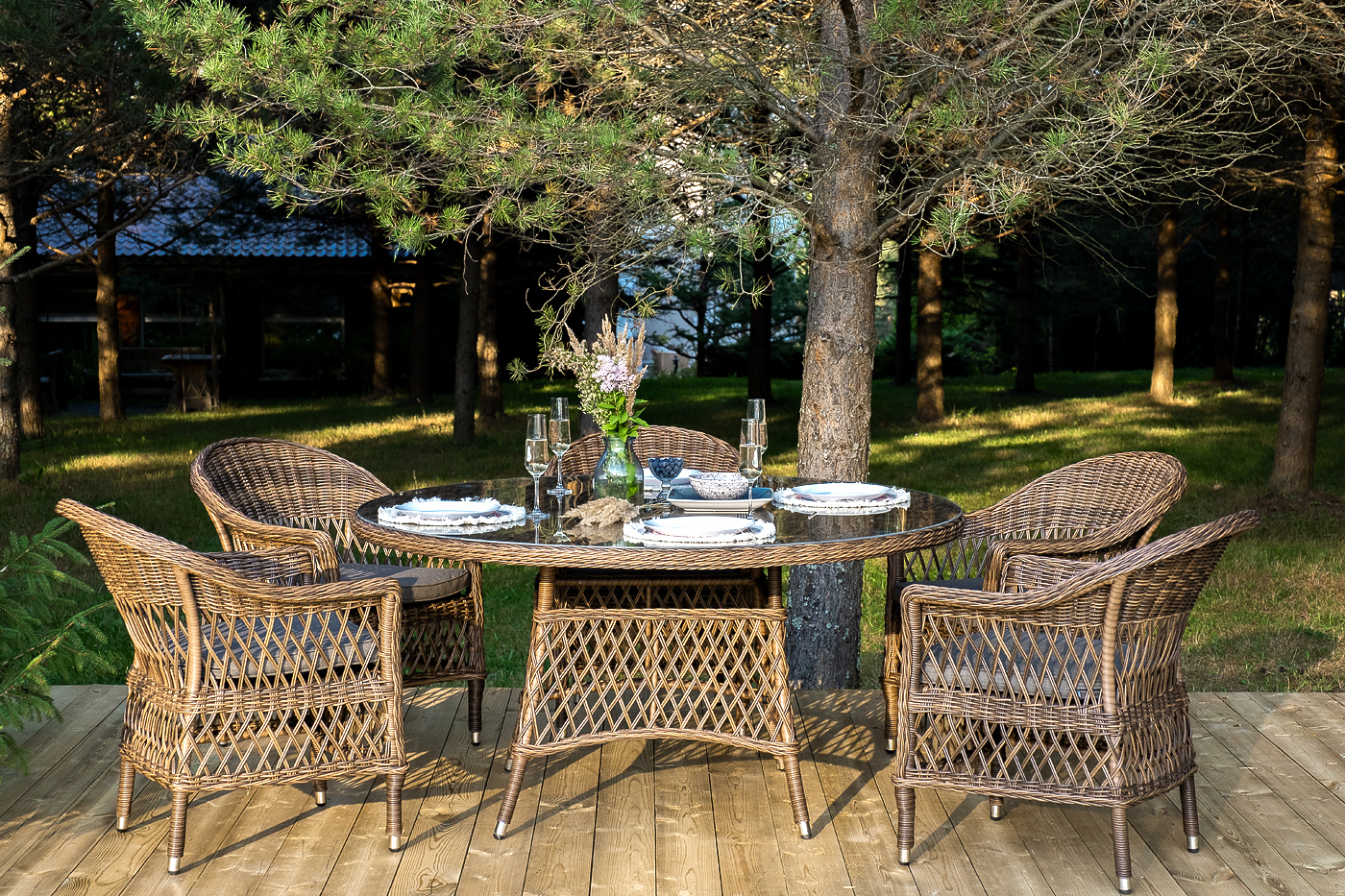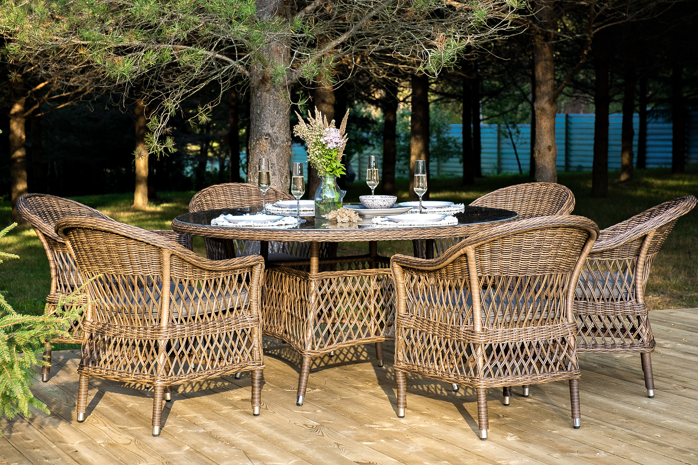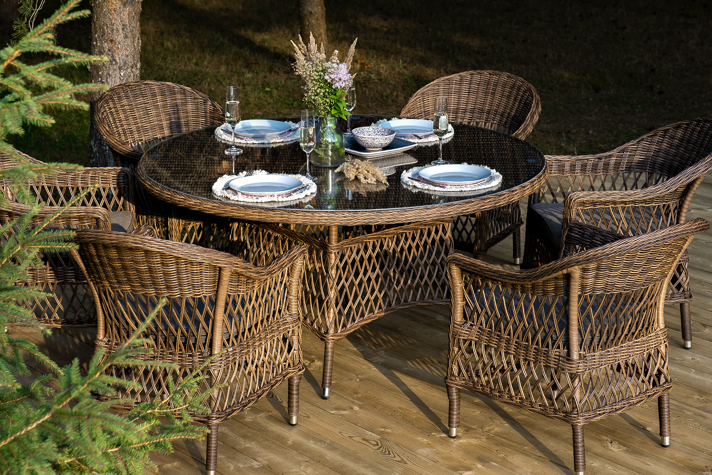 Высота сидения – 420 мм "Эспрессо" плетеный круглый стол, диаметр 150 см, цвет коричневый 1шт. 1 500Х1 500Х750, "Сицилия" плетеный стул из искусственного ротанга, цвет коричневый 6шт. 590Х640Х820,
