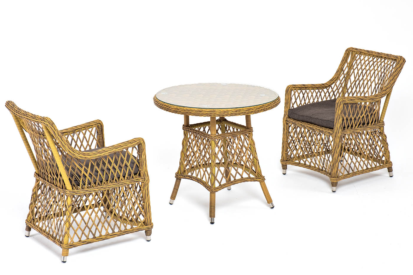 В плетеный комплект входит круглый стол «Эспрессо» диаметром 80 см с ударопрочной стеклянной столешницей и 2 кресла коллекции «Латте» 550×660×850 мм.