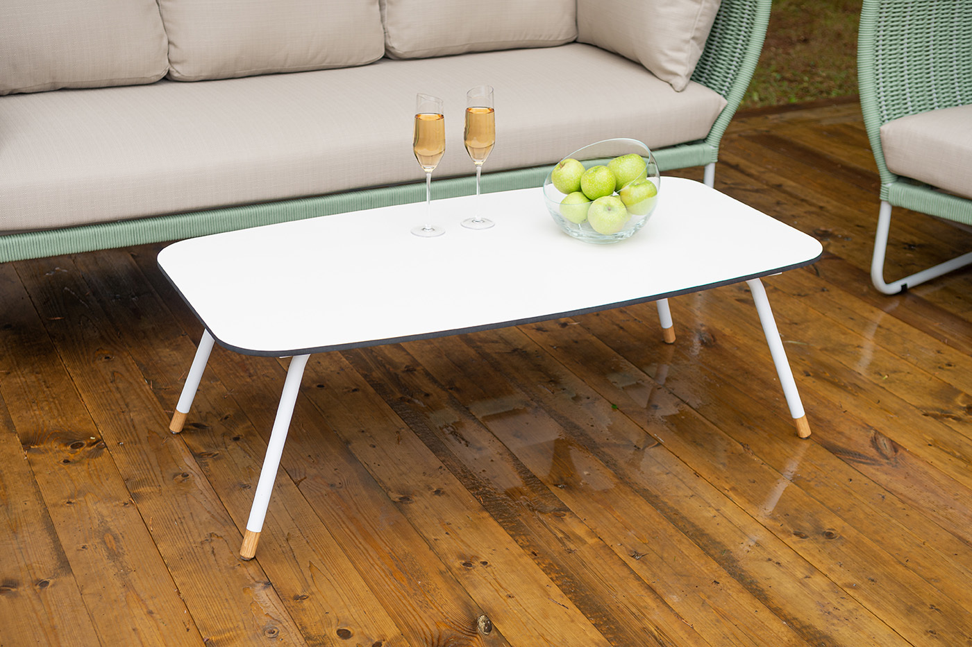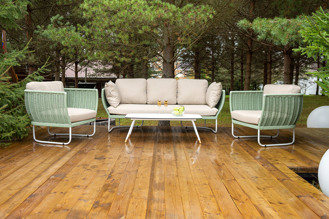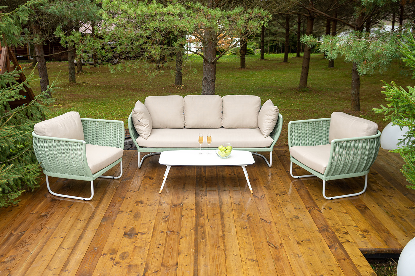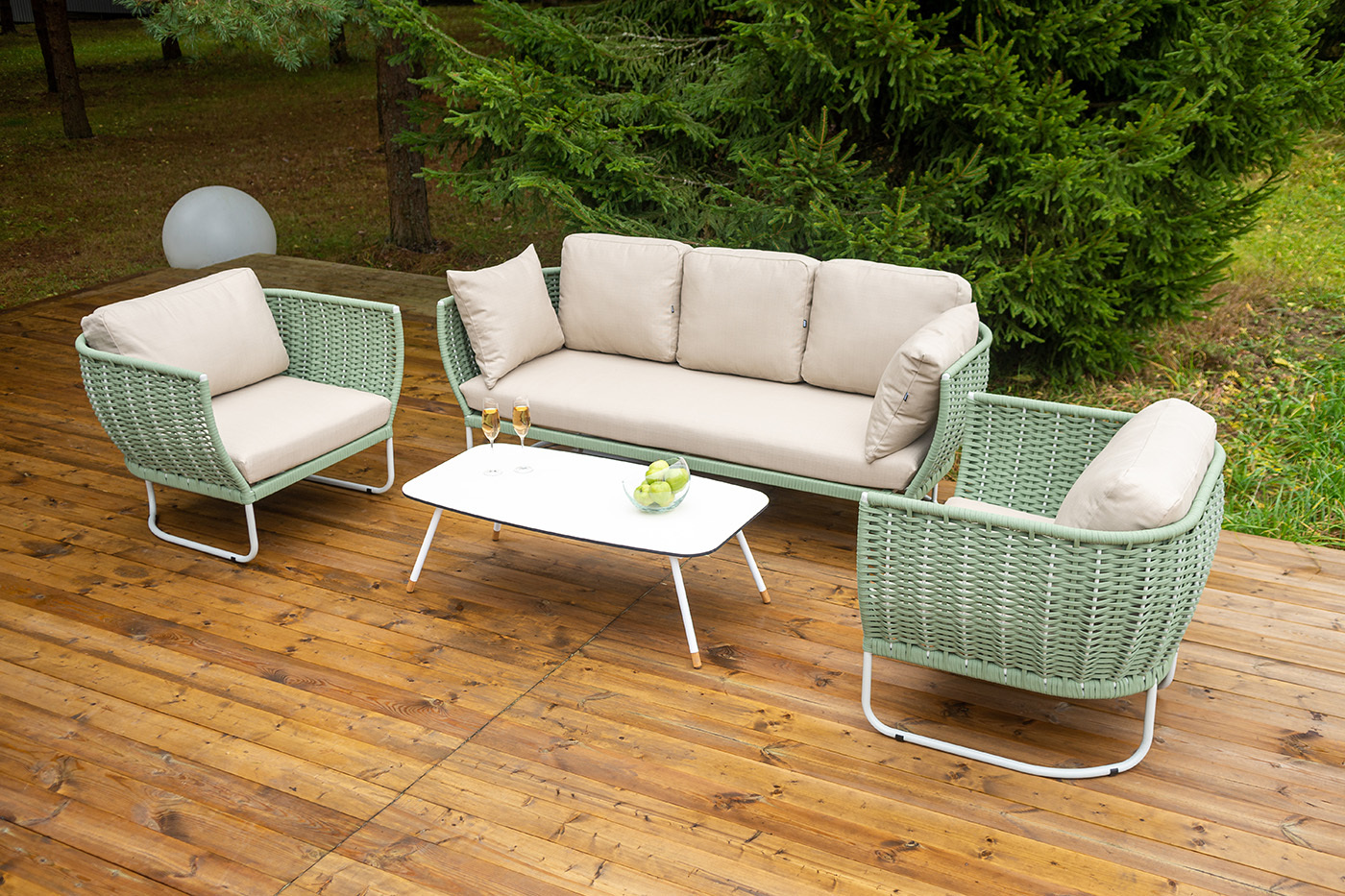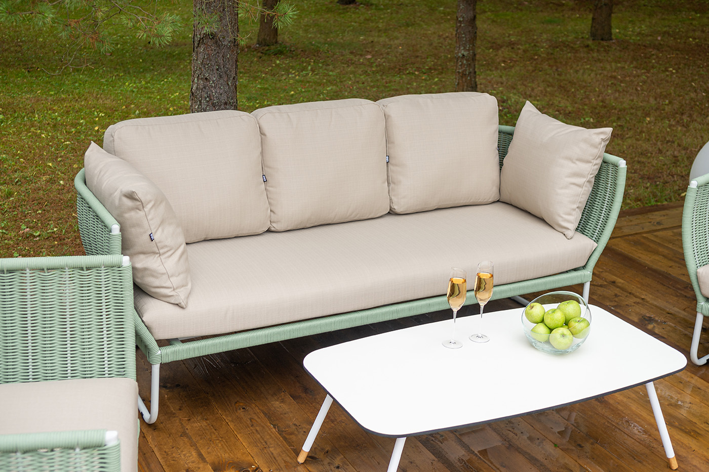 "Фиджи" диван 3-местный плетеный из роупа, каркас алюминий светло-серый (RAL7035) муар, роуп зеленый (4204) круглый tex, ткань Mossle бежевая 1шт. 2 180Х890Х810, "Фиджи" кресло плетеное из роупа, каркас алюминий светло-серый (RAL7035) муар, роуп зеленый (4204) круглый tex, ткань Mossle бежевая 2шт. 1 040Х890Х810, "Верона" журнальный стол из HPL 120х65, H40, каркас белый муар, цвет столешницы "молочный" 1шт. 1 200Х650Х400,