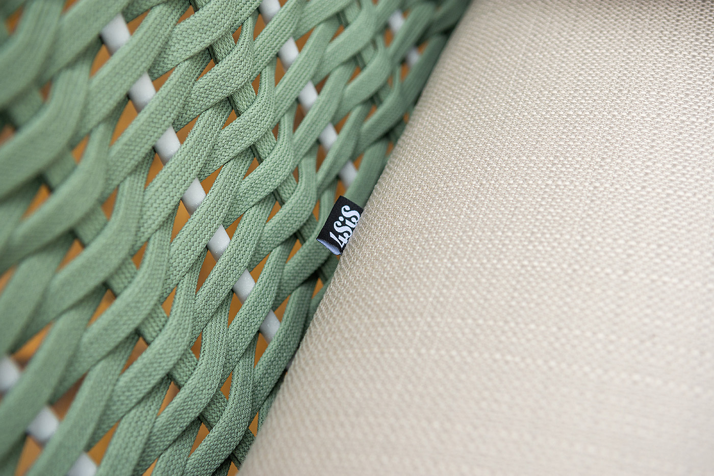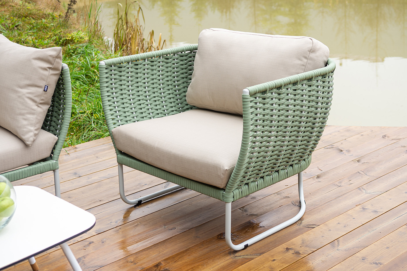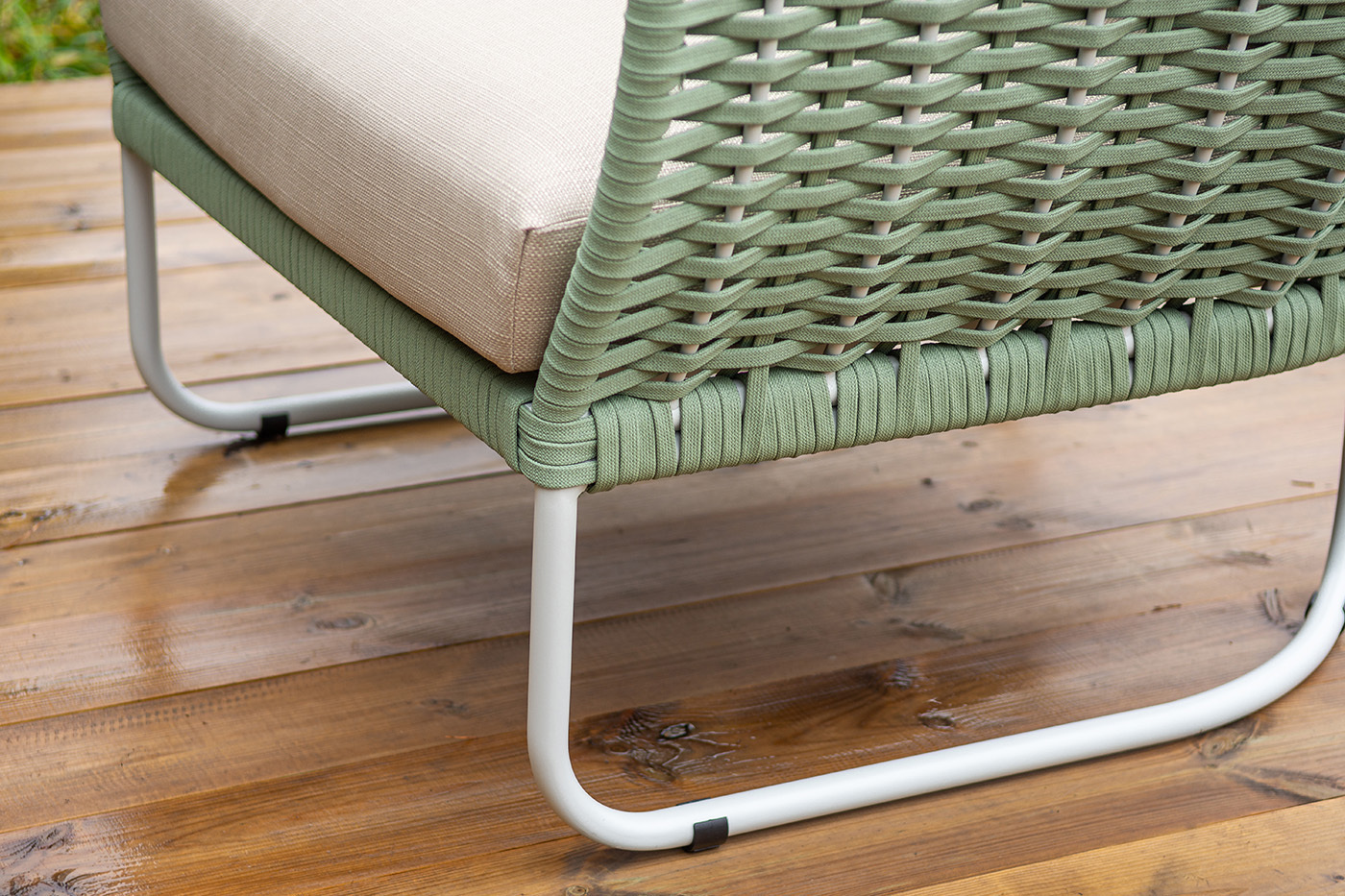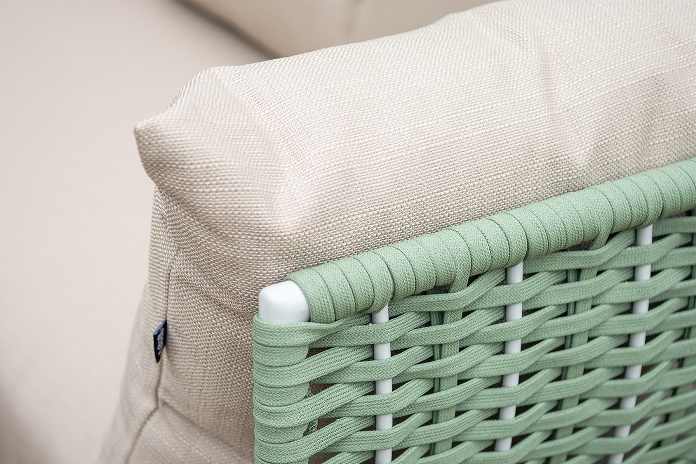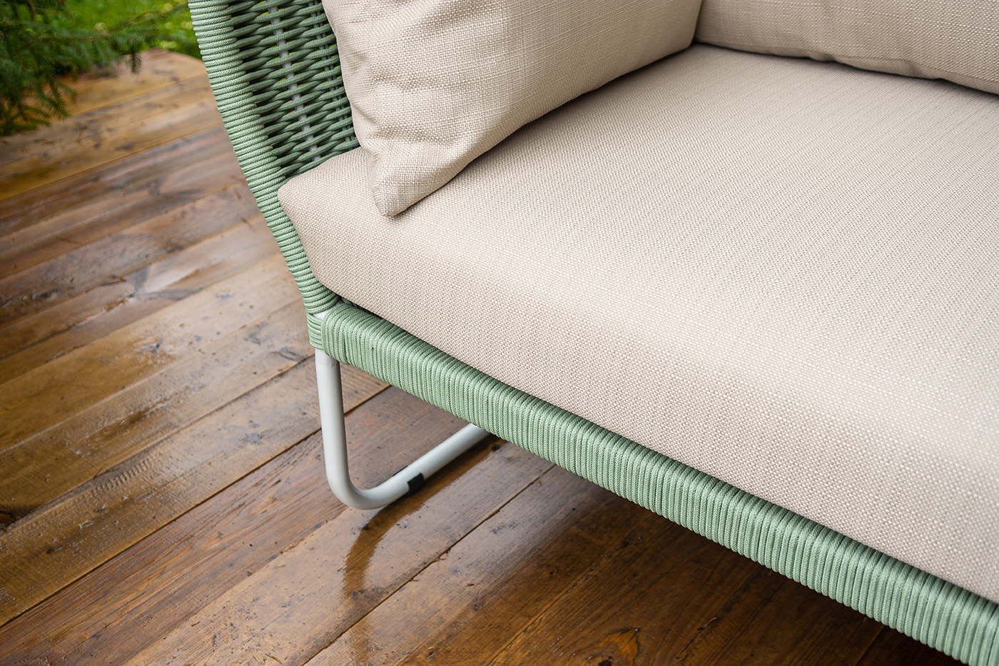 Боковины дивана и кресел вручную оплетены зелеными синтетическими лентами из высокопрочных полиэфирных волокон. Плетение придает мебели выразительный облик и удачно дополняет цвет каркаса.