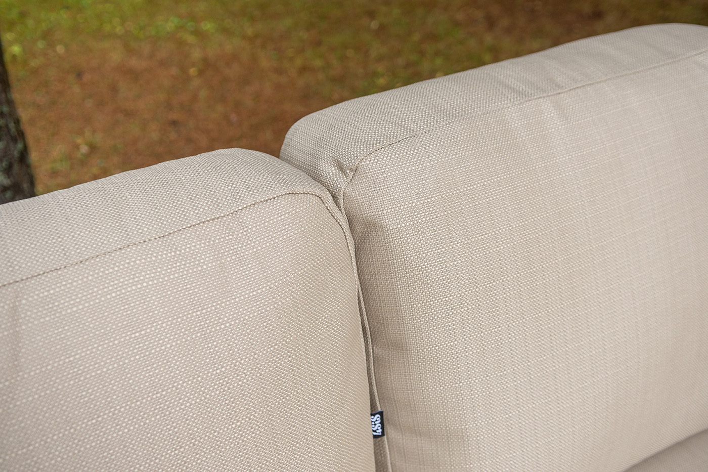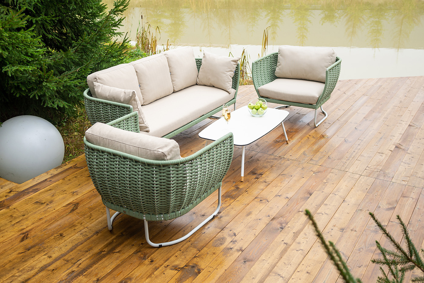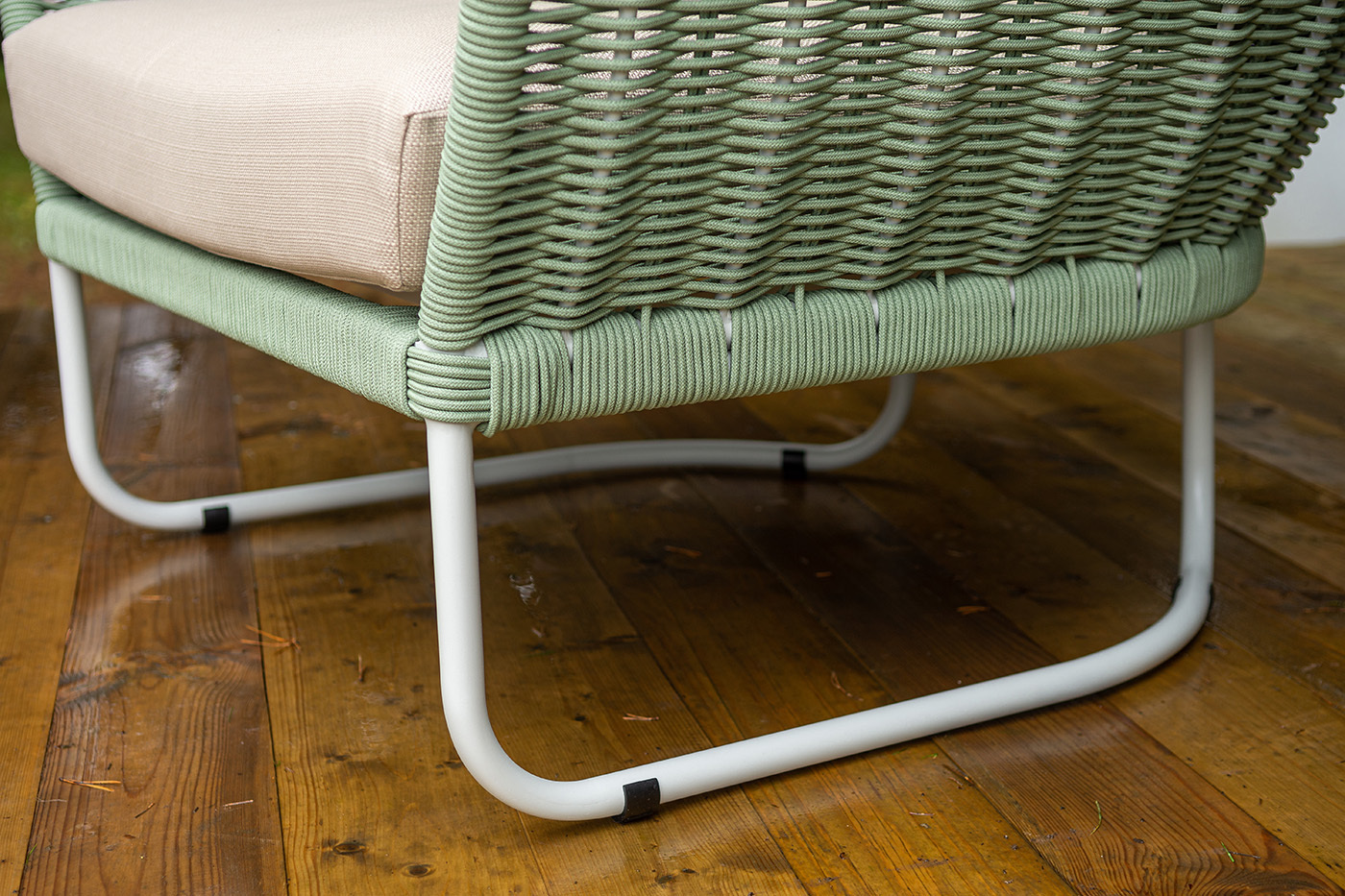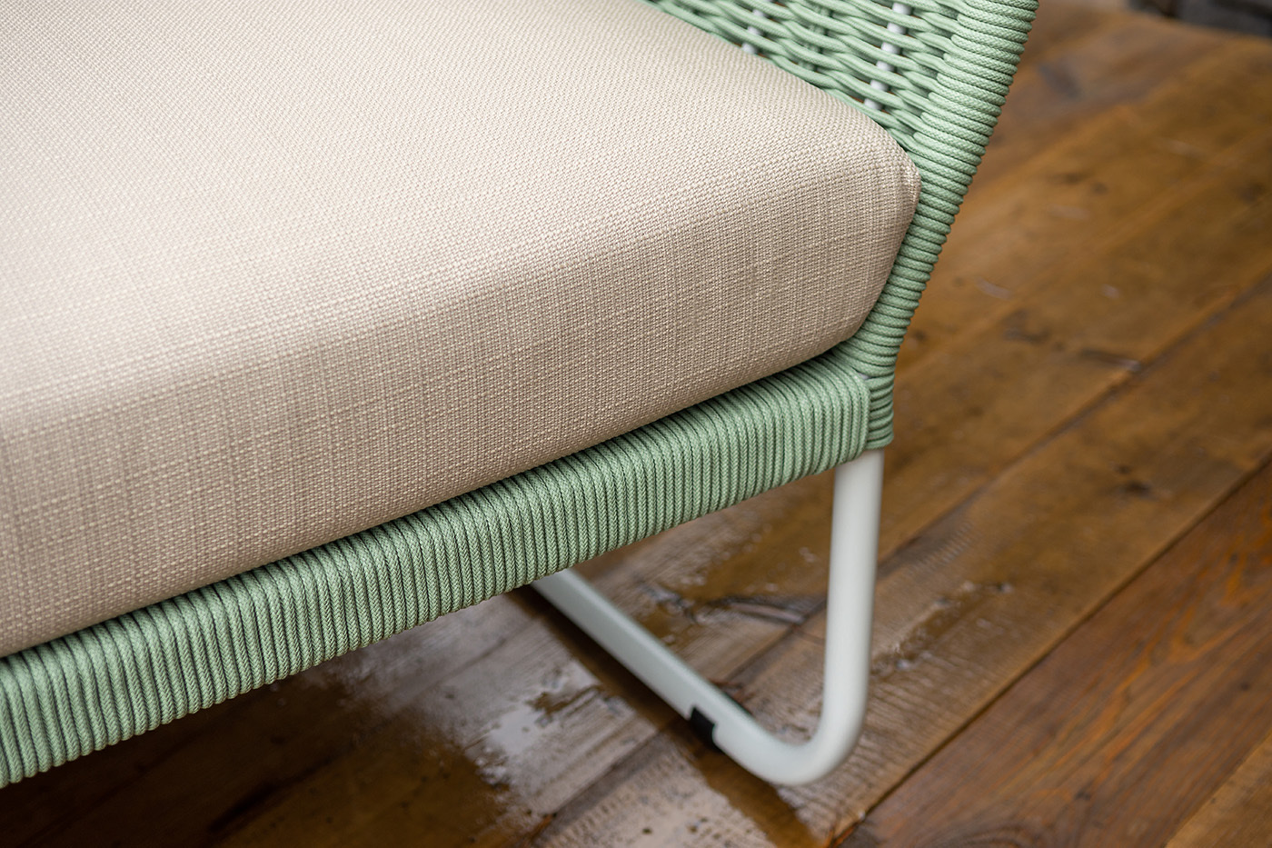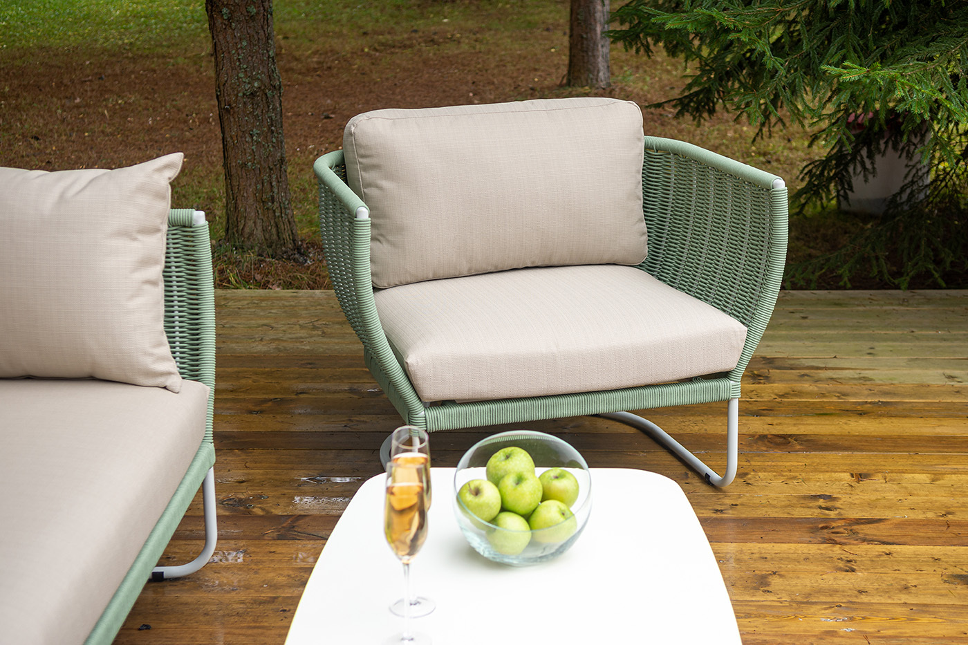 Боковины дивана и кресел вручную оплетены зелеными синтетическими лентами из высокопрочных полиэфирных волокон. Плетение придает мебели выразительный облик и удачно дополняет цвет каркаса.