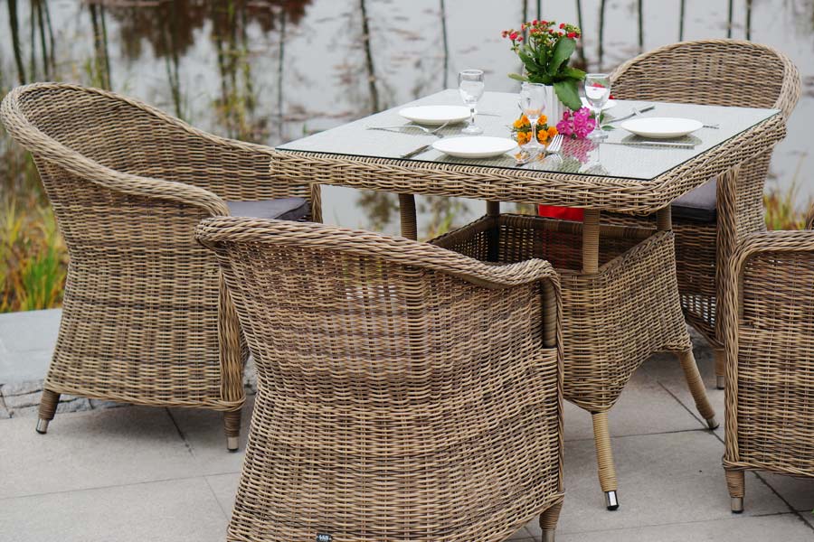 Уличная обеденная группа «Фредо» для обустройства зоны отдыха. Комплект состоит из: квадратного обеденного стола «Айриш» - 900×900×750 мм и 4 кресел «Равенна» - 570×680×810 мм в натуральном соломенном цвете.
