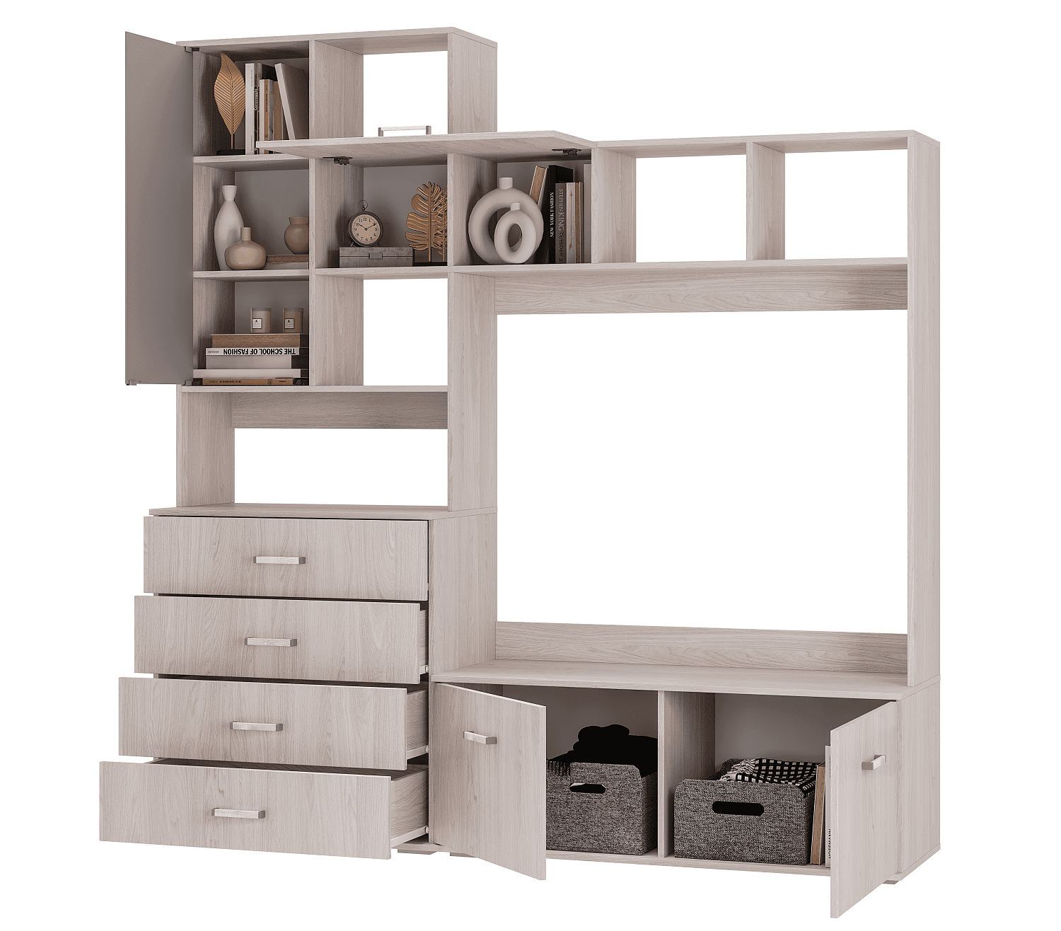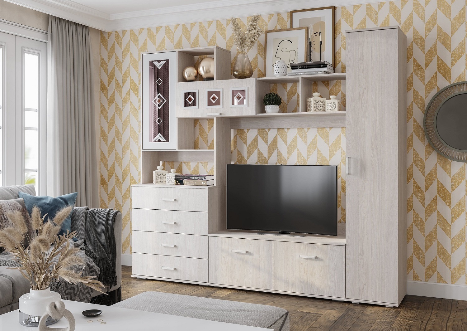 Всеми любимая коллекция мебели для гостиных Белла теперь в новом, трендовом декоре "ясень белый"! Функциональные модули для организации ТВ-зоны и хранения одежды и вещей представлены в приятном светлом декоре, имитирующем текстуру натурального дерева. За счет разнообразия и небольшой глубины модулей Вы сможете грамотно обустроить гостиную даже в малогабаритке, квартире-студии и помещении с нестандартной планировкой. Например, комплект 1 состоит из центральной секции Белла и шкафа-пенала с полками и стационарной штангой.