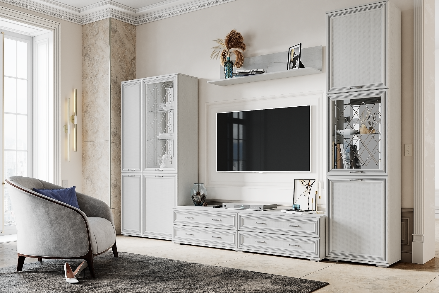 В поисках мебели для гостиной в классическом стиле рекомендуем Вам обратить внимание на коллекцию Ливорно. Благодаря 16 разноплановым функциональным модулям Вы сможете грамотно и быстро организовать зону хранения и ТВ-зону в гостиной комнате, рационально используя пространство. Мебель выполнена из высококлассного ЛДСП и декорирована рамочным профилем из МДФ. Приятный цвет модулей, комбинированные фасады некоторых шкафов и элегантная фурнитура делают Ливорно хитом на рынке корпусной мебели.