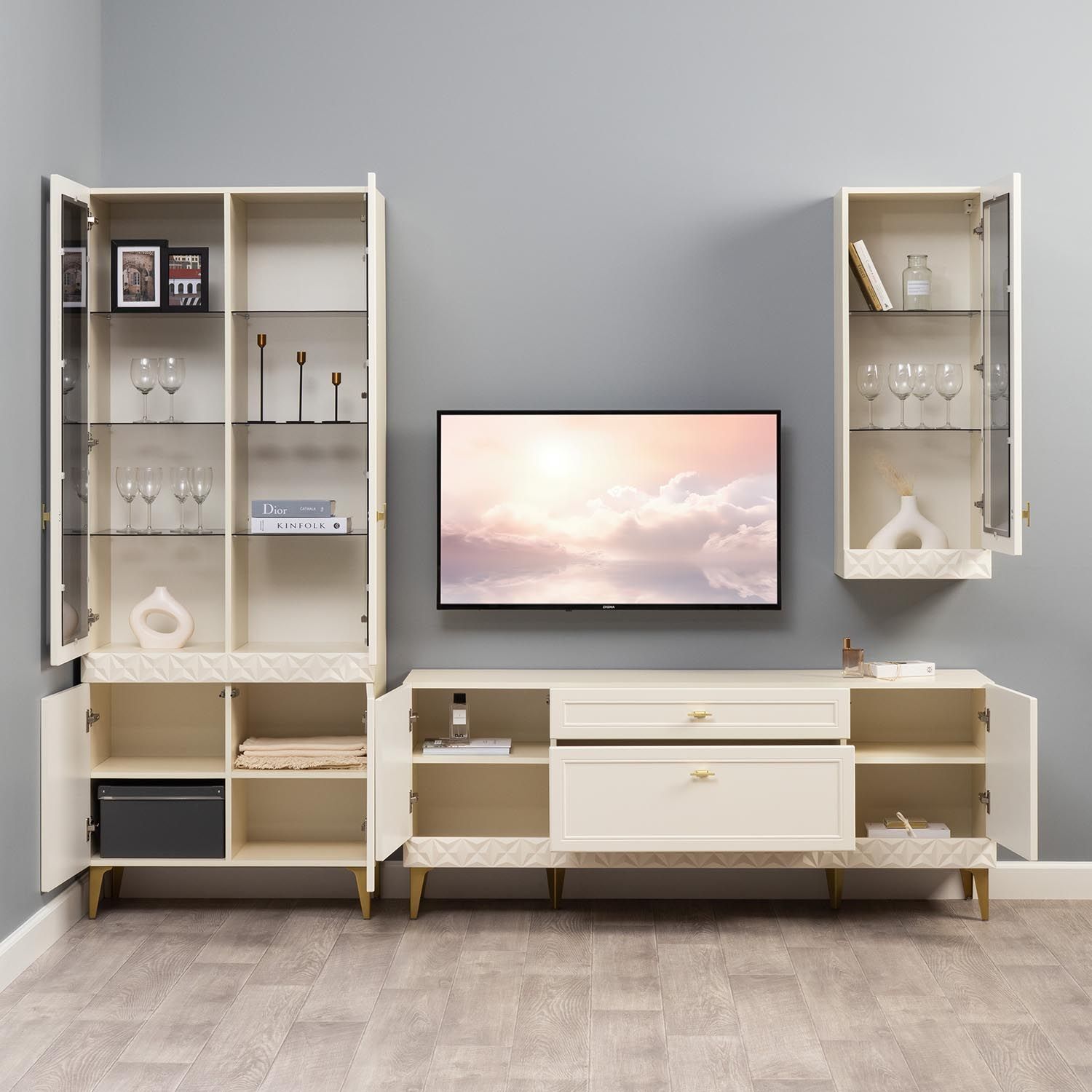 Конструкция с настенным шкафом, тумбой для тв и витриной..