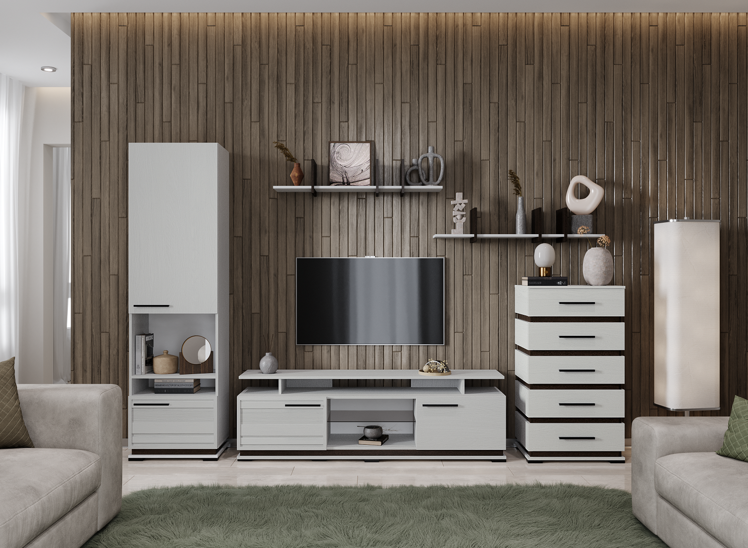 Модульная коллекция Модена содержит в себе все характеристики стильной и функциональной мебели для Вашей гостиной. Мебель выполнена из высококлассного ЛДСП в декоре ясень анкор светлый, декорированным вставками из МФД цвета венге. Разнообразие модулей, материал с тиснением дерева, строгость линий и форм, привлекательная лицевая фурнитура - это еще не все преимущества, которыми обладает Модена. Выберите свой уникальный комплект и наслаждайтесь уютом и комфортом долгие годы.
