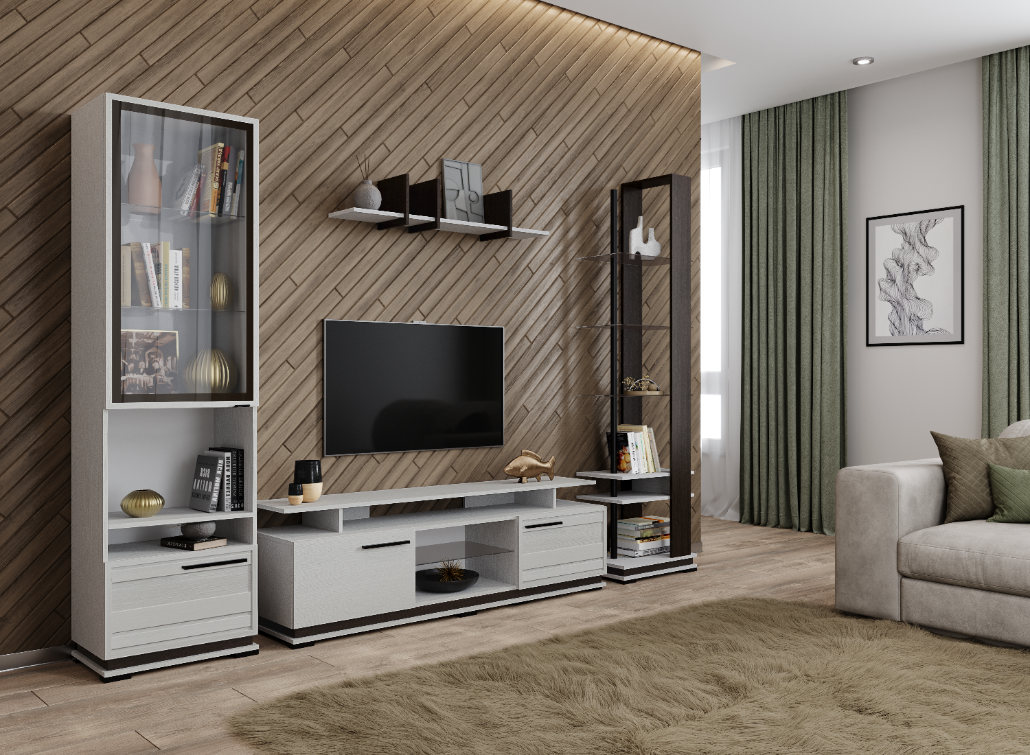 Модульная коллекция Модена содержит в себе все характеристики стильной и функциональной мебели для Вашей гостиной. Мебель выполнена из высококлассного ЛДСП в декоре ясень анкор светлый, декорированным вставками из МФД цвета венге. Разнообразие модулей, материал с тиснением дерева, строгость линий и форм, привлекательная лицевая фурнитура - это еще не все преимущества, которыми обладает Модена. Выберите свой уникальный комплект и наслаждайтесь уютом и комфортом долгие годы.