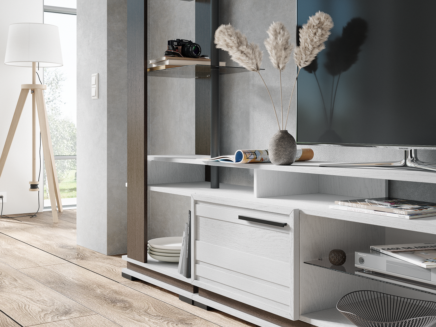 сочетание древесного декора с темными деталями из МДФ и стеклом