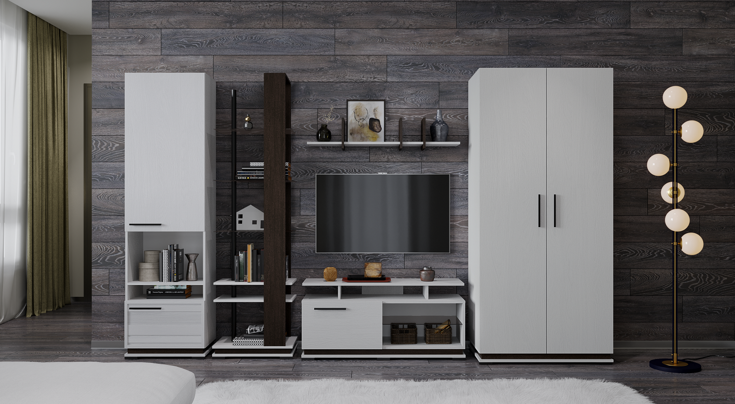Модульная коллекция Модена содержит в себе все характеристики стильной и функциональной мебели для Вашей гостиной. Мебель выполнена из высококлассного ЛДСП в декоре ясень анкор светлый, декорированным вставками из МФД цвета венге. Разнообразие модулей, материал с тиснением дерева, строгость линий и форм, привлекательная лицевая фурнитура - это еще не все преимущества, которыми обладает Модена. Выберите свой уникальный комплект и наслаждайтесь уютом и комфортом долгие годы. Например, комплект 3 состоит из вместительного шкафа для одежды, тумбы под ТВ, навесной полки, открытого стеллажа и шкафа-пенала.