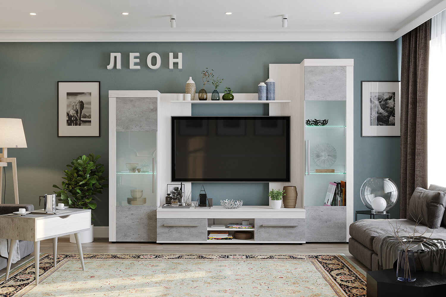 Поклонники модернизма понимают, насколько поэтичным и прекрасным может быть бетон. Этот декор подчеркнуто деликатен и ненавязчив, идеально подходит для обладателей лофтов. Законодатели интерьерных тенденций “сдали” бетону кухню, ванную, облицовку стен и пола, а теперь уже и мебель для других комнат. Особенно гармонично материалы “под бетон с черными вкраплениями” выглядят в лофтах - популярных однокомнатных планировках недорогих квартир, ориентированных на молодую аудиторию. Спокойный и мужественный “бетонный” декор Ателье Светлый на фасадах стенки ЛЕОН облечен в раму из древесного декора Ясень Анкор светлый.