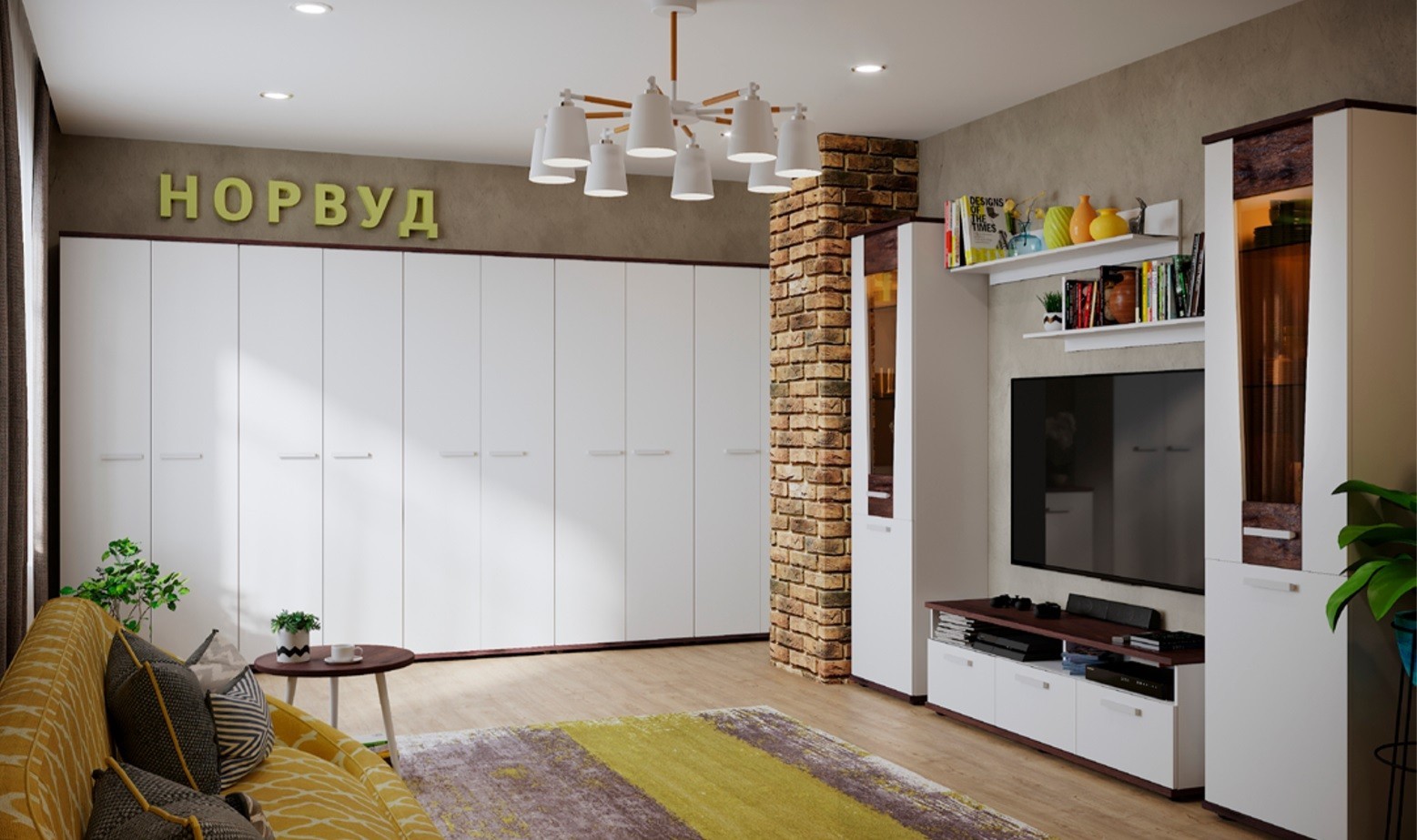 Скандинавский стиль в интерьере гостиной близок к минимализму. Поэтому большой набор модулей гостиной НОРВУД полностью соответствует канонам стиля. Для платяных шкафов придется поискать место в других комнатах или поставить их в один ряд, создав зону гардеробной.