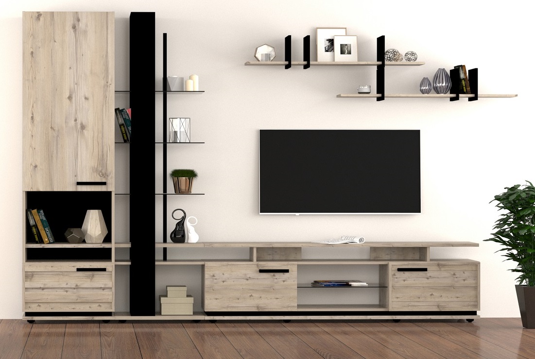 Модульная коллекция Nature в новом цвете Гаскон пайн/Черный - стильное решение для организации пространства Вашей гостиной. Благодаря модному цветовому сочетанию комплект будет актуально смотреться в современном интерьере. Функциональность модулей позволит Вам с комфортом обыграть ТВ-зону и зону хранения вещей в центральной комнате. В комплект входит: Nature 3 (гостиная) Тумба ТВ, Nature 25 (гостиная) Стеллаж, Nature 1 (гостиная) Шкаф МЦН, Nature 6 (гостиная) Комод, Nature 18 (полка)*2 шт.