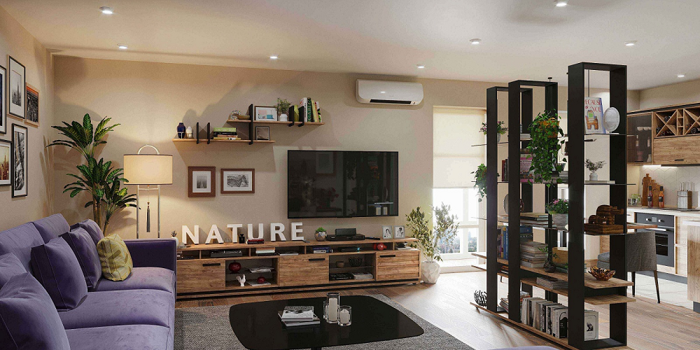 Минимализм в гостиной: NATURE 5 Тумба МЦН и композиция из Стеллажей и Навесных полок