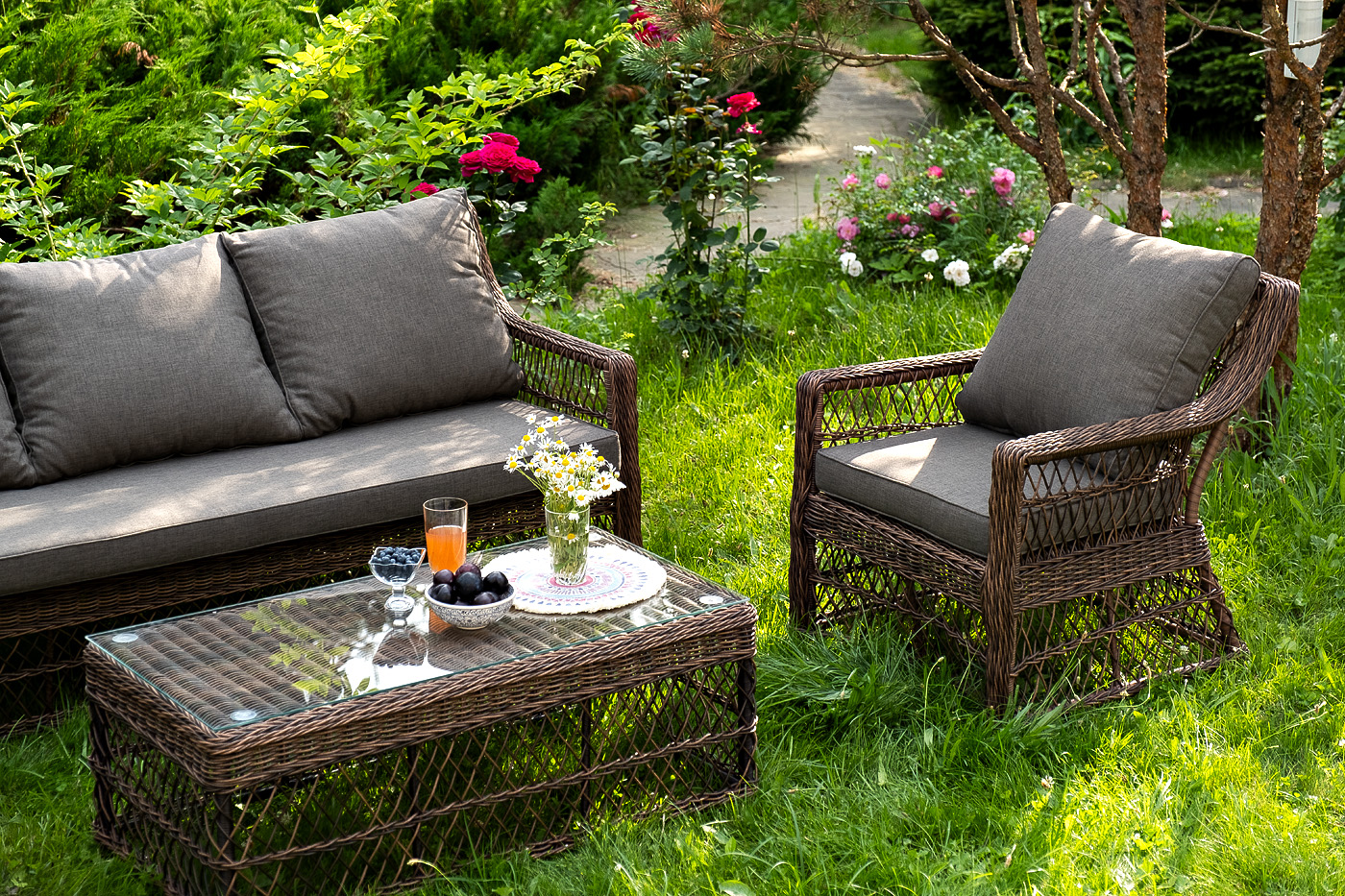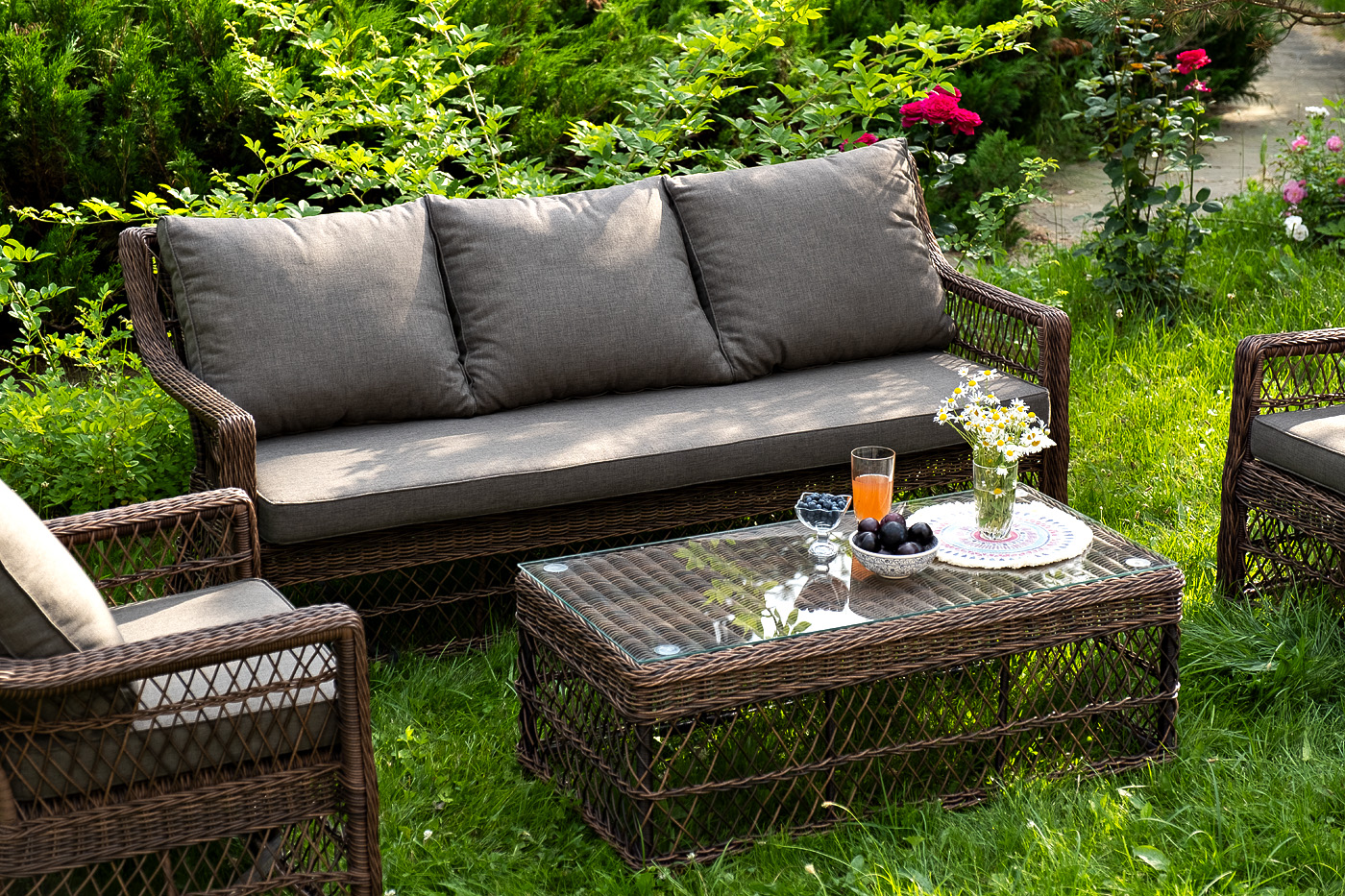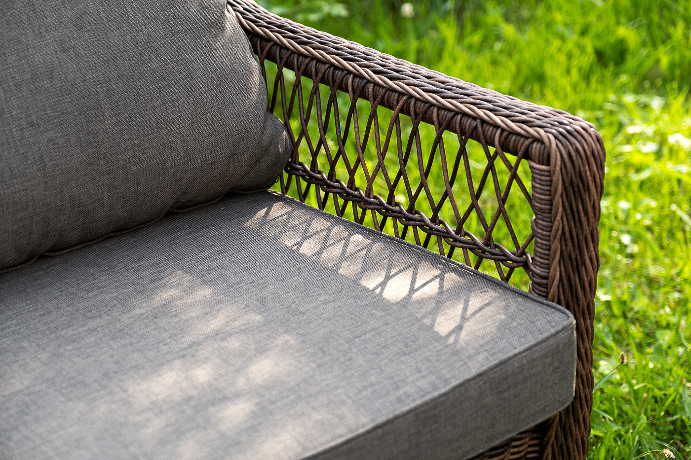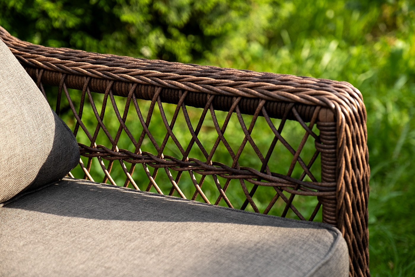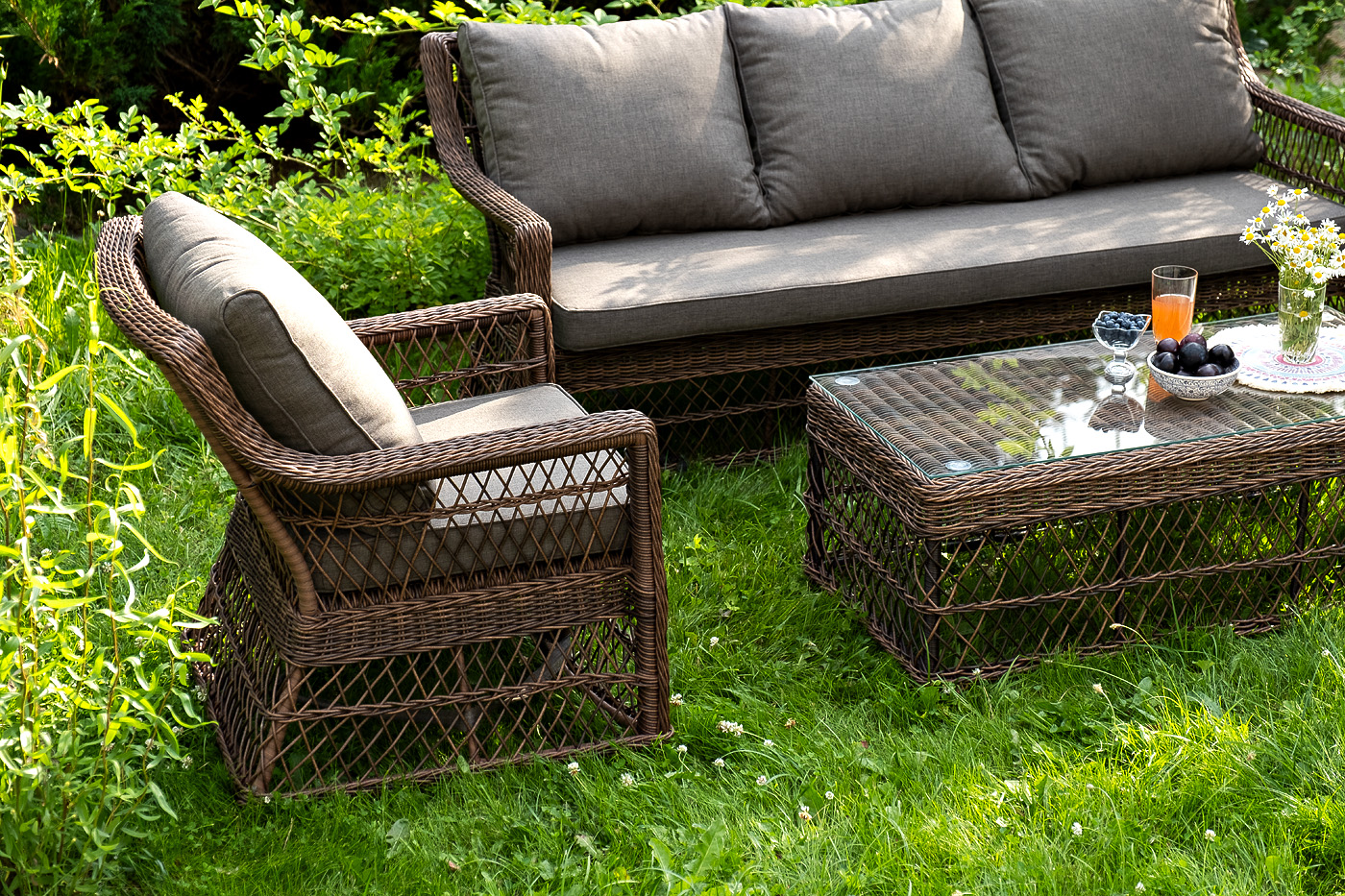 Уличная мебель имеет алюминиевый каркас, ручное плетение, сделанное из коричневого искусственного ротанга. Предусмотрены мягкие подушки из полиэстера серого цвета с плотностью 300гр/м2. "Гранд Латте" диван трехместный из искусственного ротанга, цвет коричневый 1шт. 1 875Х830Х850, "Гранд Латте" кресло из искусственного ротанга, цвет коричневый 2шт. 720Х830Х850, "Гранд Латте" стол журнальный из искусственного ротанга, цвет коричневый 1шт. 1 120Х570Х450,