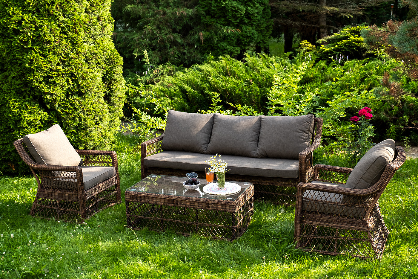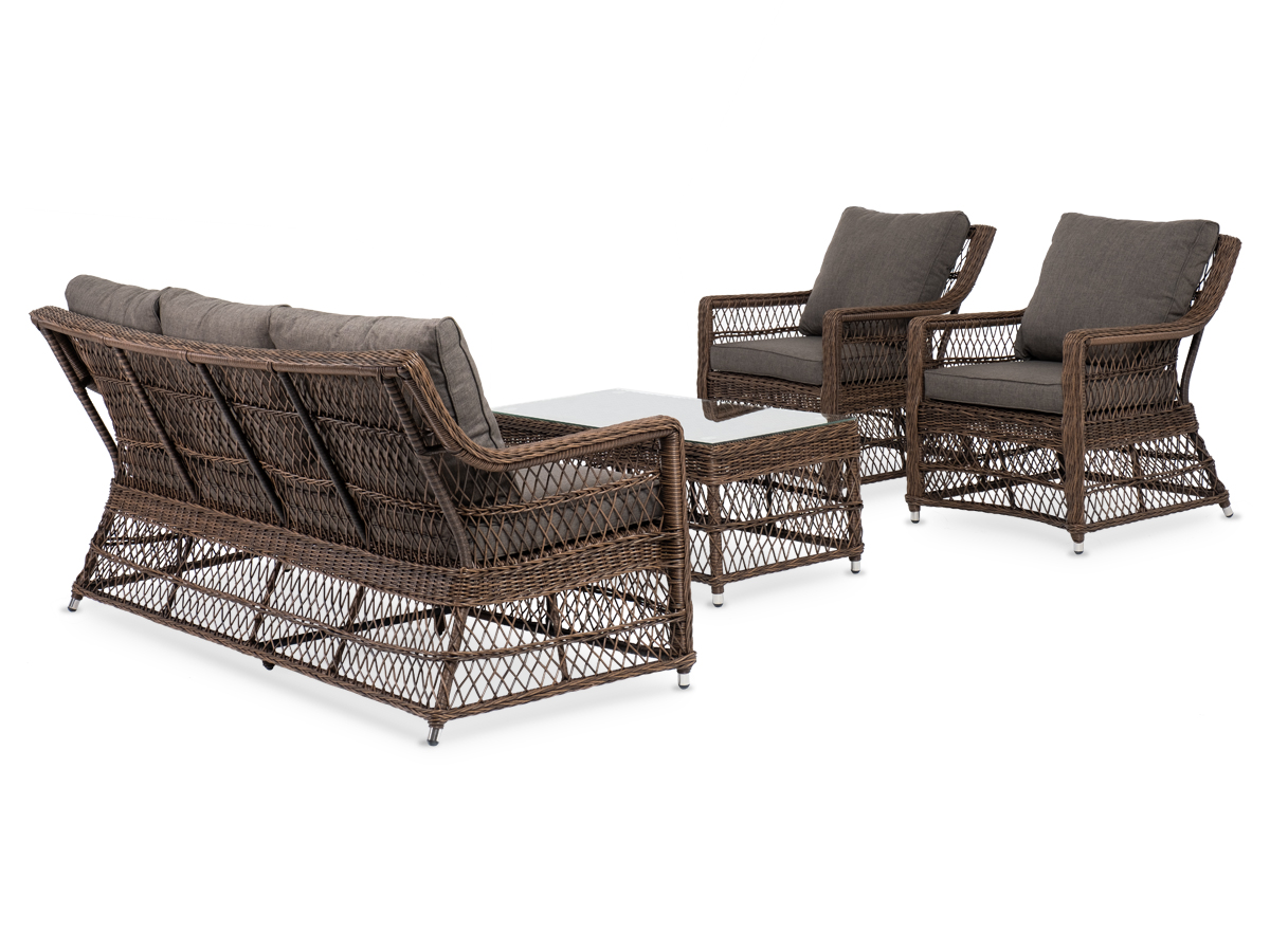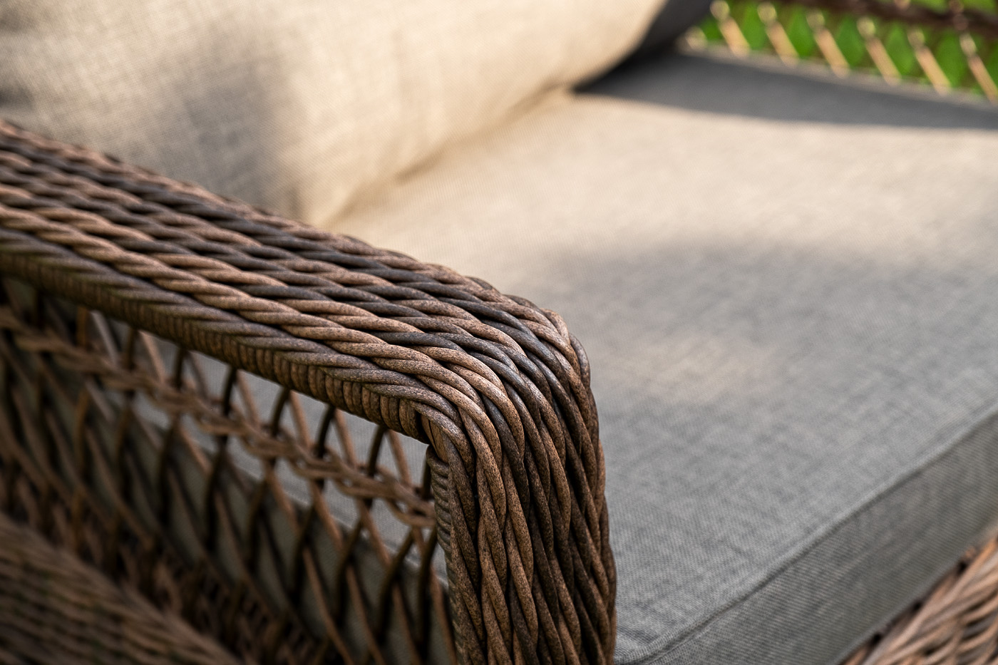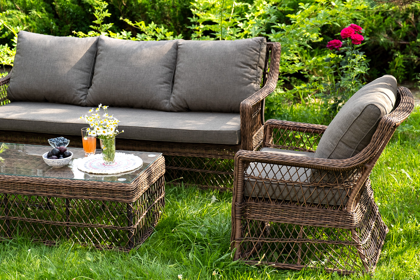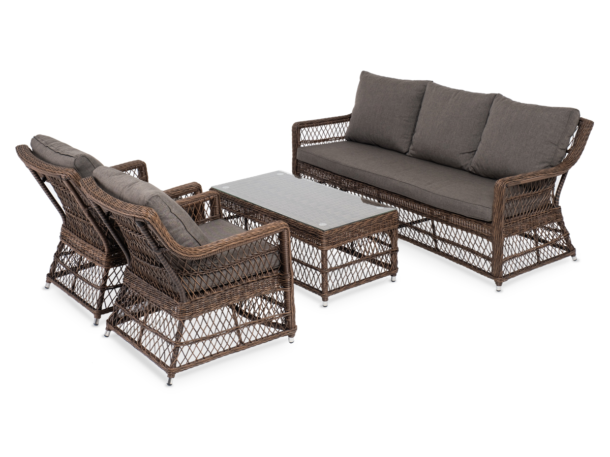 Уличная мебель имеет алюминиевый каркас, ручное плетение, сделанное из коричневого искусственного ротанга. Предусмотрены мягкие подушки из полиэстера серого цвета с плотностью 300гр/м2. "Гранд Латте" диван трехместный из искусственного ротанга, цвет коричневый 1шт. 1 875Х830Х850, "Гранд Латте" кресло из искусственного ротанга, цвет коричневый 2шт. 720Х830Х850, "Гранд Латте" стол журнальный из искусственного ротанга, цвет коричневый 1шт. 1 120Х570Х450,