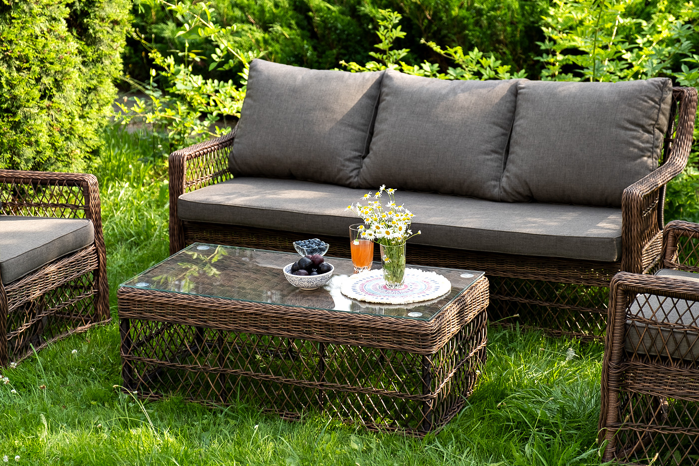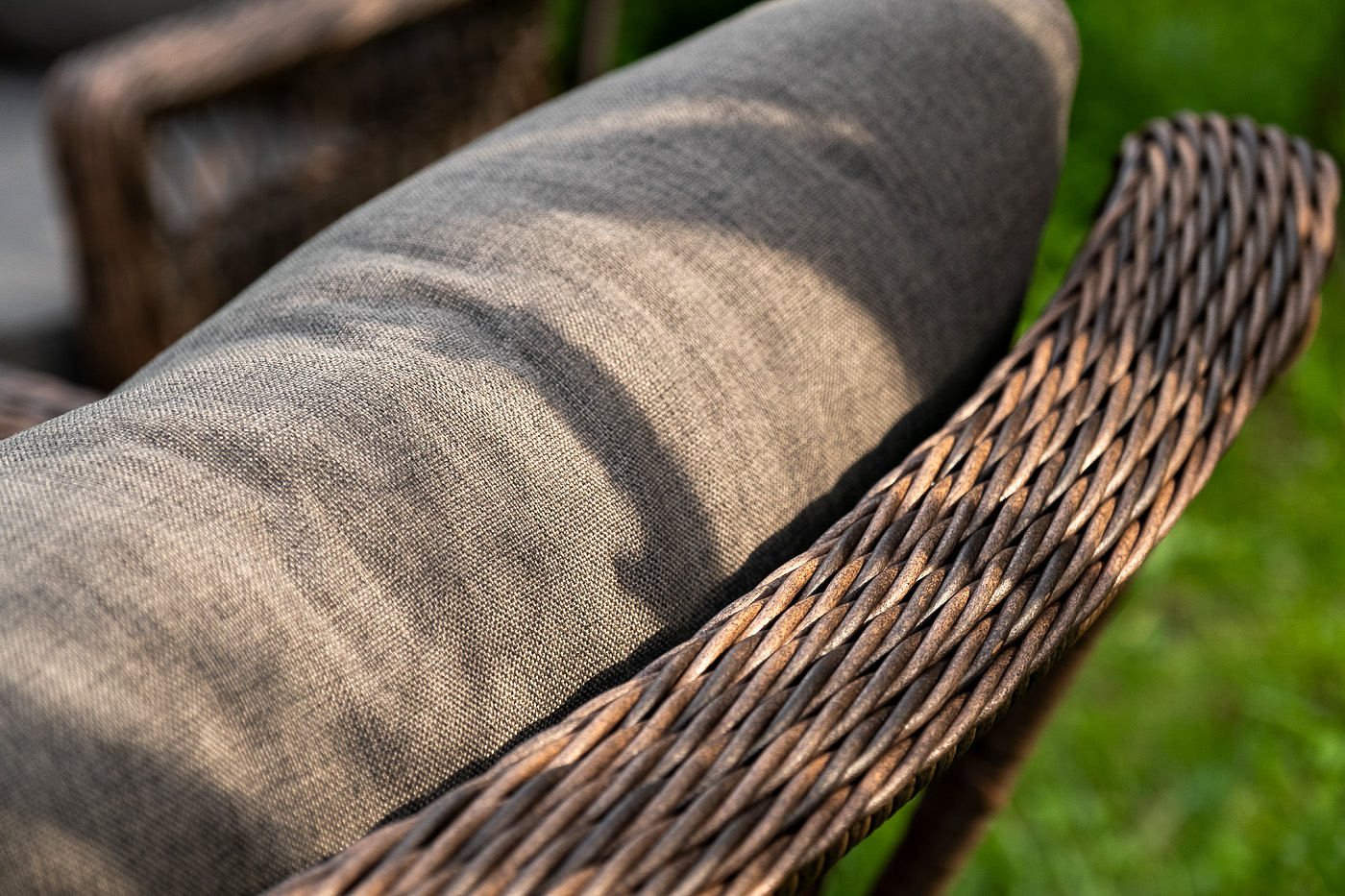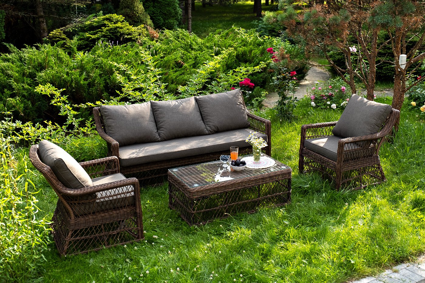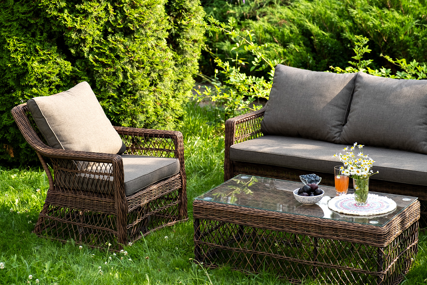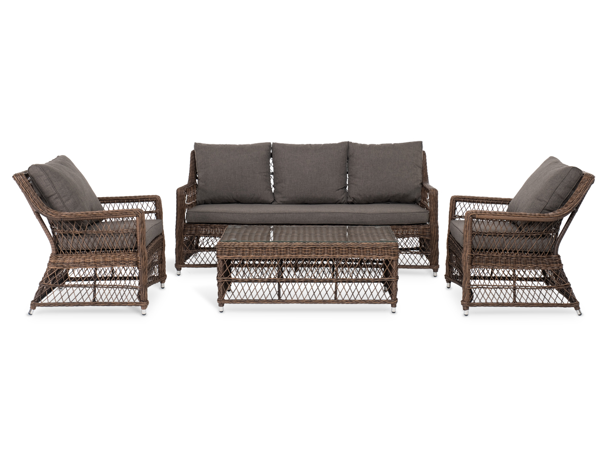 Уличная мебель имеет алюминиевый каркас, ручное плетение, сделанное из коричневого искусственного ротанга. Предусмотрены мягкие подушки из полиэстера серого цвета с плотностью 300гр/м2. "Гранд Латте" диван трехместный из искусственного ротанга, цвет коричневый 1шт. 1 875Х830Х850, "Гранд Латте" кресло из искусственного ротанга, цвет коричневый 2шт. 720Х830Х850, "Гранд Латте" стол журнальный из искусственного ротанга, цвет коричневый 1шт. 1 120Х570Х450,