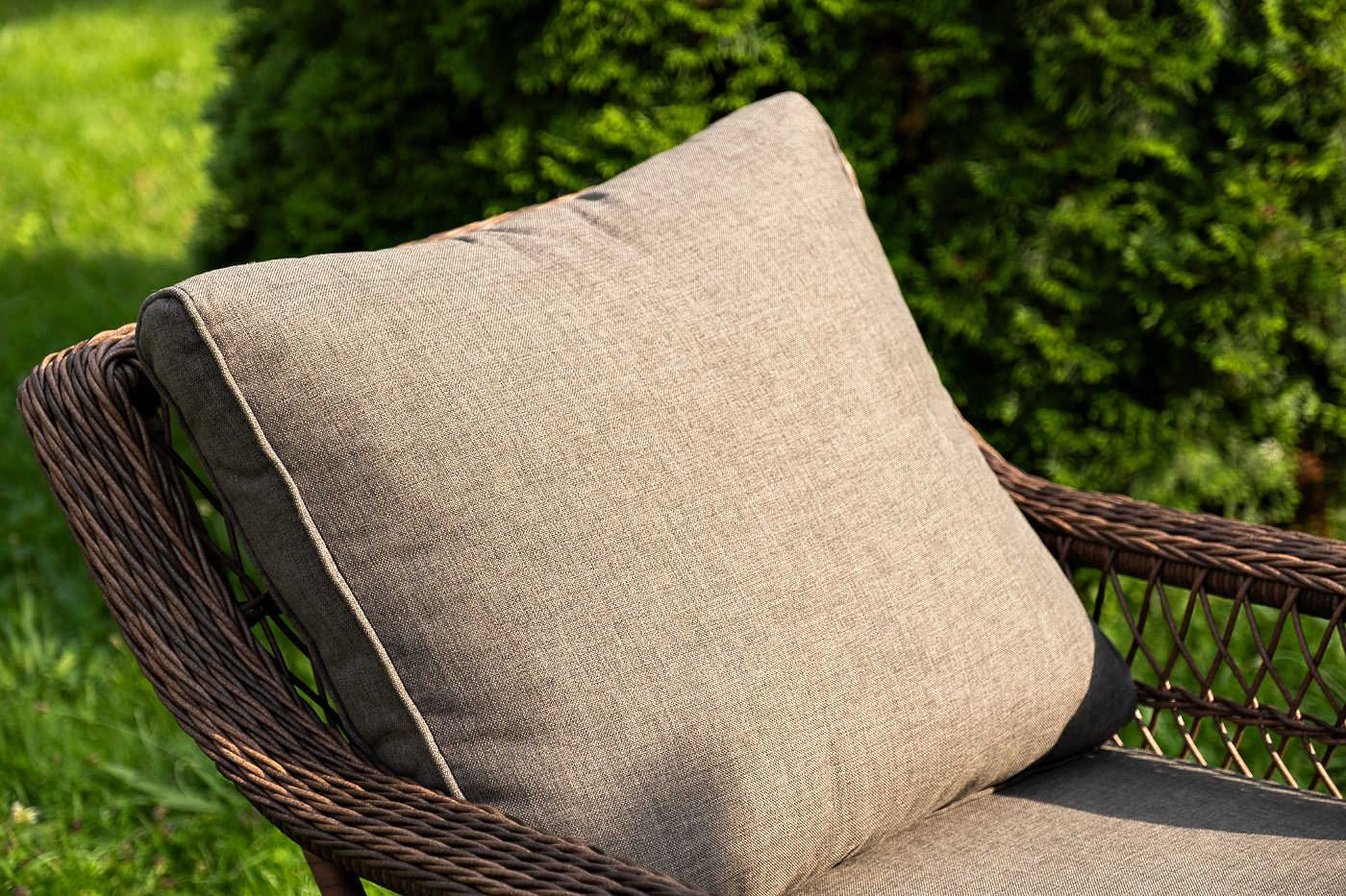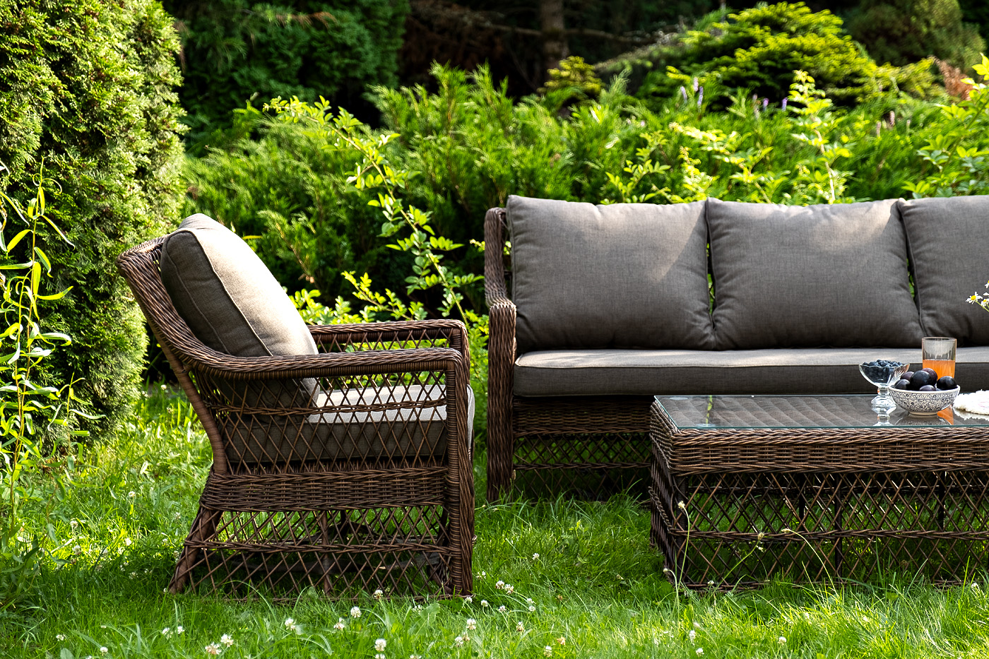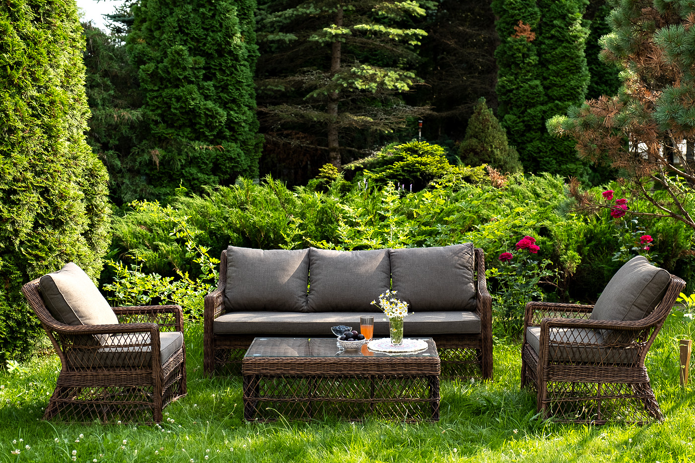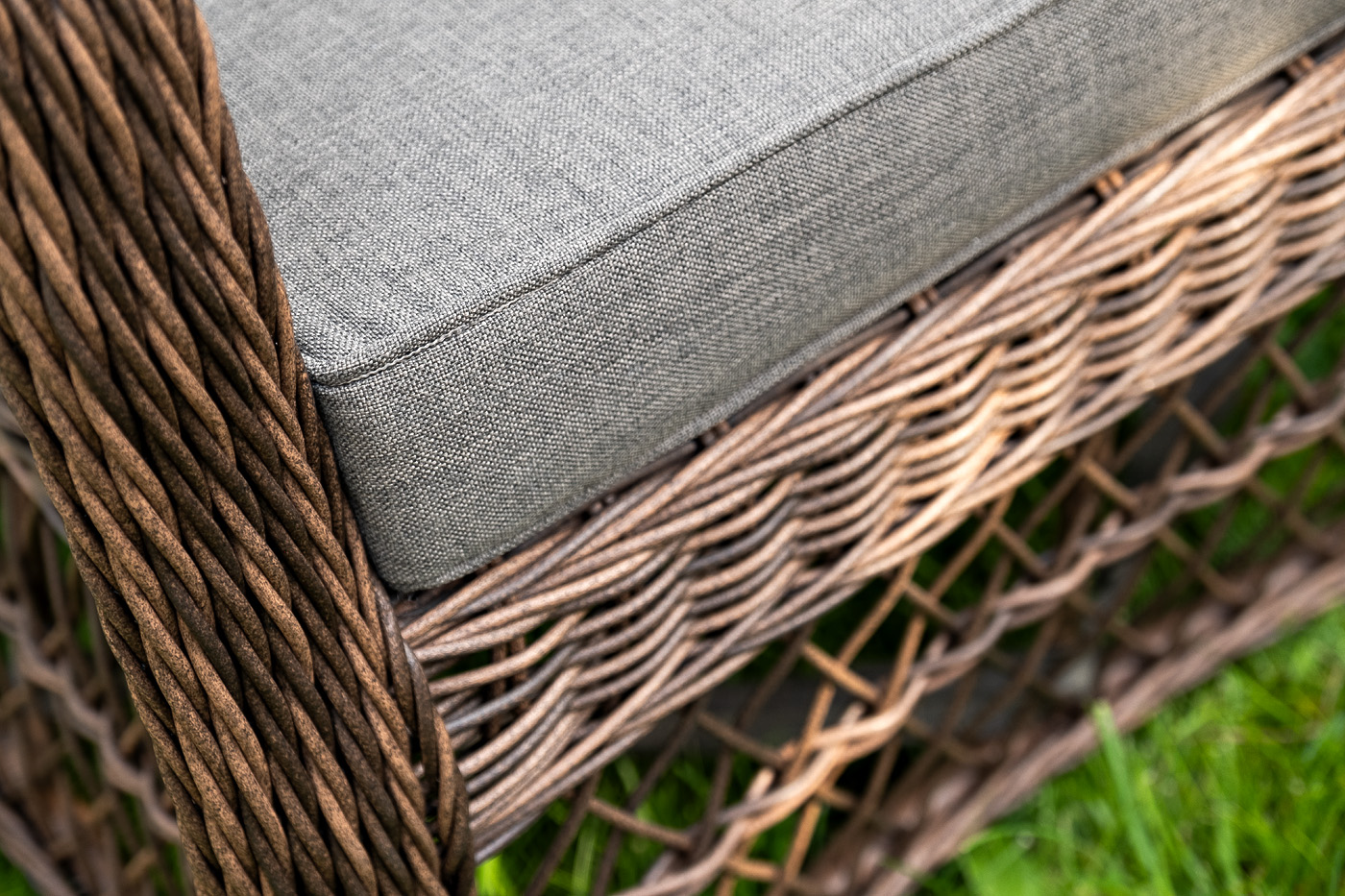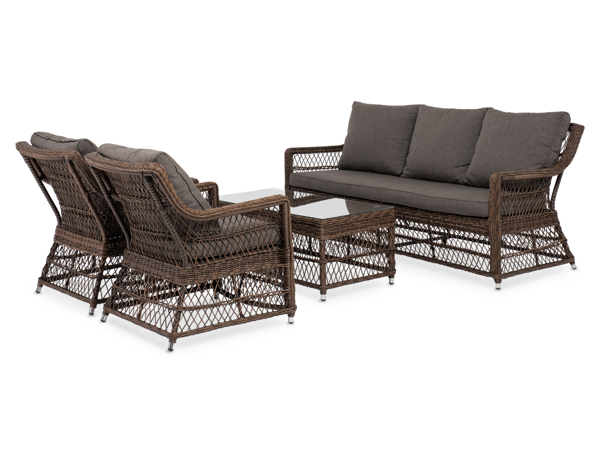 Уличная мебель имеет алюминиевый каркас, ручное плетение, сделанное из коричневого искусственного ротанга. Предусмотрены мягкие подушки из полиэстера серого цвета с плотностью 300гр/м2. "Гранд Латте" диван трехместный из искусственного ротанга, цвет коричневый 1шт. 1 875Х830Х850, "Гранд Латте" кресло из искусственного ротанга, цвет коричневый 2шт. 720Х830Х850, "Гранд Латте" стол журнальный из искусственного ротанга, цвет коричневый 1шт. 1 120Х570Х450,