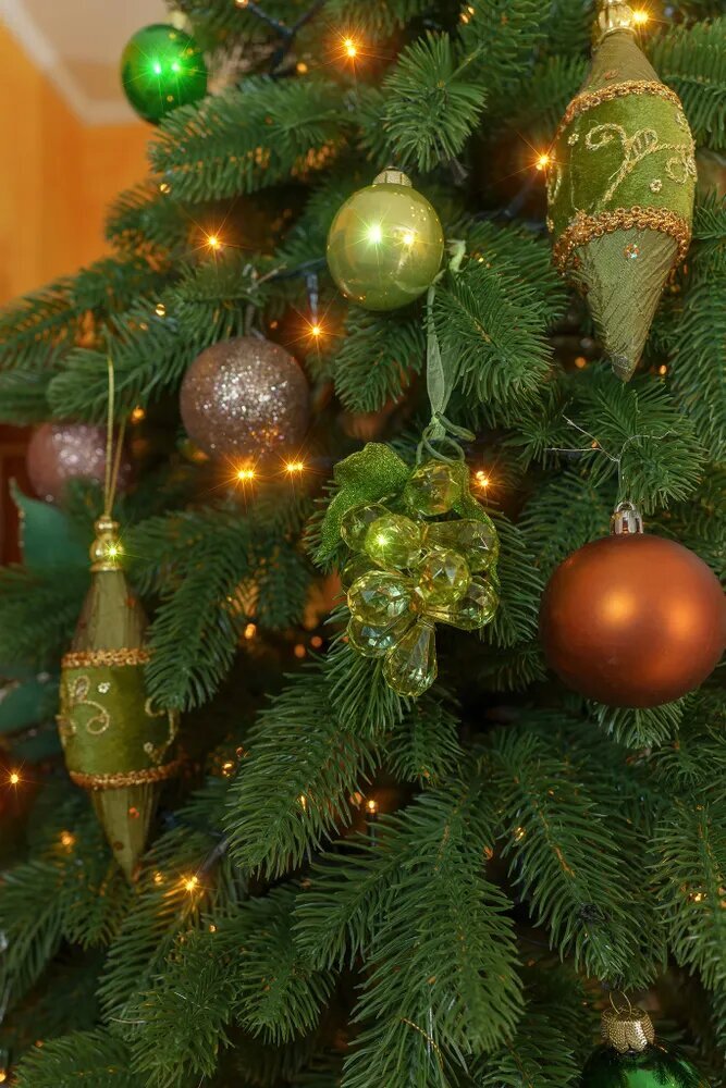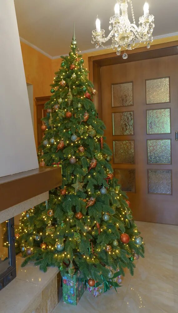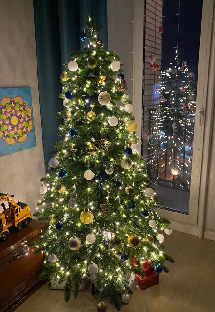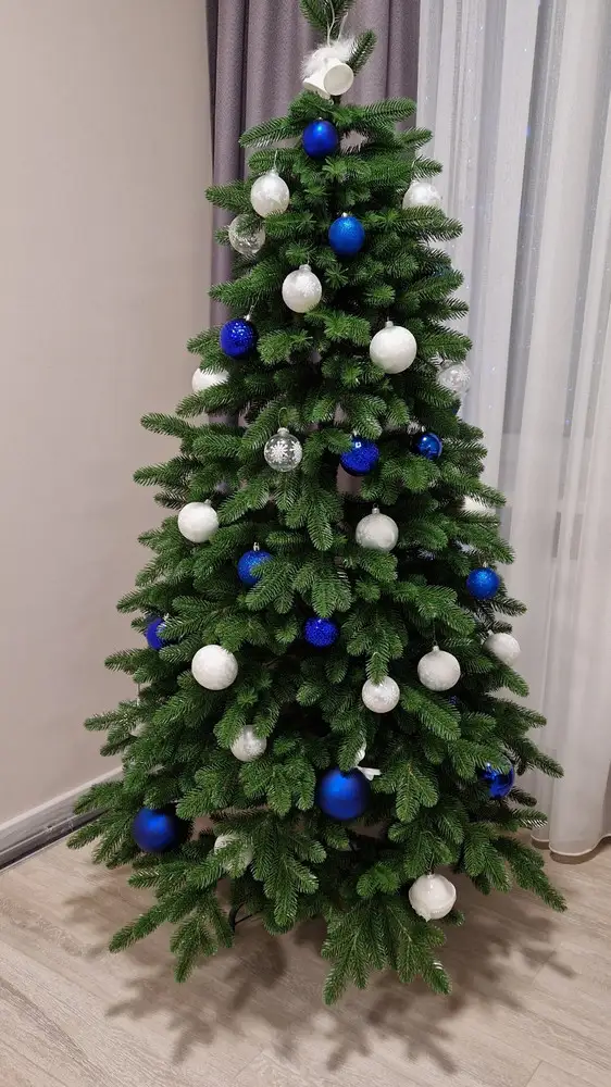 Количество ветвей составляет 329 штук, что придает елке пышный и густой вид. Крепление веток осуществляется на шарнирах, что позволяет легко расправлять и собирать елку.