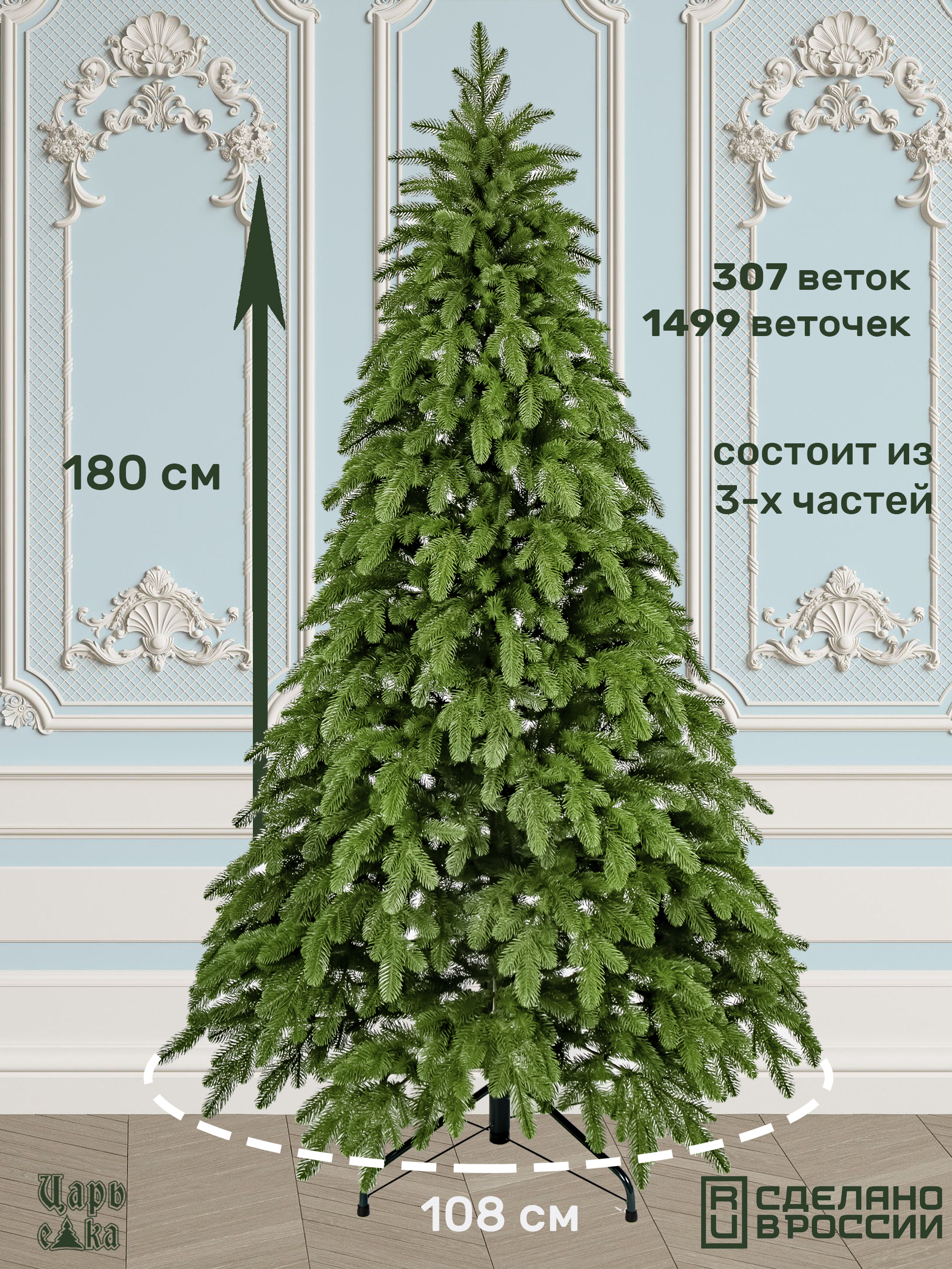 Елка имеет высоту 180 см и диаметр основания 108 см, что делает ее достаточно заметной и в то же время компактной. Конструкция ствольная, что обеспечивает устойчивость и надежность.