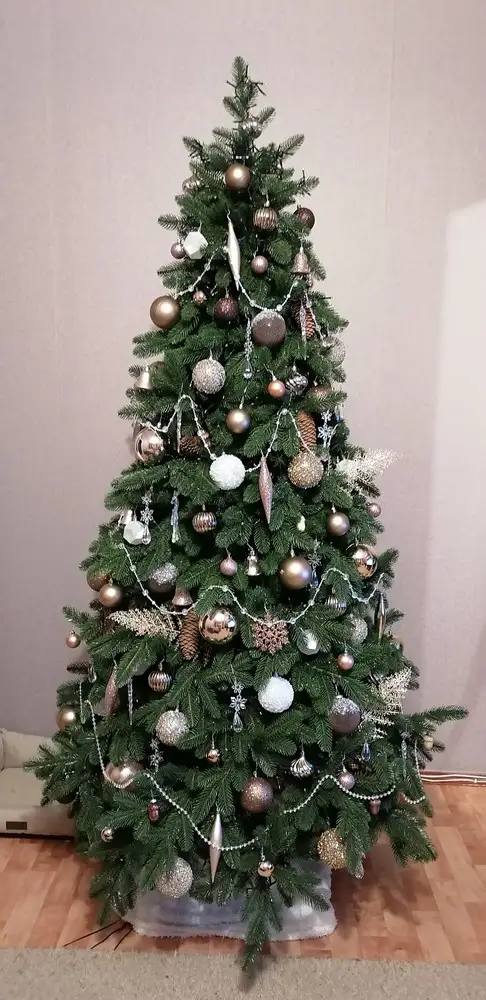 Елка имеет высоту 210 см, что позволяет ей выглядеть впечатляюще и привлекать внимание. Диаметр основания составляет 126 см, что обеспечивает достаточное пространство для размещения украшений и игрушек.
