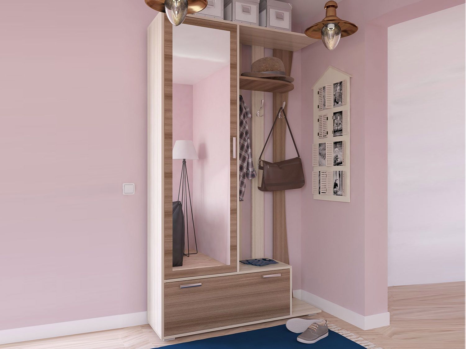 Вверху гардеробная полка, под ней пенал с зеркальной дверью и вешалка для одежды, внизу тумба для обуви.