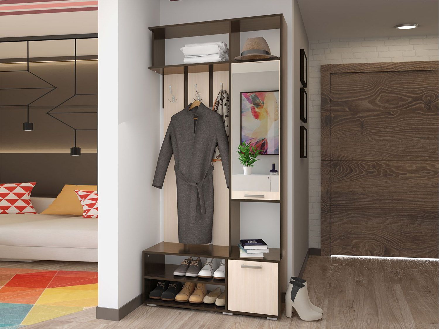 Вверху гардеробная полка, под ней пенал с зеркальной дверью и вешалка для одежды, внизу тумба для обуви.