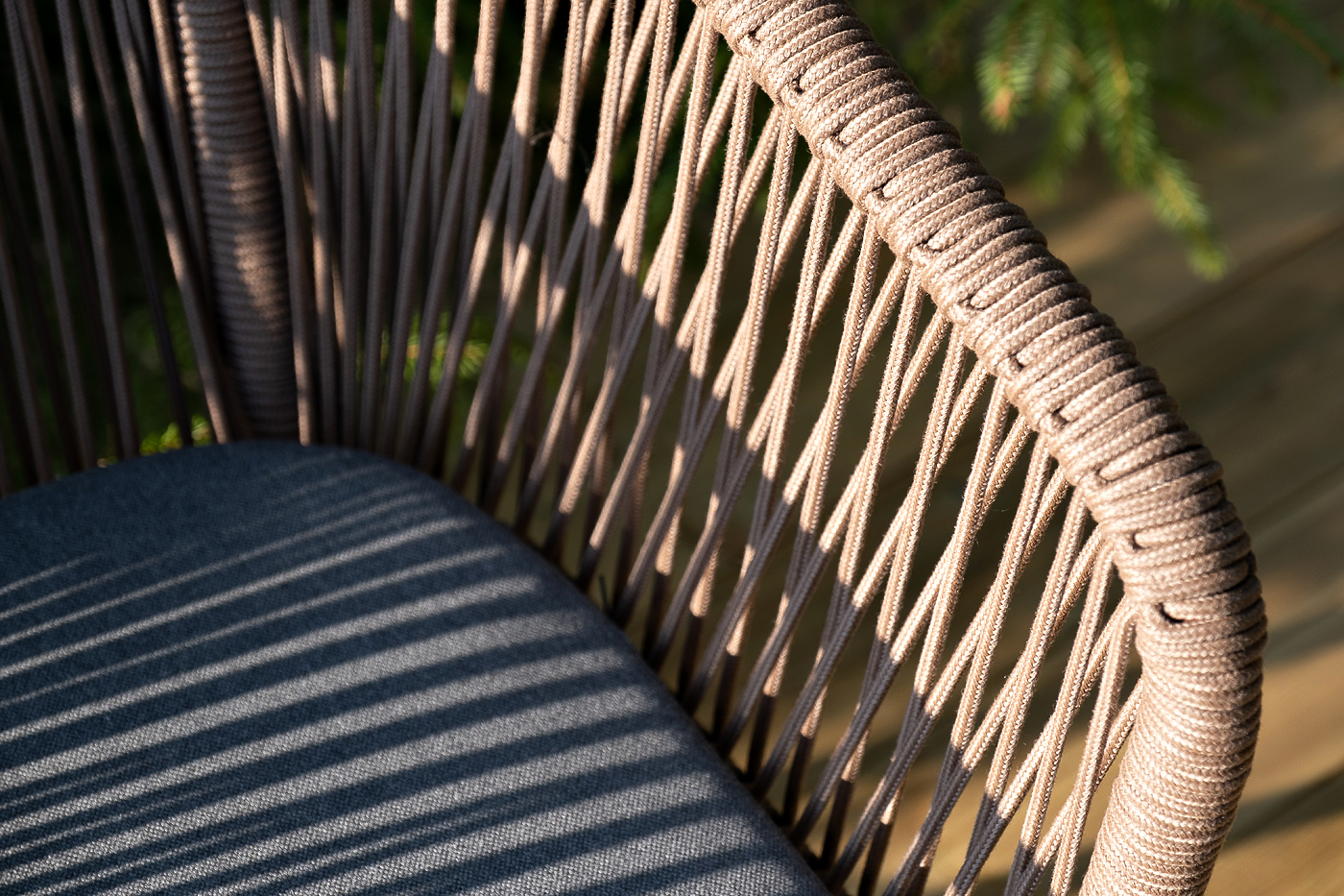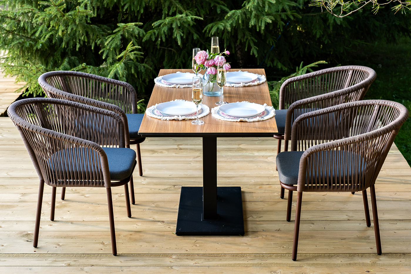 4 кор. (стулья - "Каффе" обеденный стол из HPL 140х70см, цвет "дуб", подстолье двойное черное 1шт. 1 400Х700Х750, "Марсель" стул плетеный из роупа, каркас алюминий коричневый (RAL8016) муар, роуп коричневый круглый, ткань темно-серая 027 4шт. 570Х620Х775,