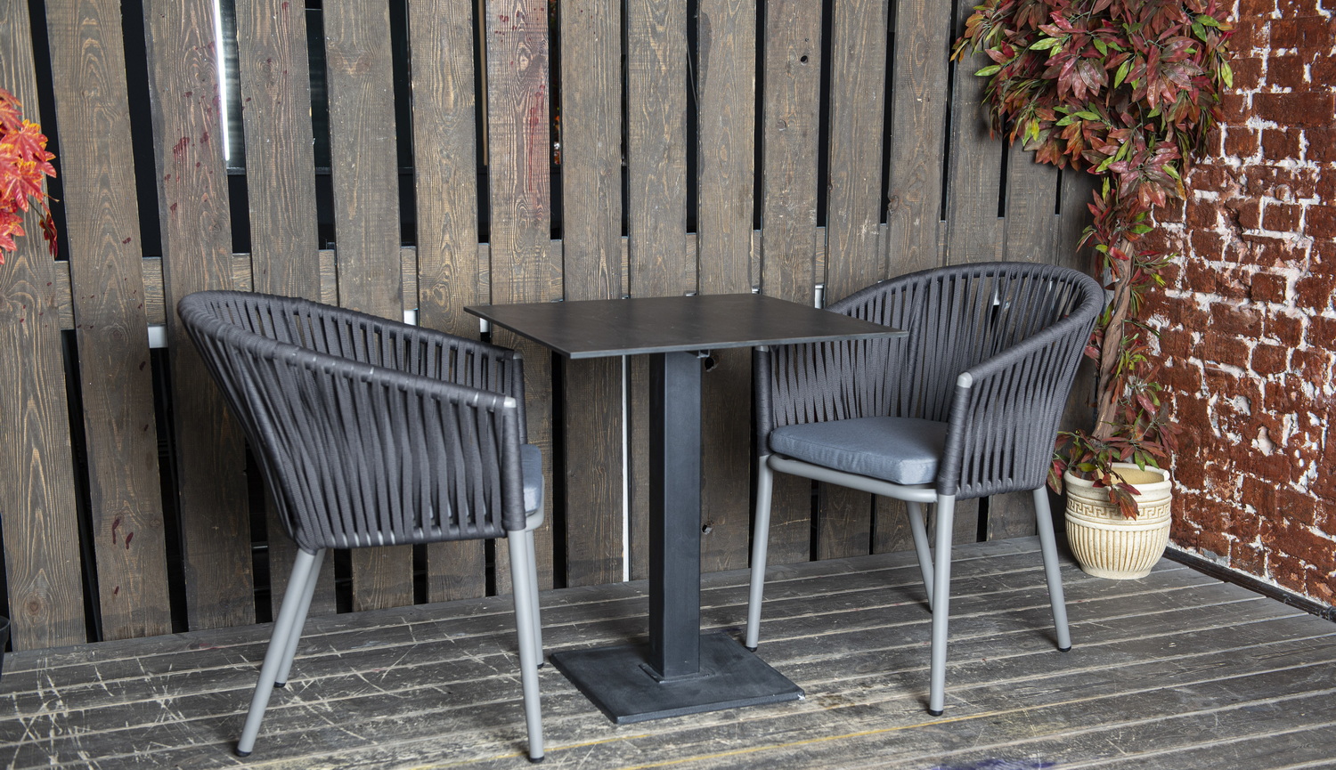 Столешница выполнена из современного полимерного компакт-пластиком HPL, толщиной 12 мм, в цвете «cерый гранит». Этот материал устойчив к высоким температурам (можно ставить горячую посуду), пролитой жидкости, не требует специального ухода. Подстолье изготовлено из чугуна черного цвета, с рамкой для крепления столешницы и широким основанием 400×400 мм. Благодаря чему столик очень устойчив на любых поверхностях.