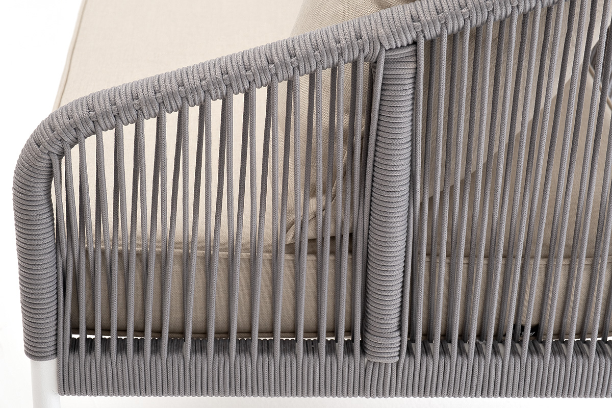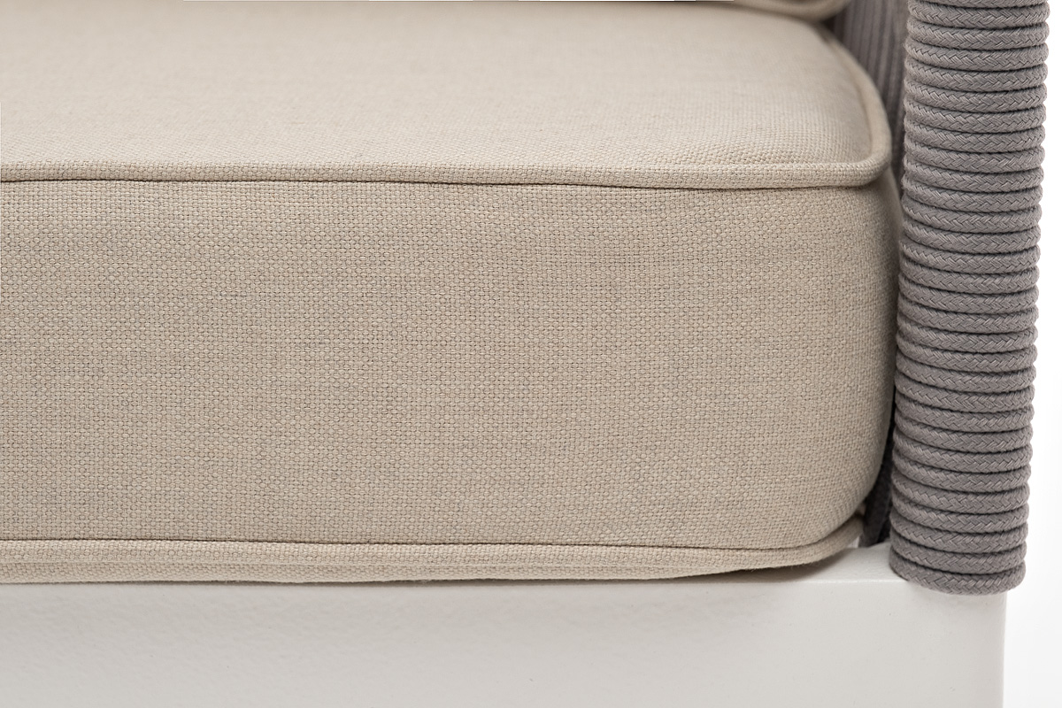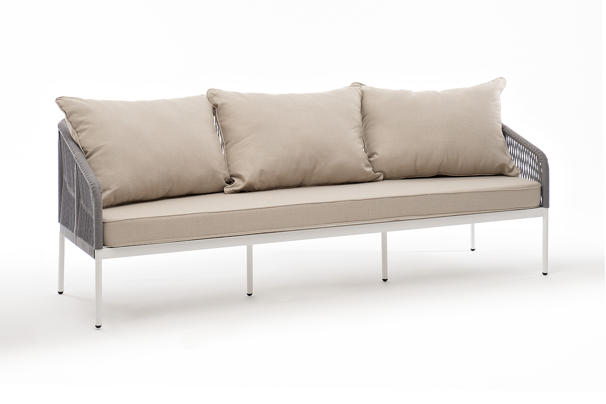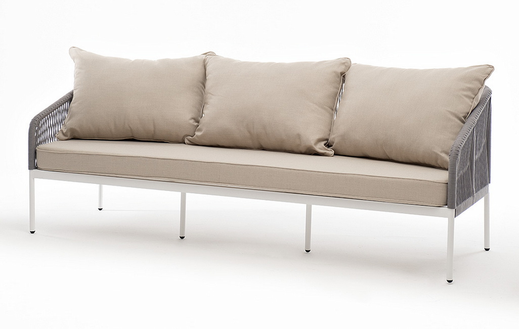 Диван имеет алюминиевый каркас, окрашенный порошковой краской в белый цвет. Боковины каркаса и спинка вручную оплетены роупом - эластичными синтетическими лентами, изготовленными из высокопрочных полиэфирных волокон. Цвет оплетки - светло-серый.