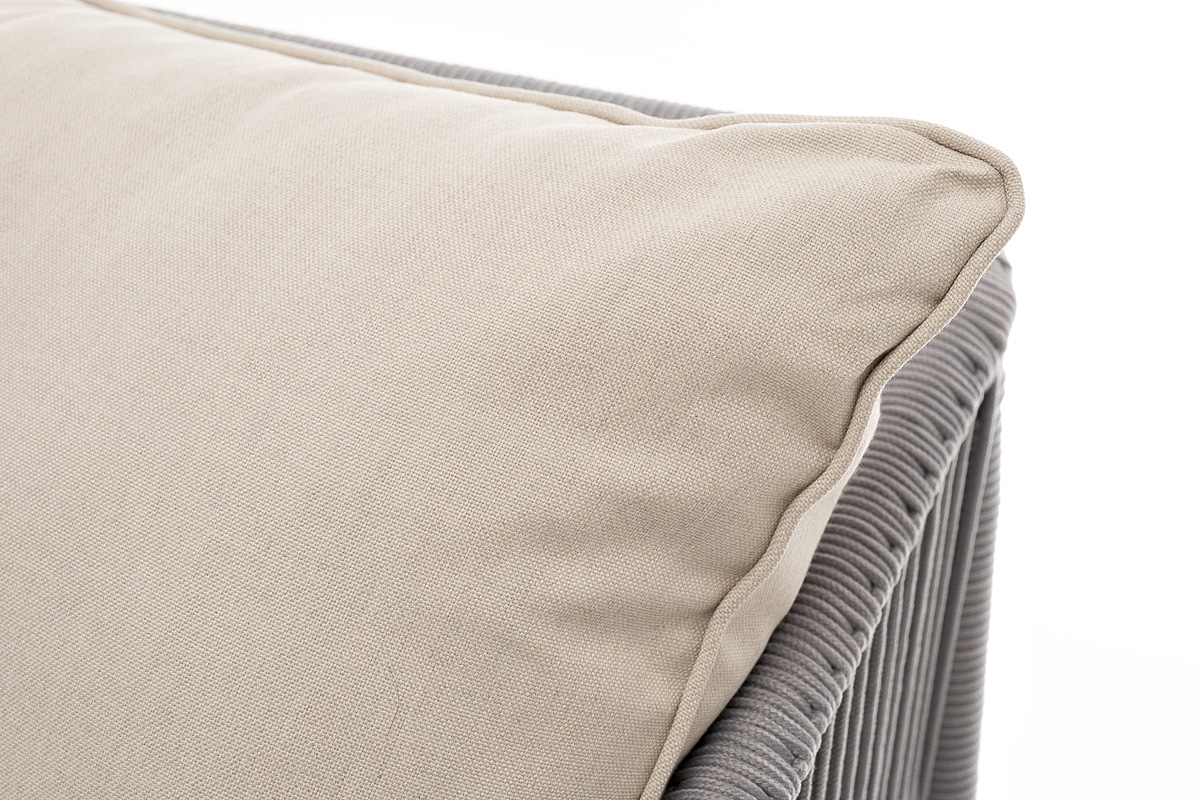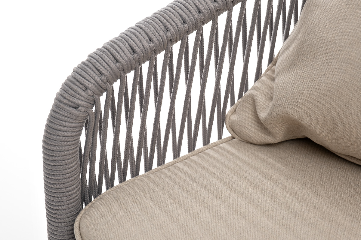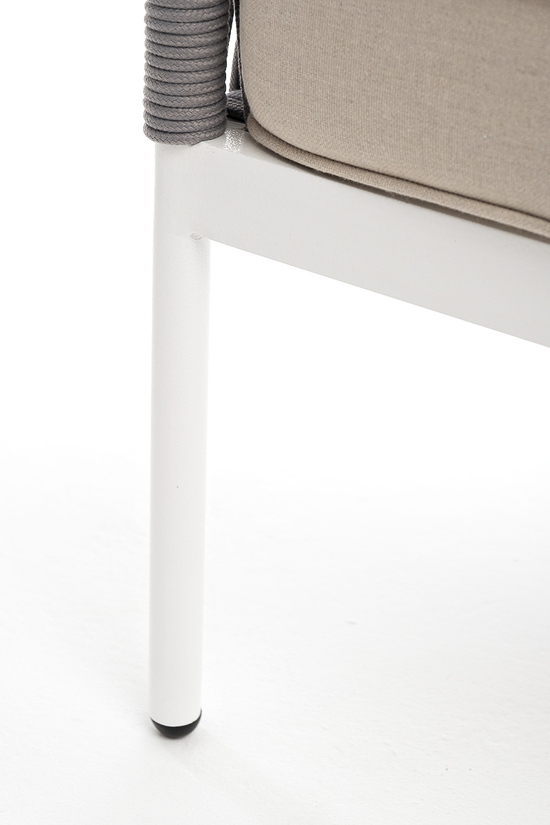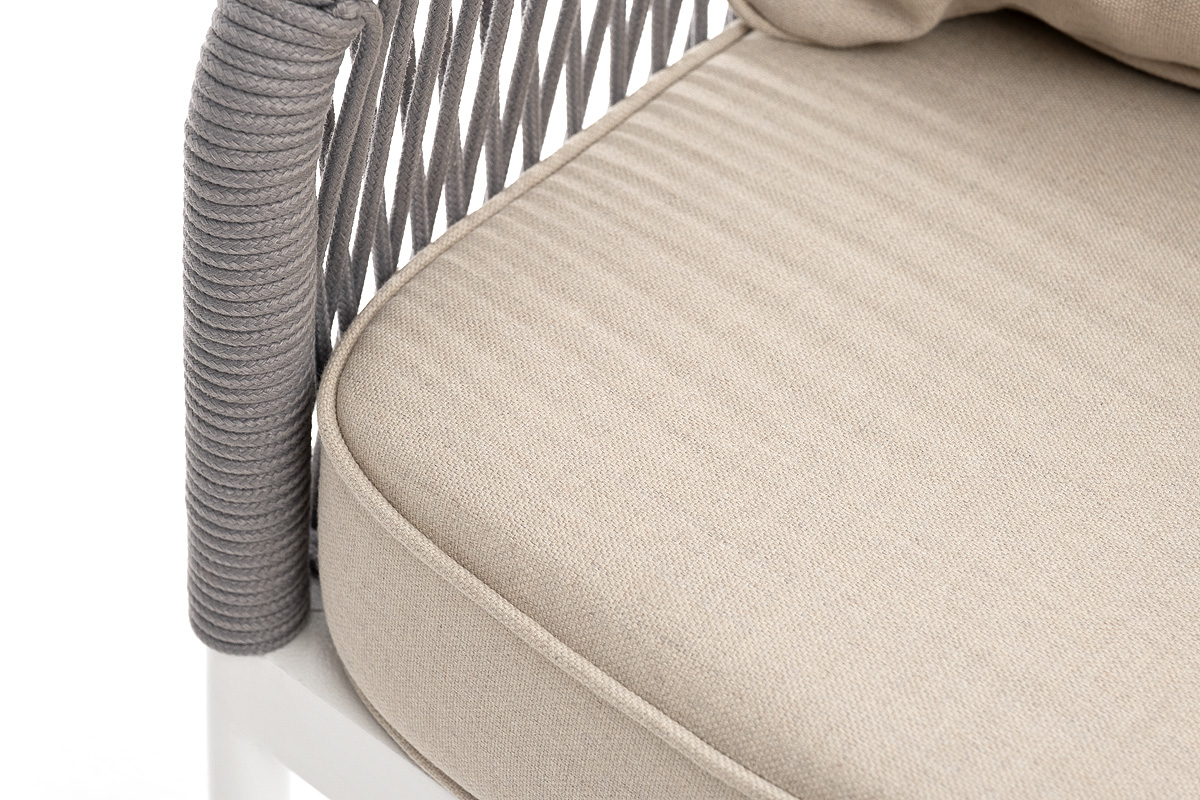 Диван имеет алюминиевый каркас, окрашенный порошковой краской в белый цвет. Боковины каркаса и спинка вручную оплетены роупом - эластичными синтетическими лентами, изготовленными из высокопрочных полиэфирных волокон. Цвет оплетки - светло-серый.