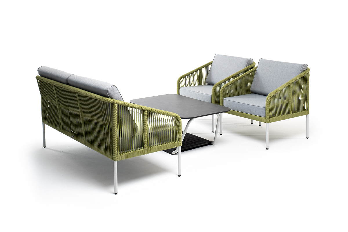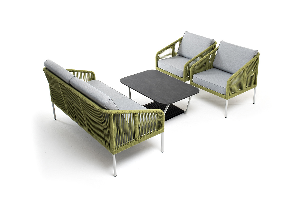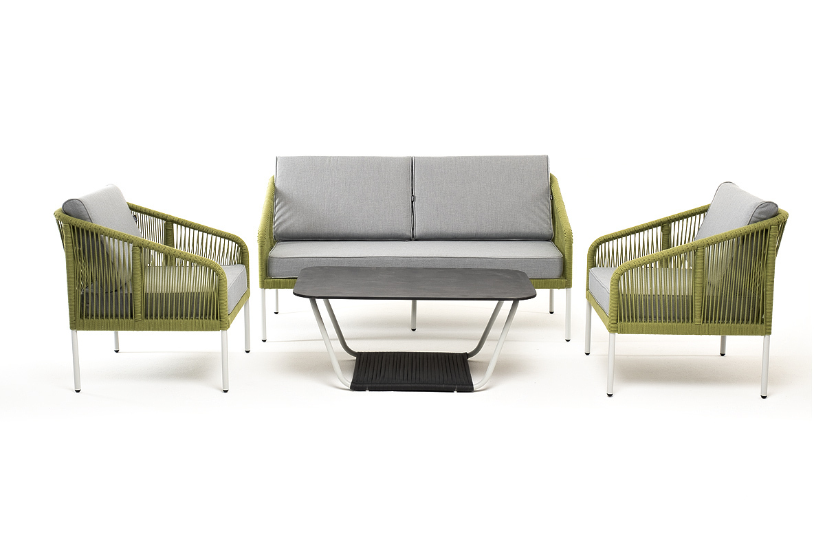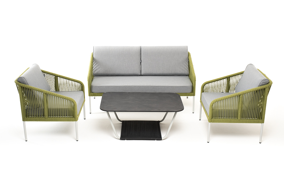 Кресла и диван идут в комплекте с мягкими подушками в чехлах светло-серого цвета. "Глория" журнальный стол 90х60см из HPL, цвет "серый гранит" 1шт. 900Х600Х420, "Канны" кресло плетеное из роупа, каркас алюминий светло-серый (RAL7035) муар, роуп салатовый меланж круглый, ткань светло-серая 2шт. 700Х700Х750, "Канны" диван 2-местный плетеный из роупа, каркас алюминий светло-серый (RAL7035) муар, роуп салатовый меланж круглый, ткань светло-серая 1шт. 1 500Х700Х750,