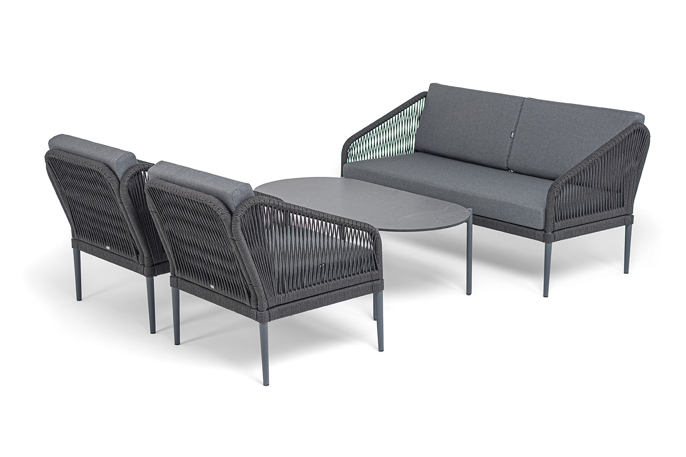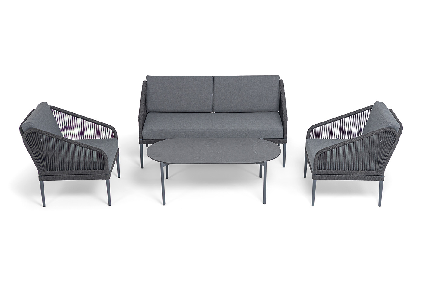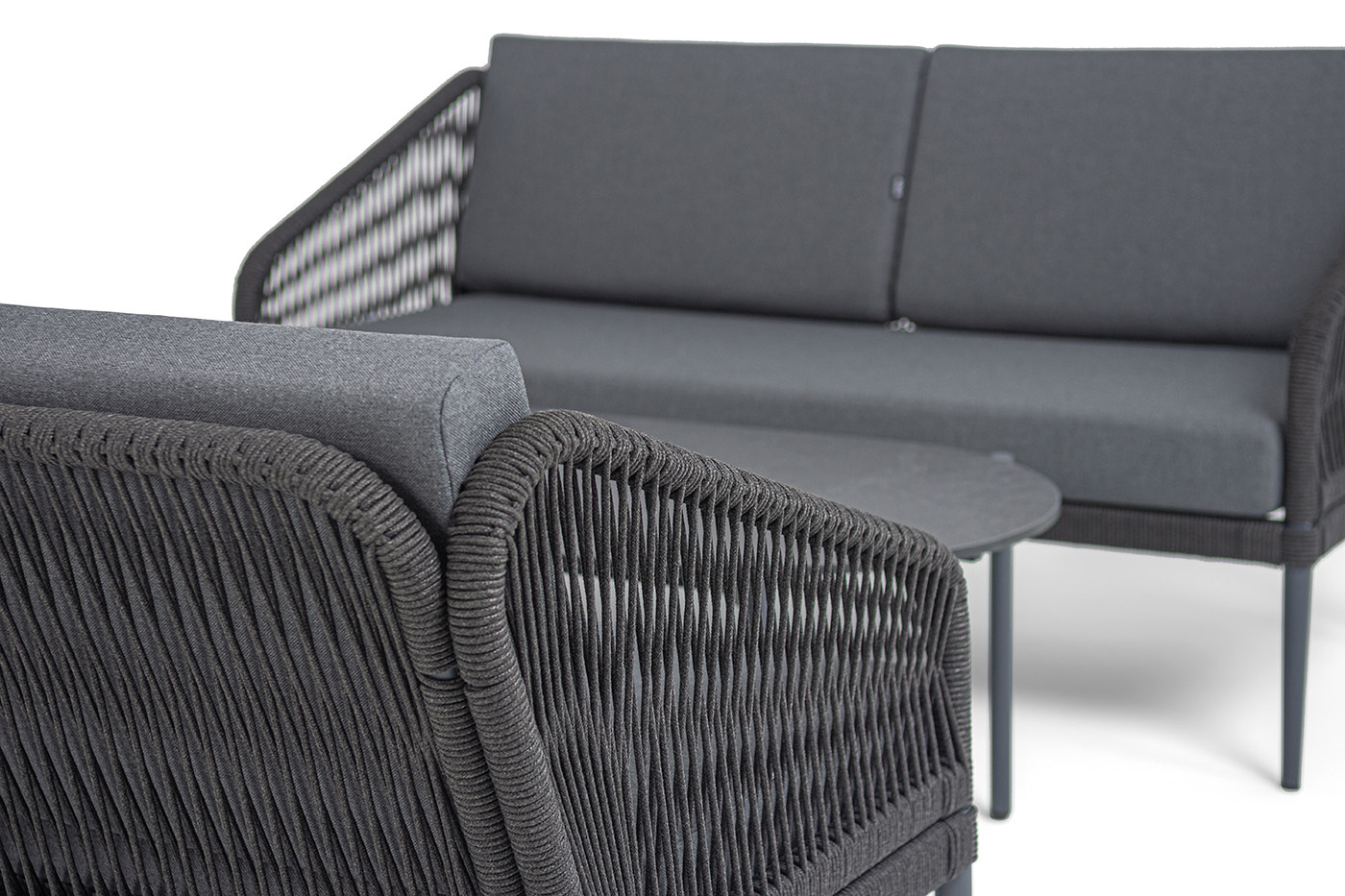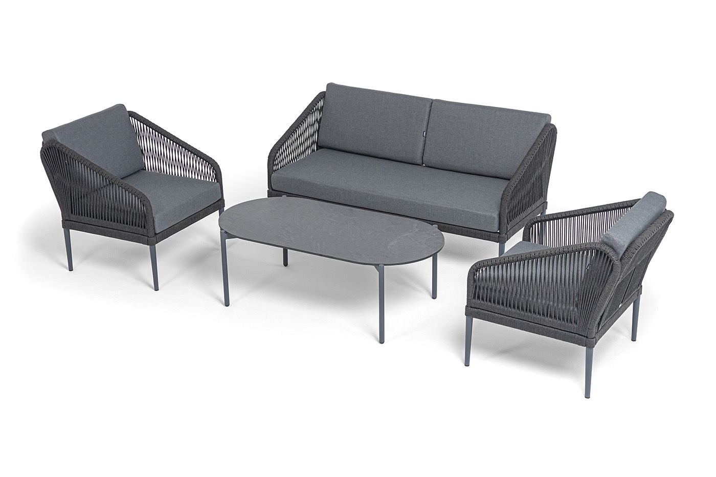 Каркас мебели изготовлен из алюминия, а боковины кресел и дивана оплетены темно‑серыми синтетическими лентами из высокопрочных полиэфирных волокон.
