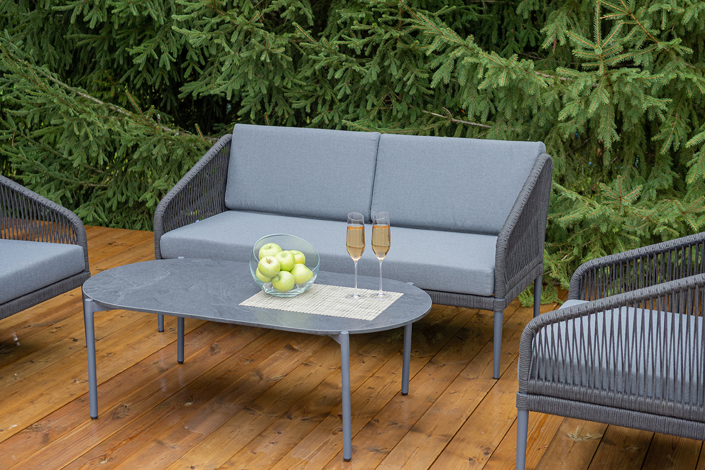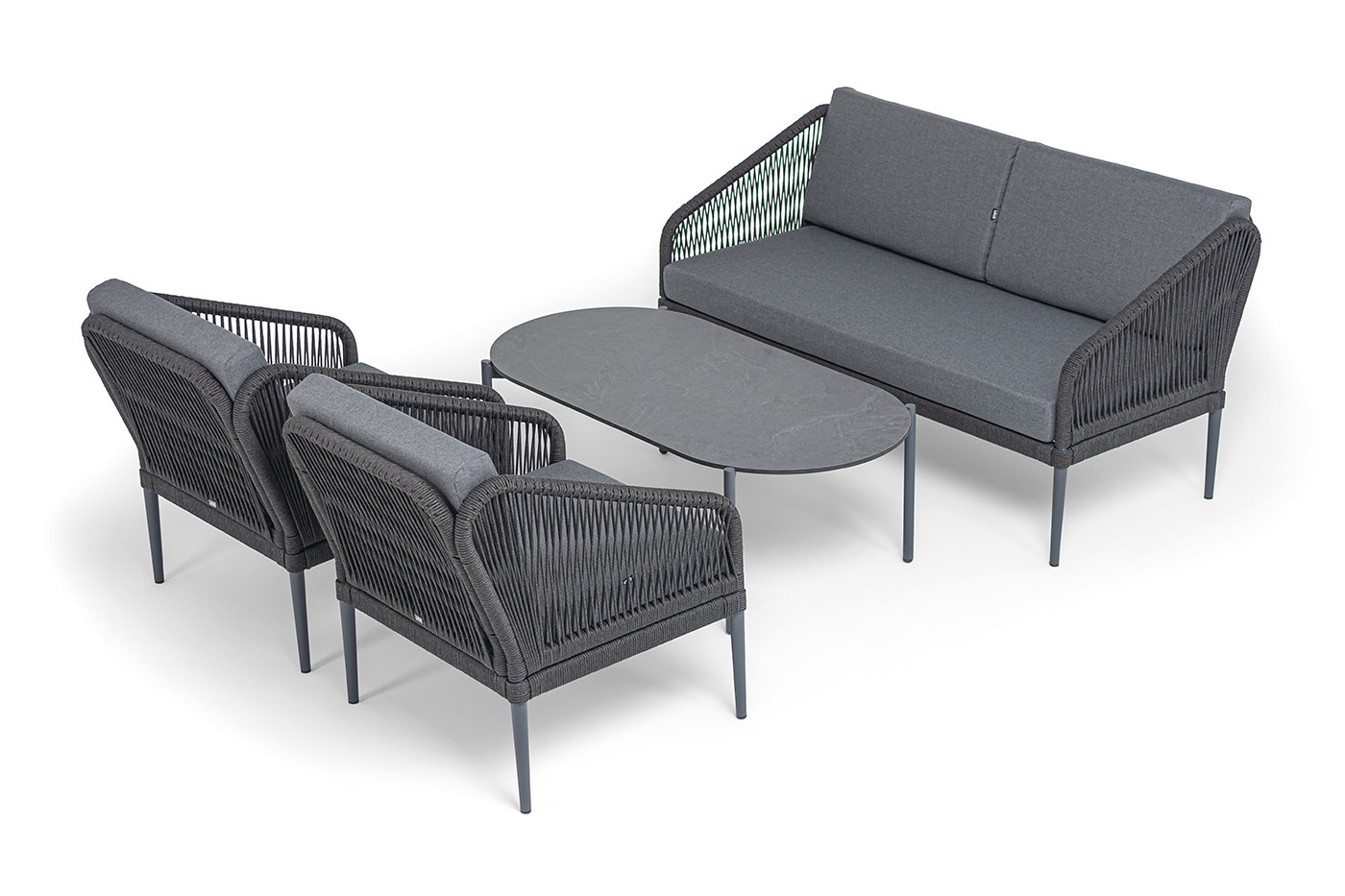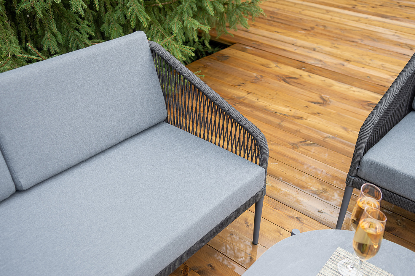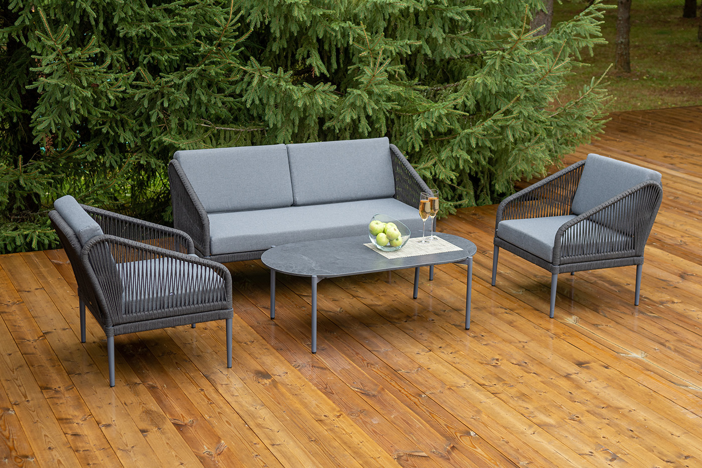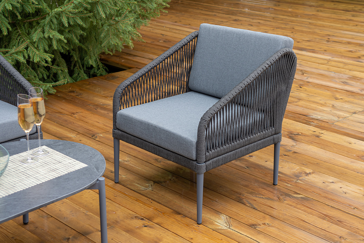 Каркас мебели изготовлен из алюминия, а боковины кресел и дивана оплетены темно‑серыми синтетическими лентами из высокопрочных полиэфирных волокон.