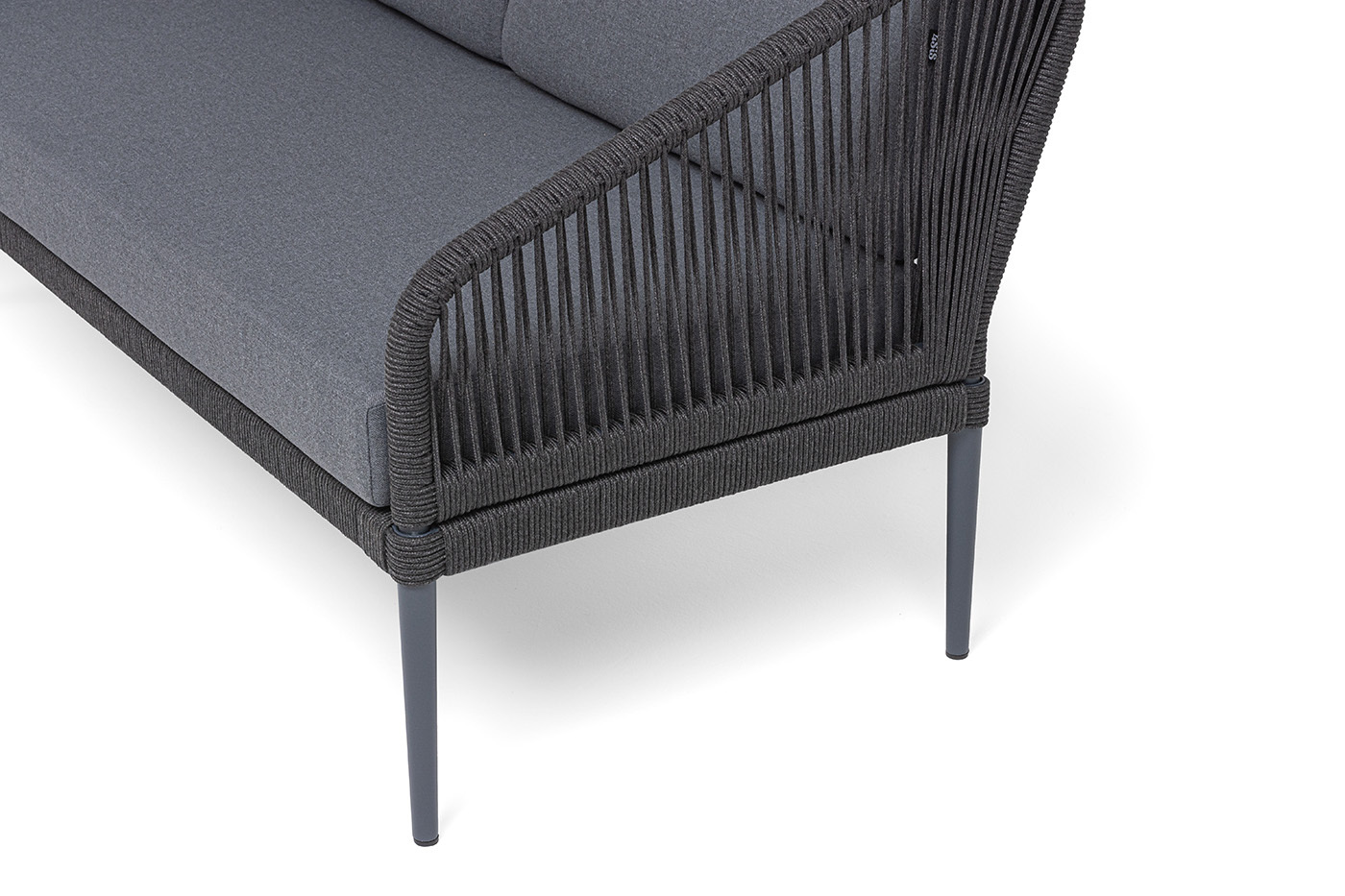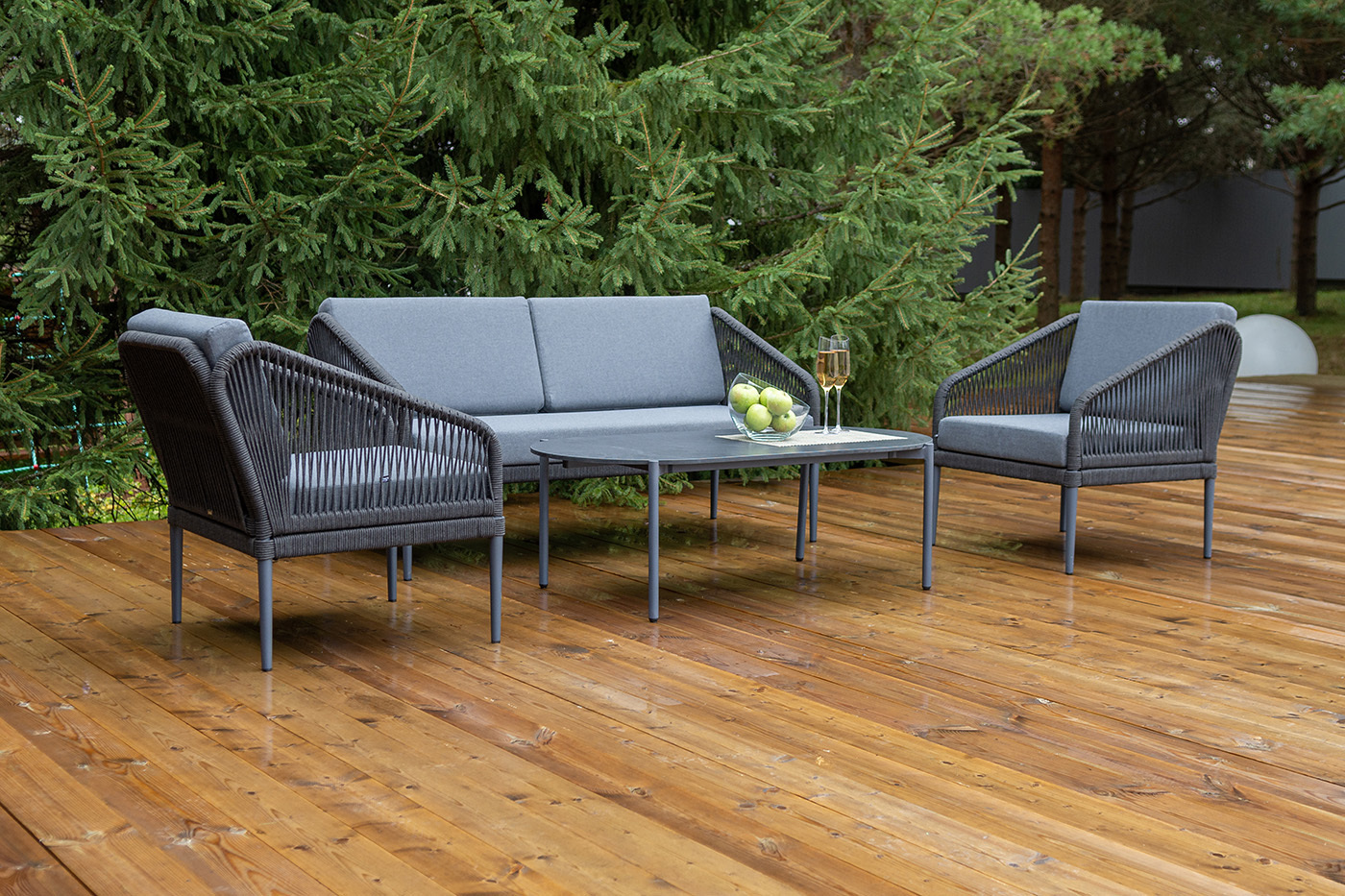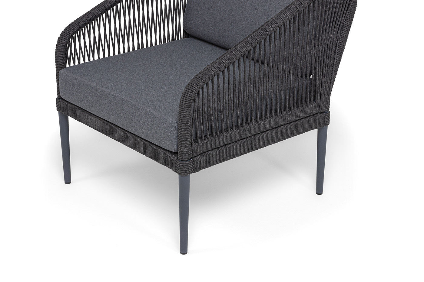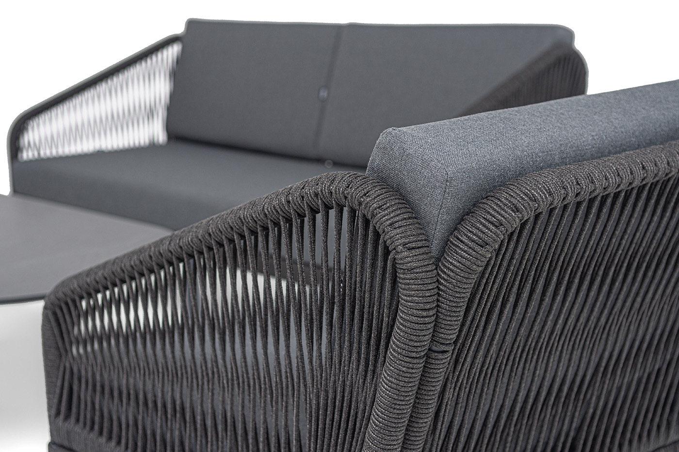 Каркас мебели изготовлен из алюминия, а боковины кресел и дивана оплетены темно‑серыми синтетическими лентами из высокопрочных полиэфирных волокон.