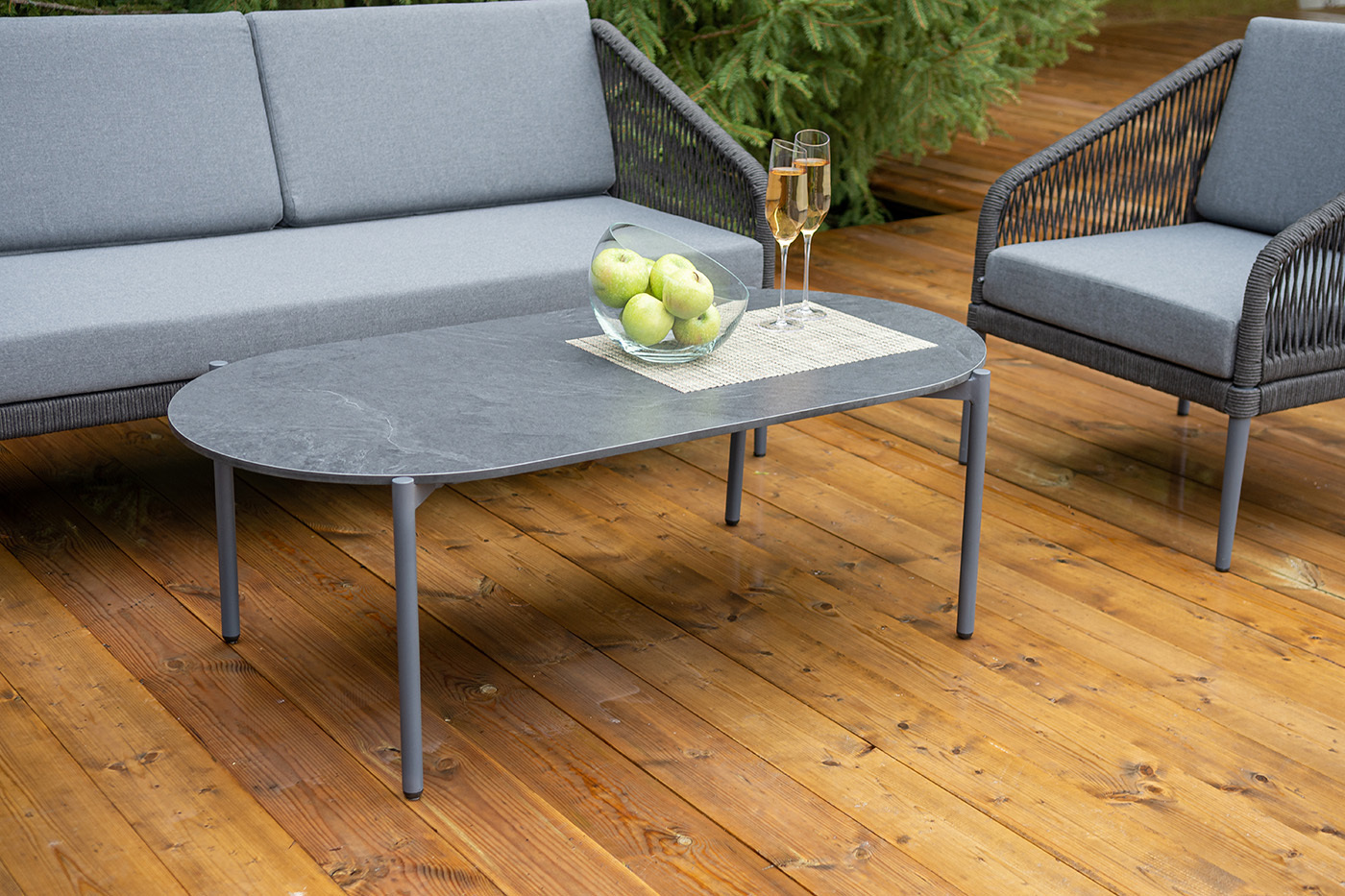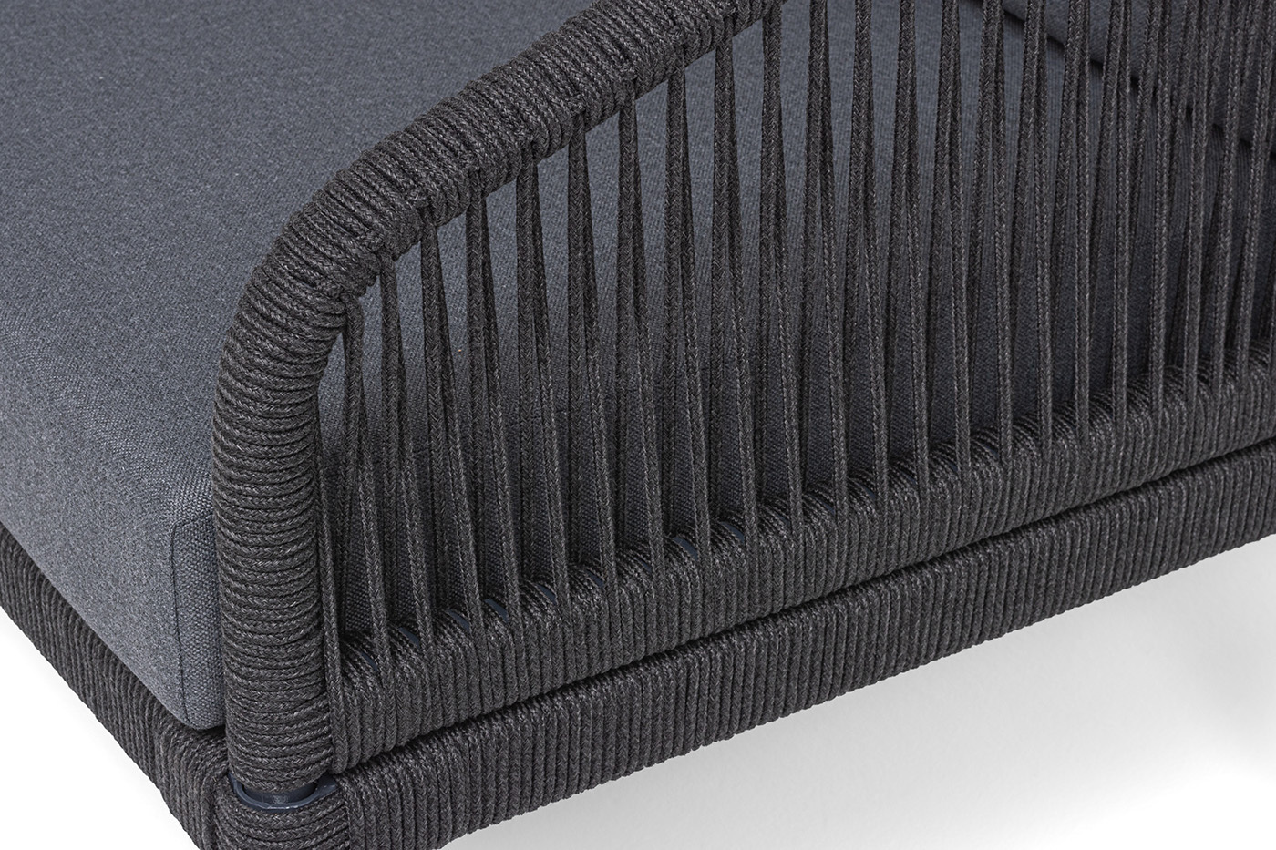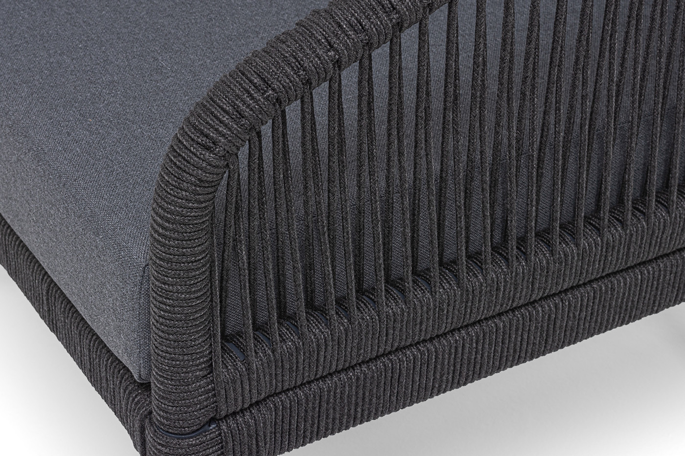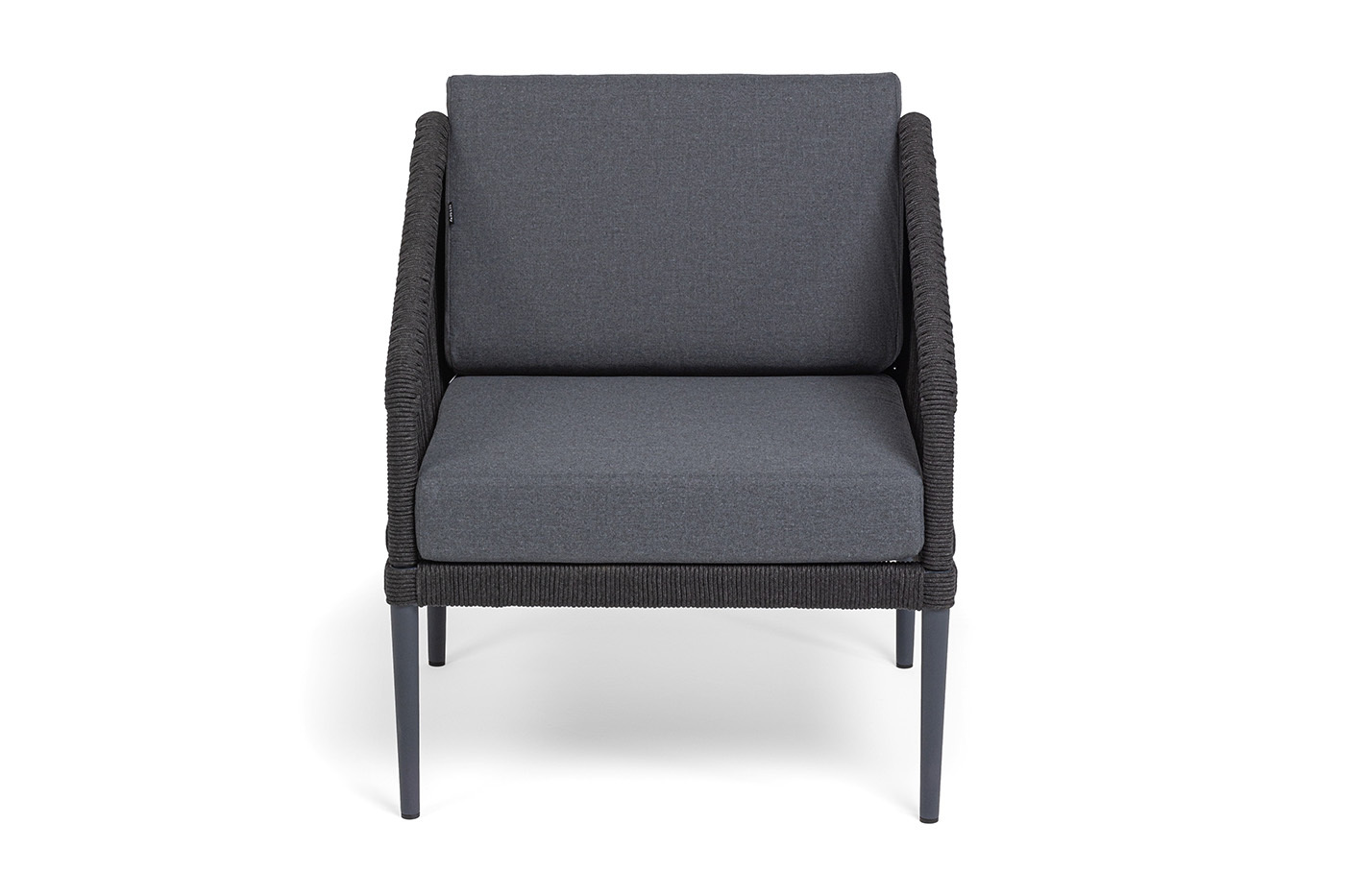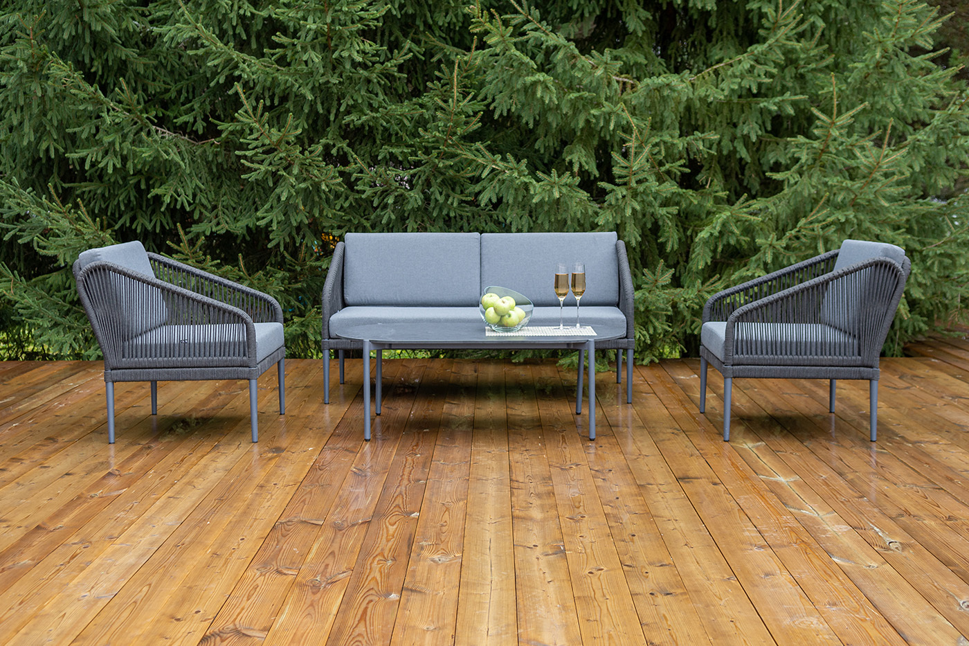 Каркас мебели изготовлен из алюминия, а боковины кресел и дивана оплетены темно‑серыми синтетическими лентами из высокопрочных полиэфирных волокон.