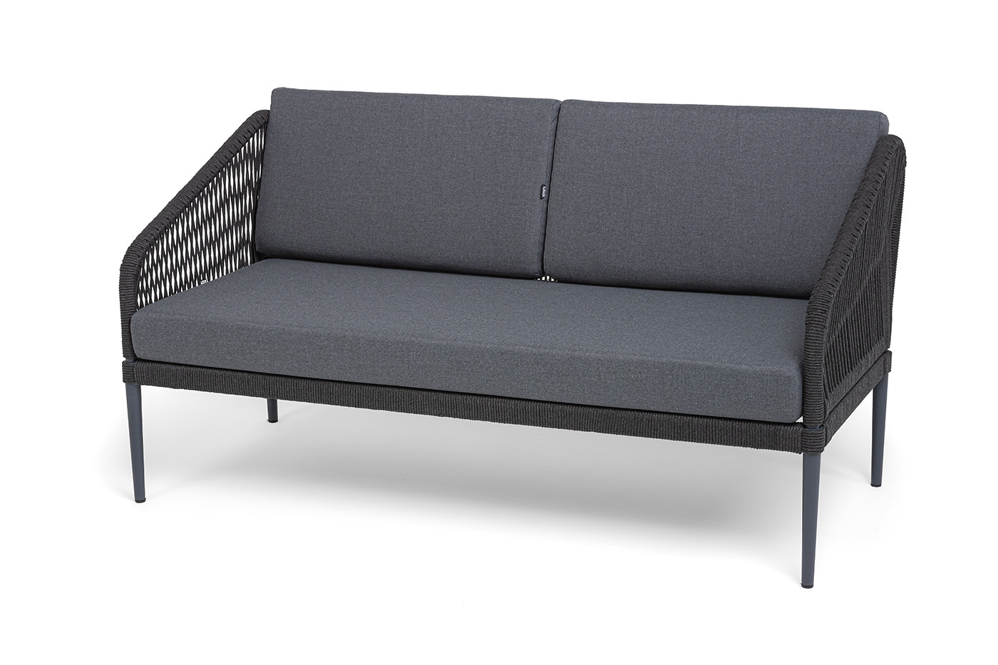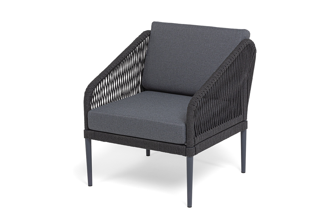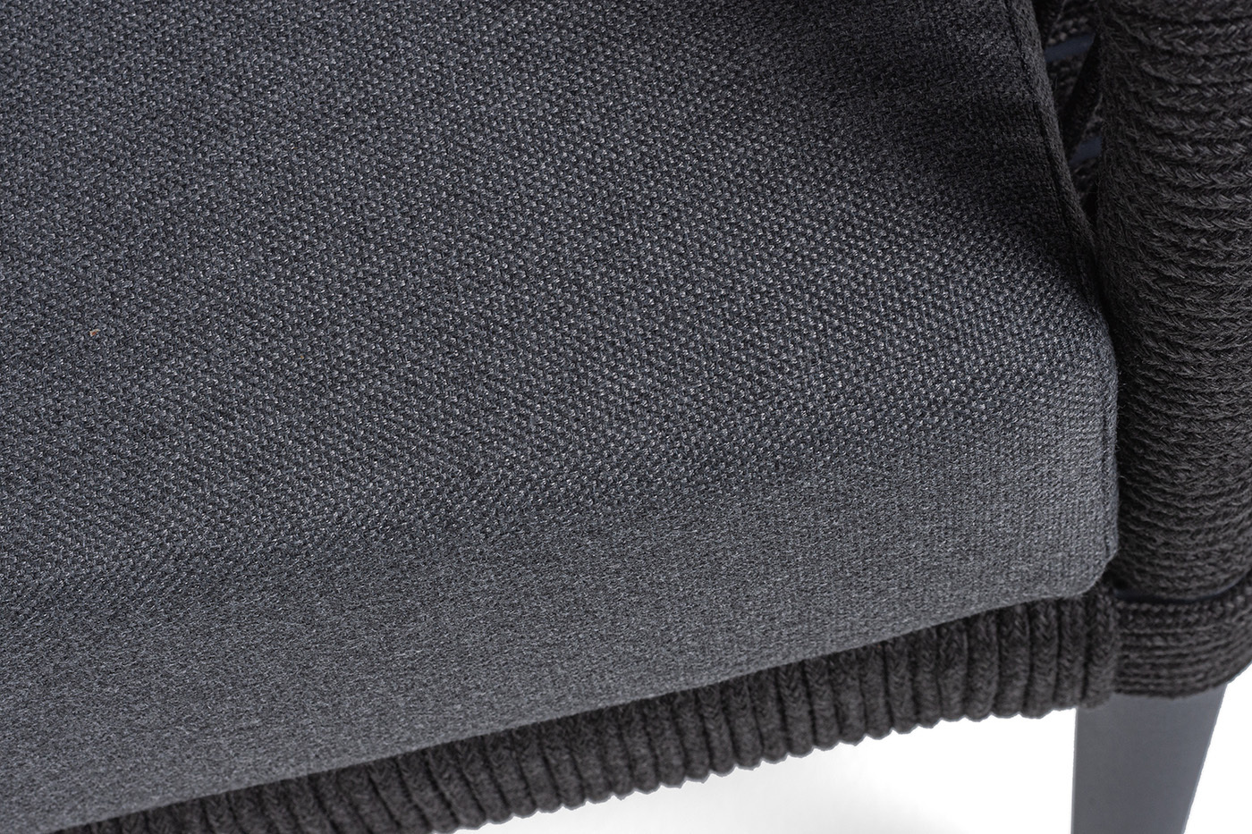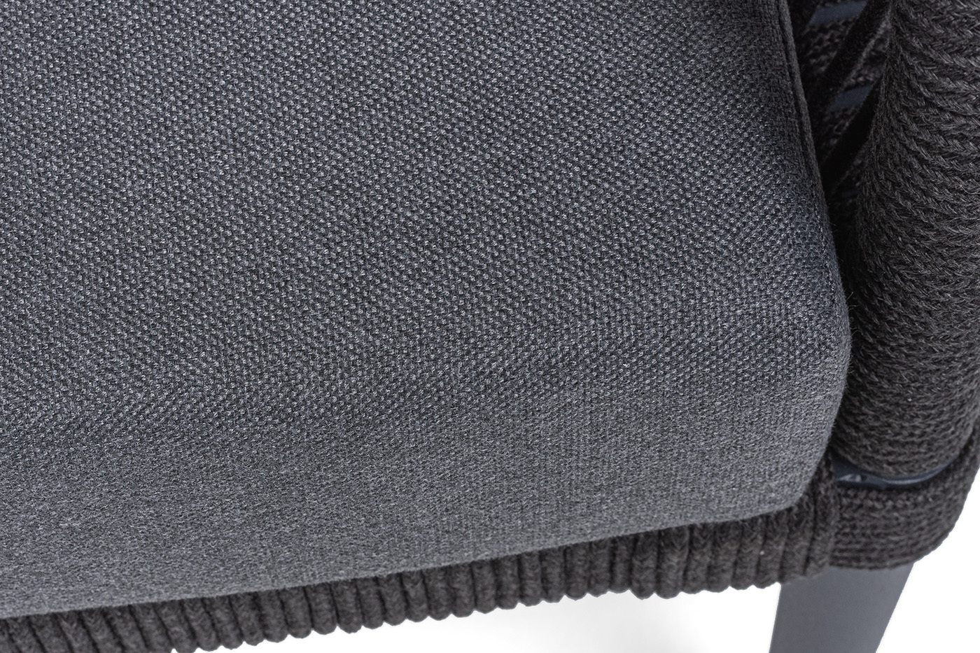 Каркас мебели изготовлен из алюминия, а боковины кресел и дивана оплетены темно‑серыми синтетическими лентами из высокопрочных полиэфирных волокон.