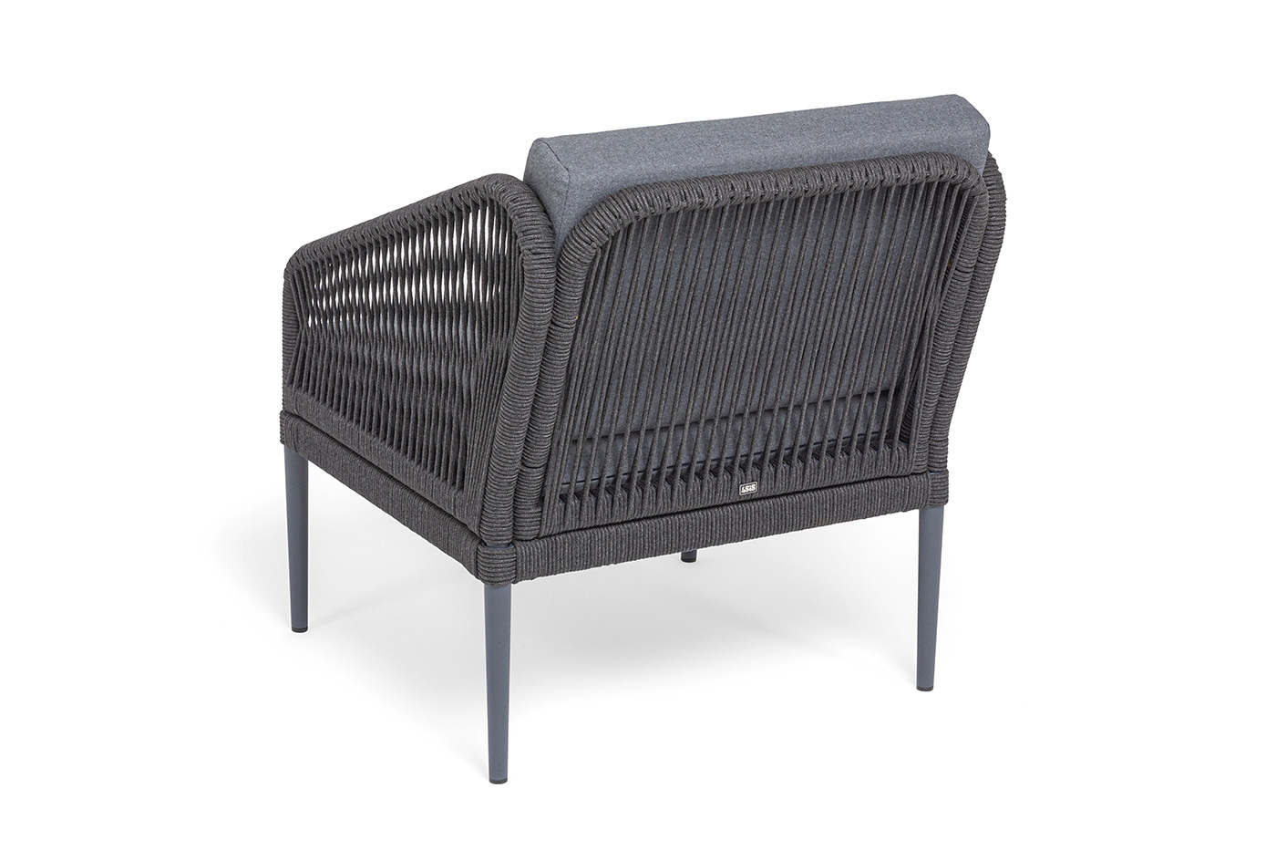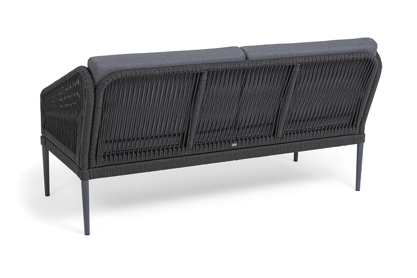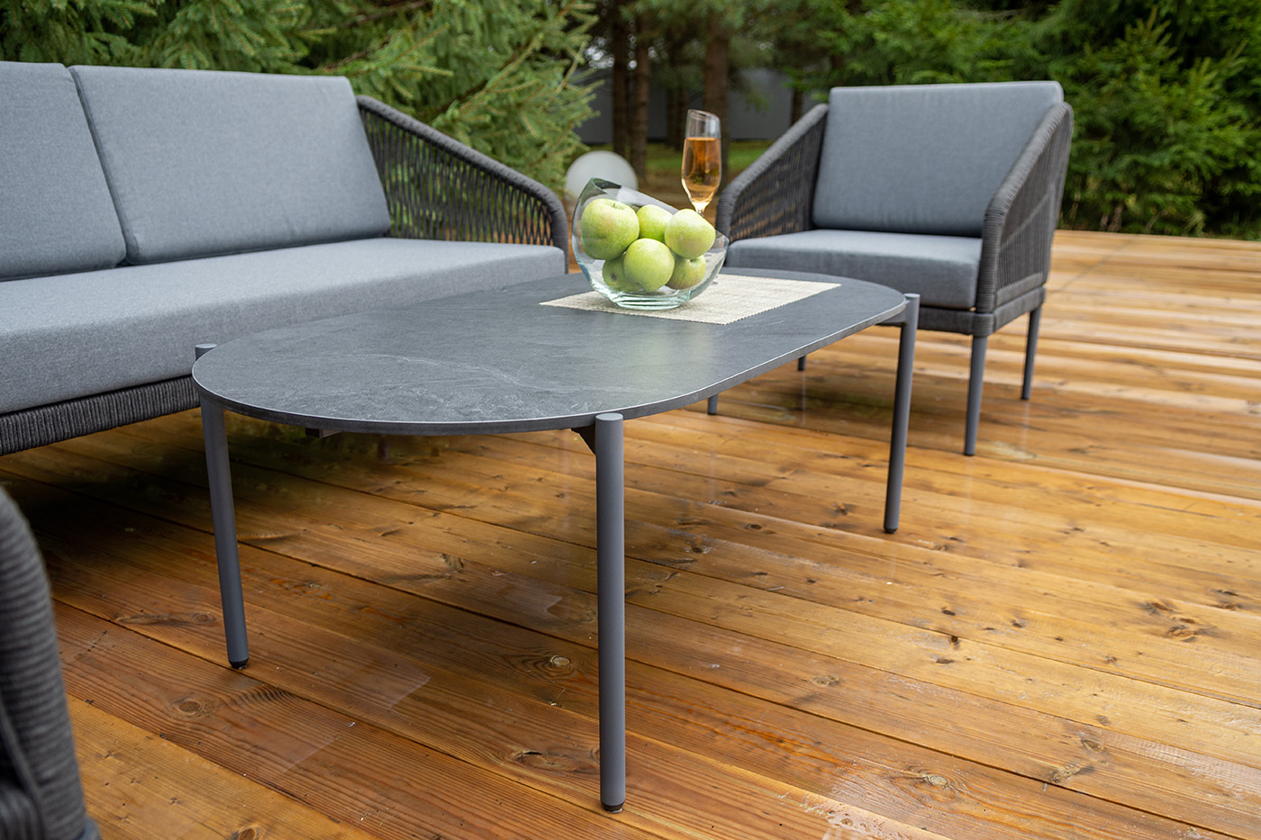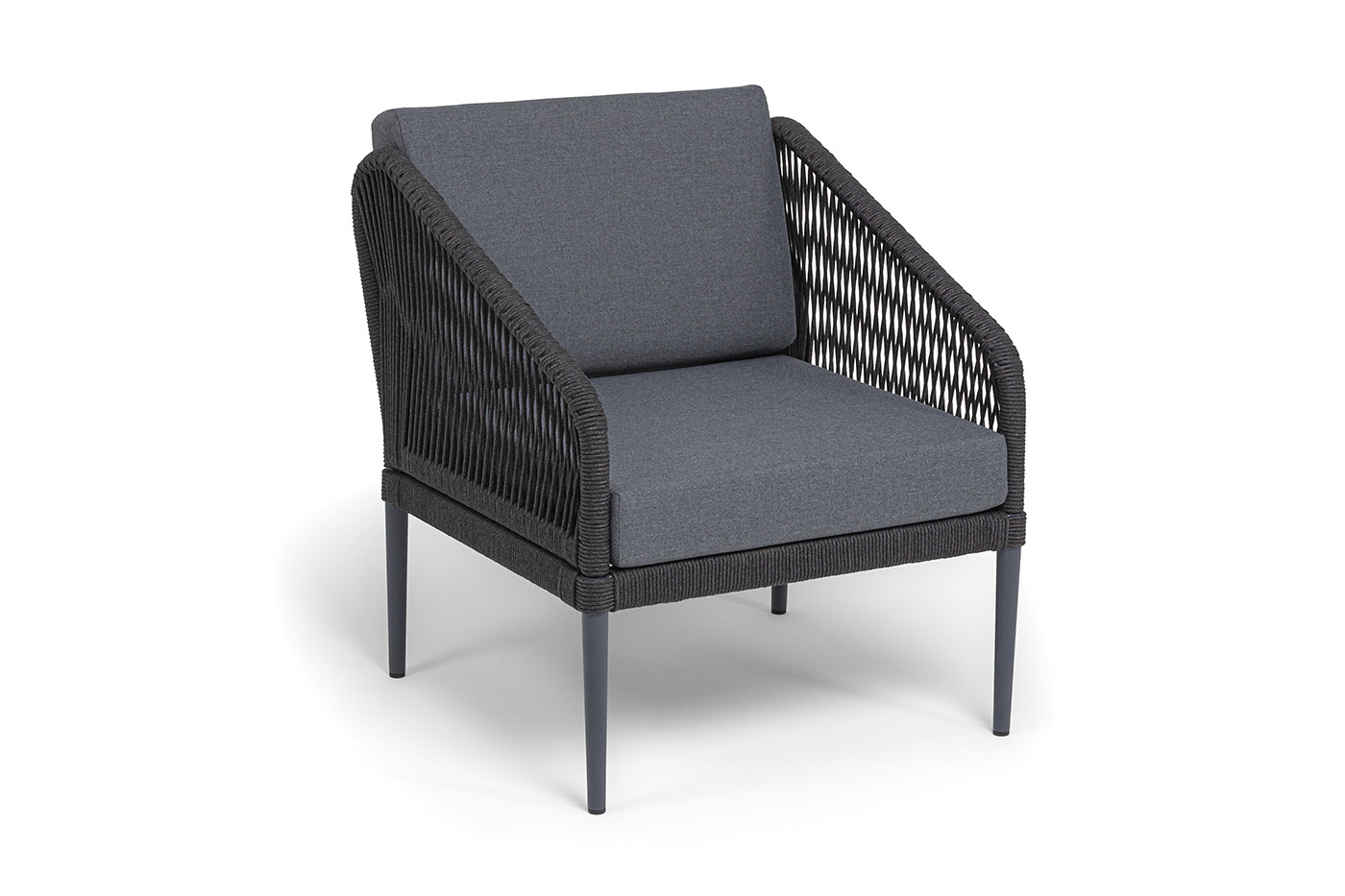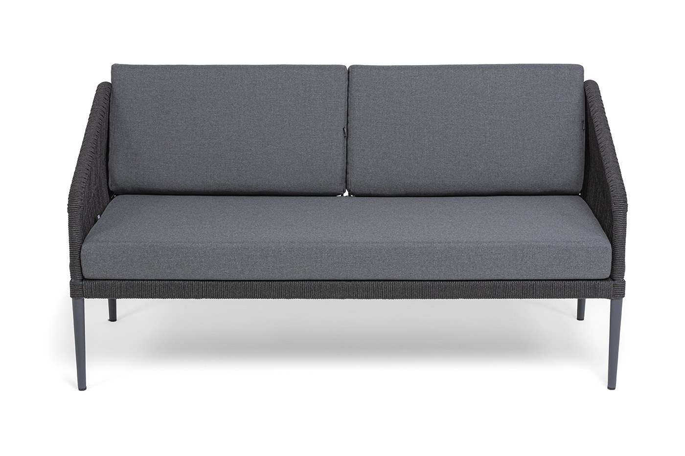 Каркас мебели изготовлен из алюминия, а боковины кресел и дивана оплетены темно‑серыми синтетическими лентами из высокопрочных полиэфирных волокон.