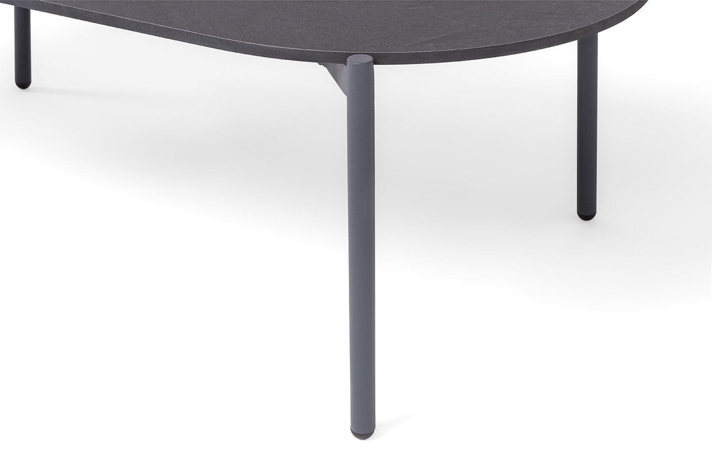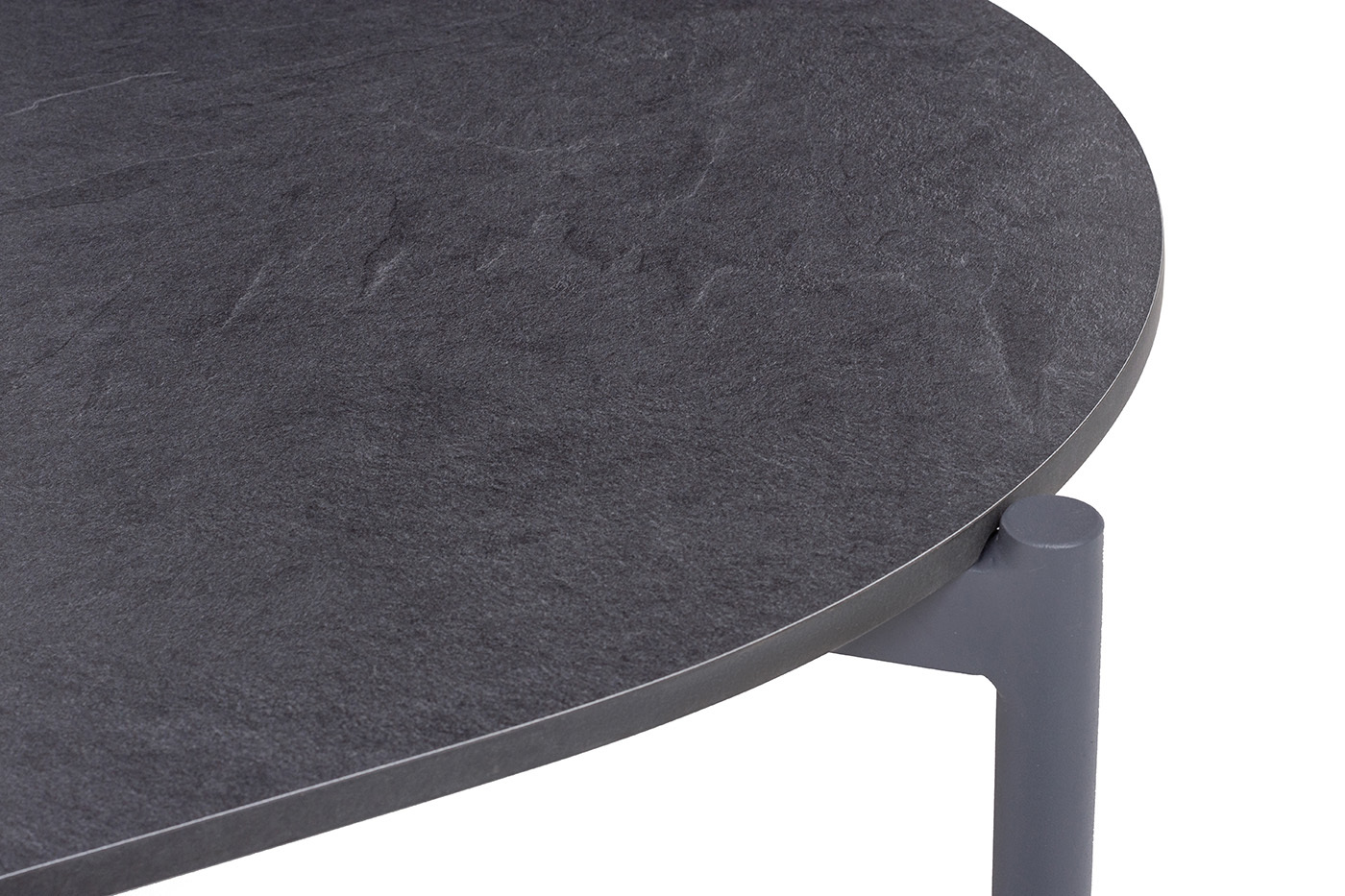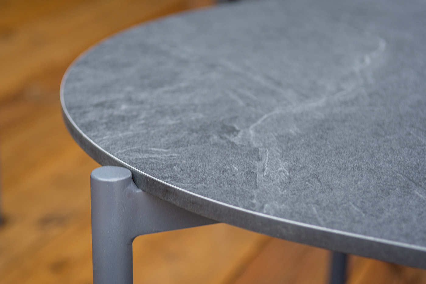 Столешница столика выполнена из монолитного компакт‑пластика HPL в оттенке «серый гранит» — материала, устойчивого к влаге, ультрафиолету и механическим повреждениям.