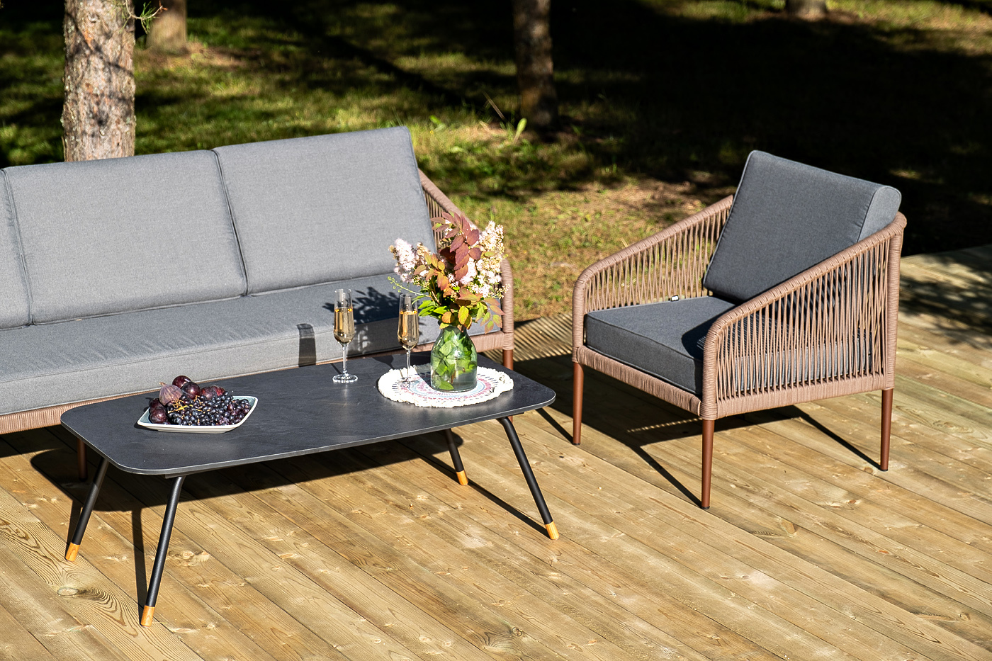 Кресла и диван идут в комплекте с мягкими подушками в чехлах темно-серого цвета. "Верона" журнальный стол из HPL 120х65, H40, каркас черный муар, цвет столешницы "серый гранит" 1шт. 1 200Х650Х400, "Канны" диван 3-местный плетеный из роупа, каркас алюминий коричневый (RAL8016) муар, роуп коричневый круглый, ткань темно-серая 027 1шт. 2 030Х700Х750, "Канны" кресло плетеное из роупа, каркас алюминий коричневый (RAL8016) муар, роуп коричневый круглый, ткань темно-серая 027 2шт. 700Х700Х750,